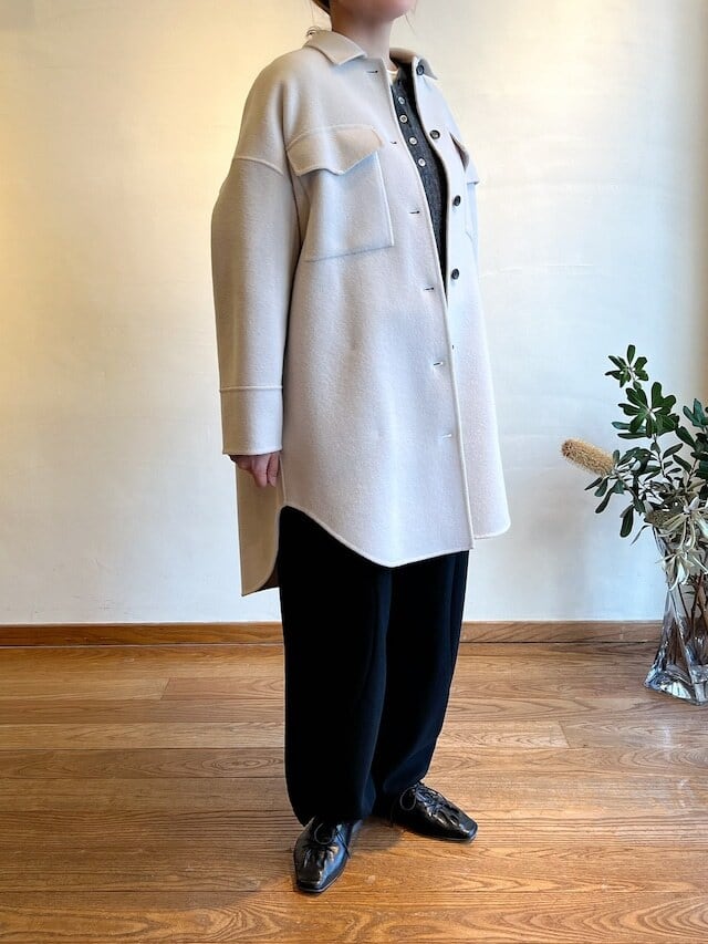 長めの丈感がお洒落なシャツコート、裏地の無いコートなのでシャツカーディガンの様に気軽に羽織れるのが嬉しいポイント。柔らかなウール素材を使用することで、シンプルながらも存在感のあるデザインで、一枚で洒落感を演出できます。
