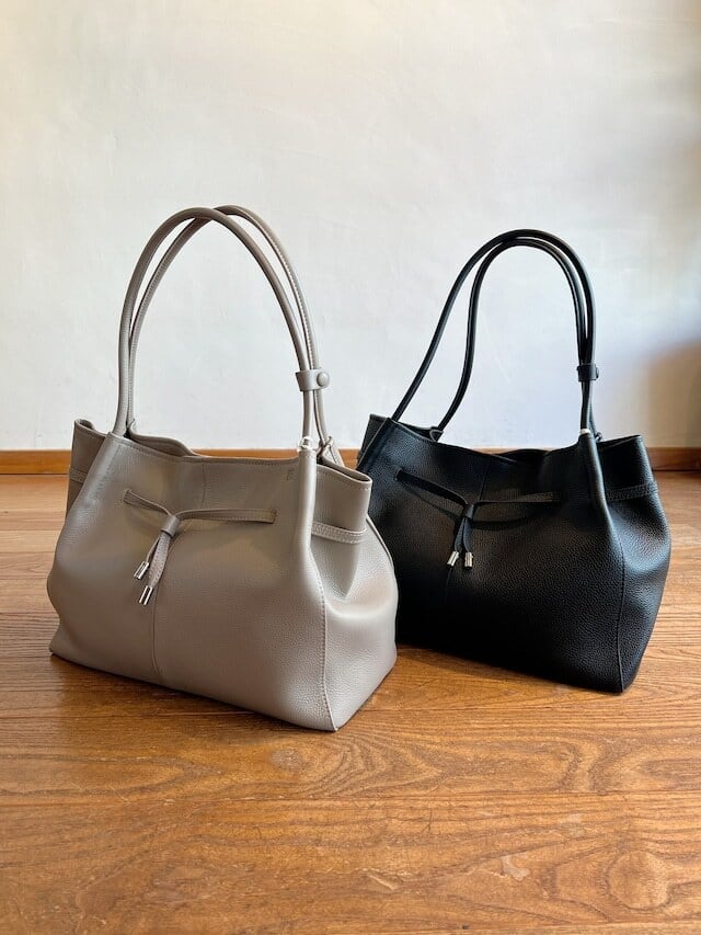 A4サイズやパソコンもすっぽり入る、ロングハンドルのトートバッグ。 ハンドルの間隔を広くとることで中央に落ち感がでて、シンプルながらも女性らしい雰囲気に。中央のコードを絞ることでシルエットが変更でき、カジュアルにも持っていただけます。