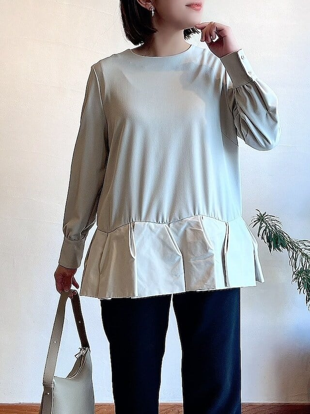 一枚で華やかさがあふれるデザイントップス。ウエーブ状に切り替えて立体的なフォルムをつくったギャザーペプラムが特徴で、ミドルヒップまでをカバーできる丈感もポイントです。