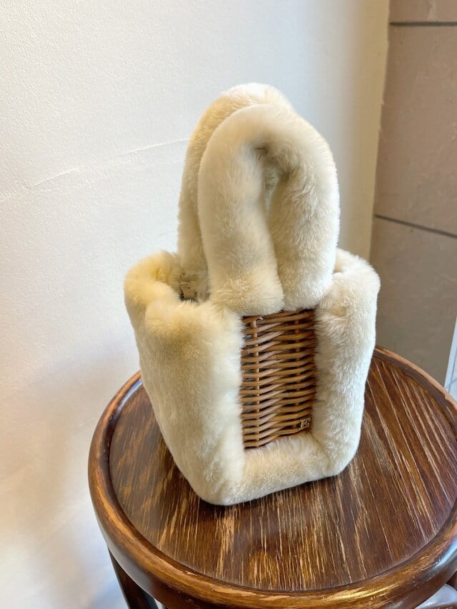 アクリル100%のエコファーと紅籐の組み合わせ。うさぎの耳のような持ち手を持つ手や手首が暖かいebagosののバッグ。
