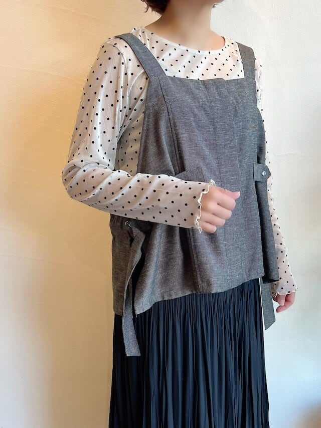 ビスチェのようにも使えるワークベスト。リサイクルポリエステルにレーヨンのしなやかさとリネンの風合いを活かした上質な素材を使用しています。シワになりにくく、さらっとした軽い着心地が特徴です。季節の変わり目に取り入れやすく、長いシーズンご愛用頂けます。自宅でお洗濯可能 ♪♪