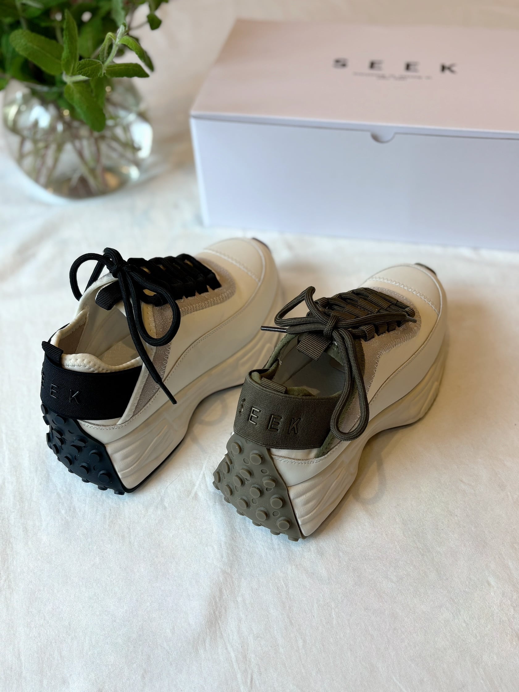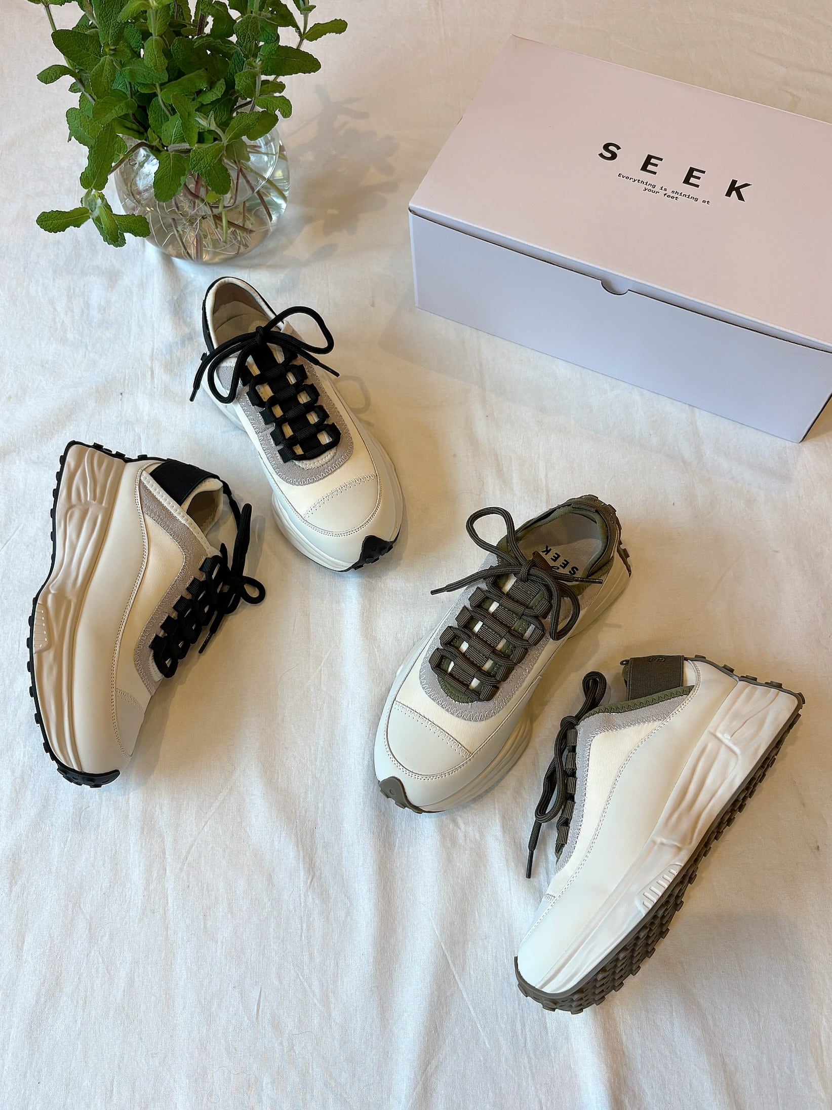 お洋服ブランド【Srieee(シュリ)】が提案するシューズブランド【SEEK(シーク)】厚底ソールがスタイルアップを叶えるスニーカー。厚底なのに非常に軽量で、クッション性が高く、スパイク風ソールが特徴的。ホワイトベースにカーキとブラックのレースアップやソールをアクセントにした、大人が使いやすい配色になっています。