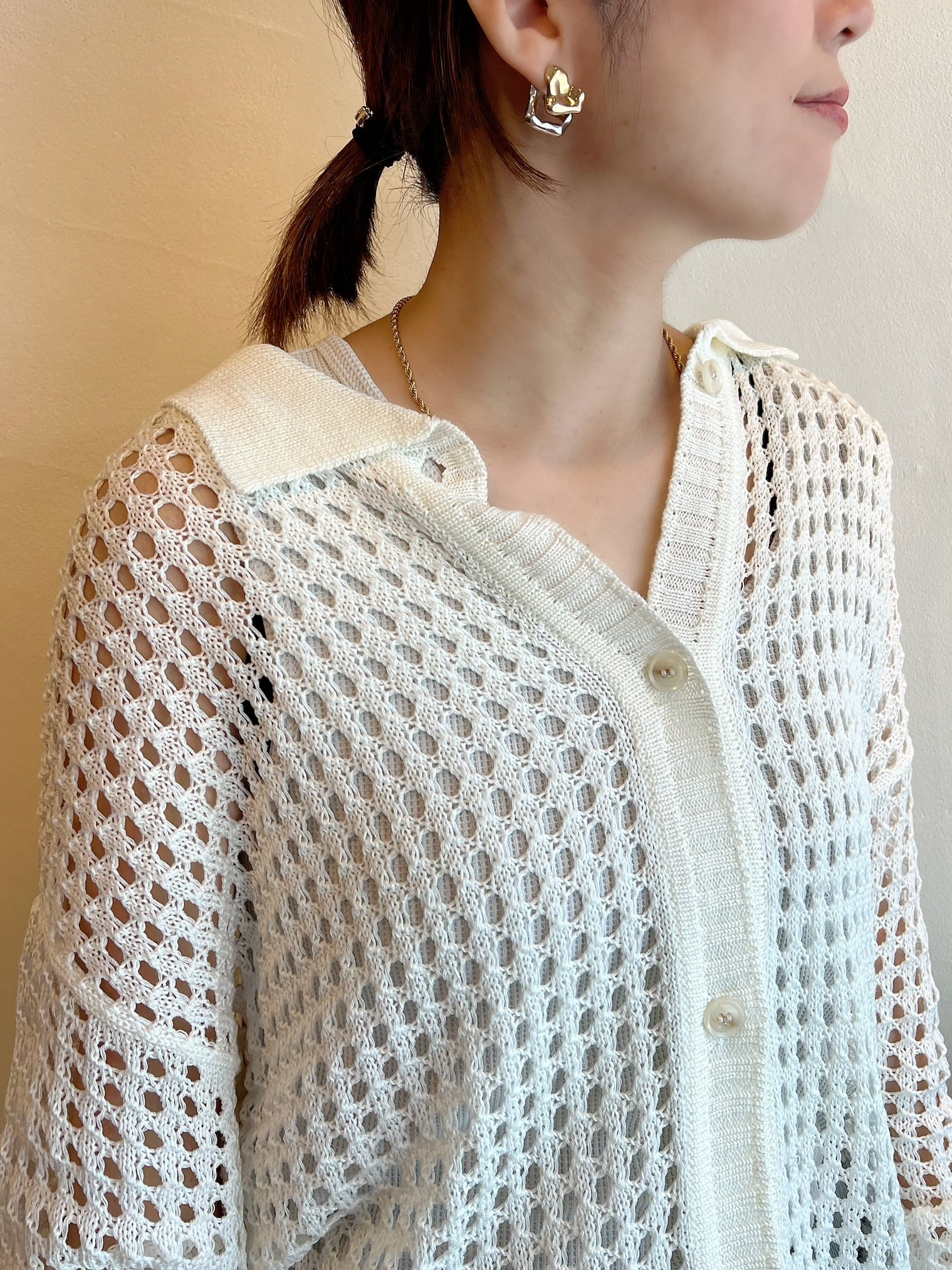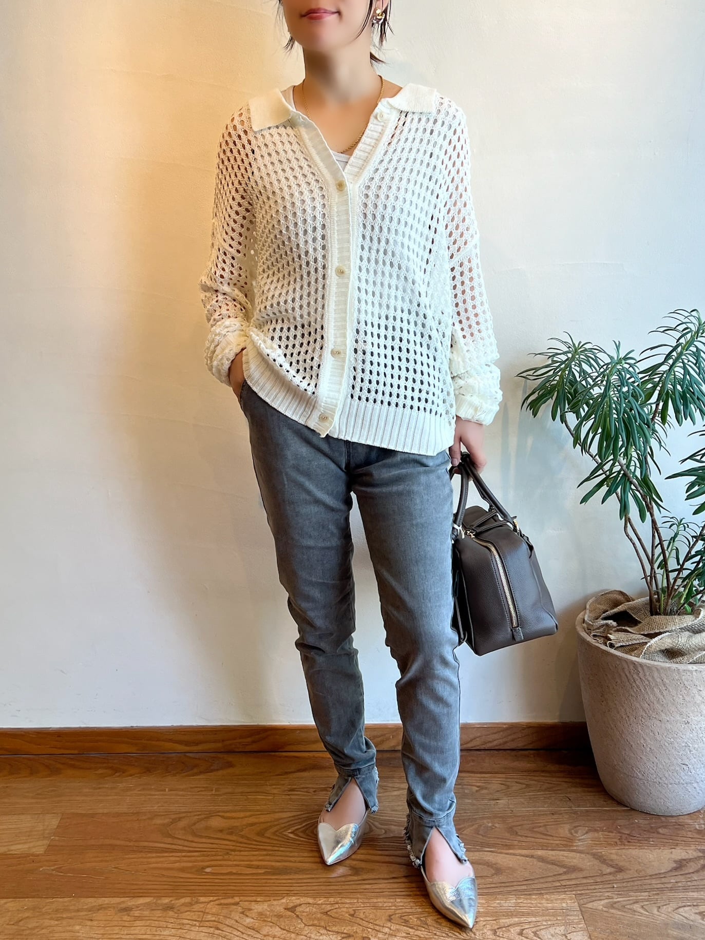 夏の羽織りとして最適なニットカーデ。透かし編みニットを今年らしいポロ仕様のカーディガンに仕上げました。透かし編みが涼し気で、抜け感のあるコーディネートが完成します。腰にかかる長さで、ウエストやヒップを程よくカバーしてくれるのも嬉しいポイント。ノースリーブやタンクトップに合わせて涼し気なコーディネートもおすすめ。ノースリーブのワンピースにカーディガンのように合わせるのも便利です。手洗い可能な機能面も抜群のアイテムです。