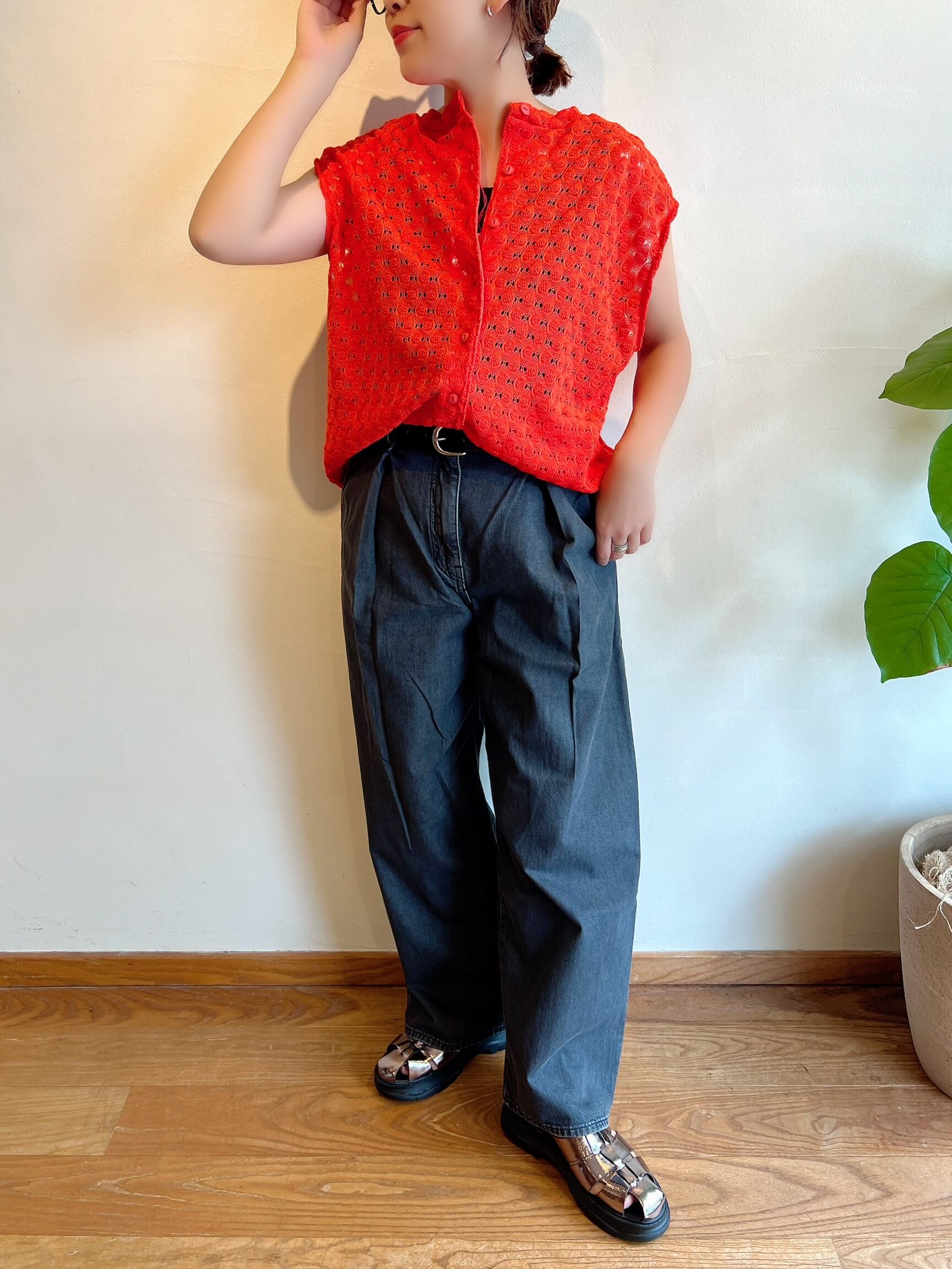 プルオーバーとしてもベストとしても着られる一着で二度楽しい FRONT AND BACK RIB SLEEVELESS。暑い時期はタンクトップやTシャツと、涼しくなってきたらロンTや薄手のニットと合わせて、夏から秋、そして春と長い時期着られる素材です。レースの模様をやや密にすることで透けを少なくしています。サラッとしながらも柔らかさのある肌触りで着心地も快適。やや短めの着丈に長めの袖丈で、どんなボトムスともバランスが取りやすいシルエット。ボタンの開け具合で色々な表情を楽しむことができ、プルオーバーとして着たときも、後ろのボタンを幾つか開けて着るとまた違った表情に。