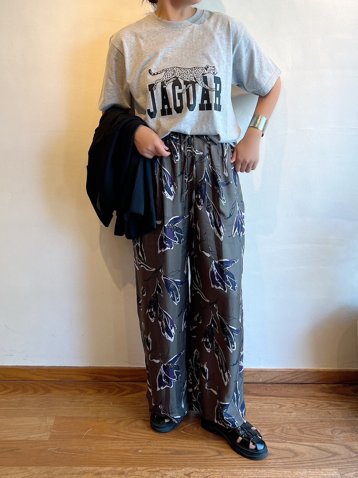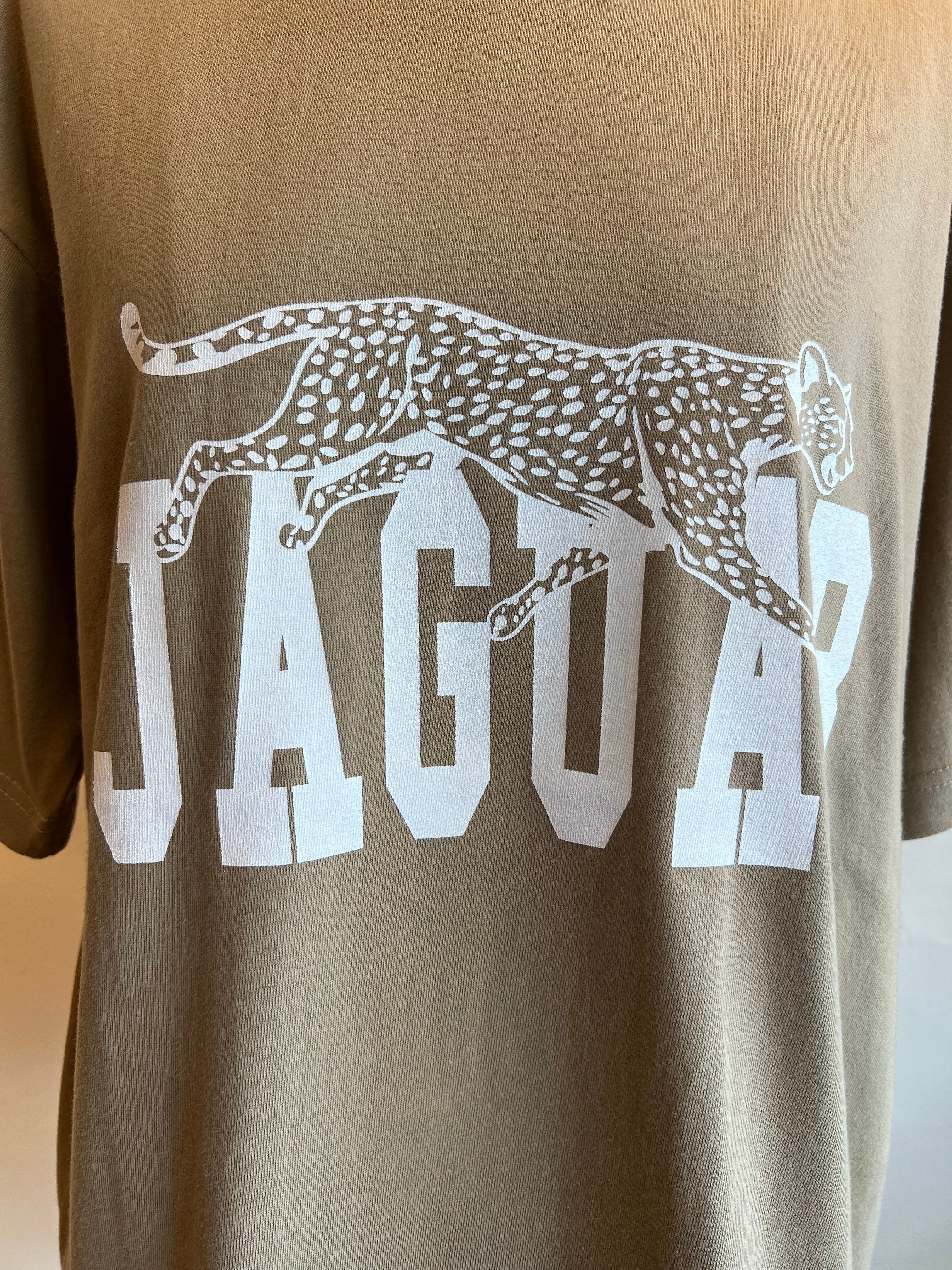 SOLD OUT ジャガーのプリントが目を引く、一枚で主役級のTシャツです。綿100%のしっかりした生地感に二の腕を肘までカバーしてくれる袖丈で、大人の女性に嬉しいデザインです。インでもアウトでも、パンツでもスカートでも万能に着まわせるアイテムです。