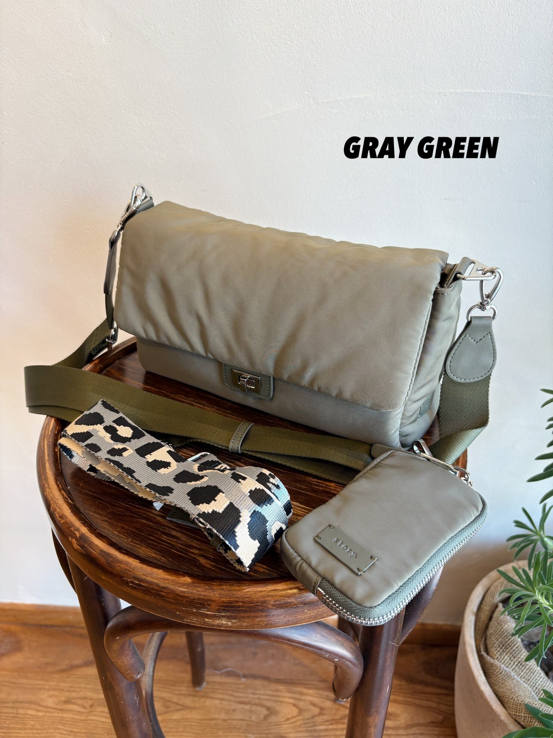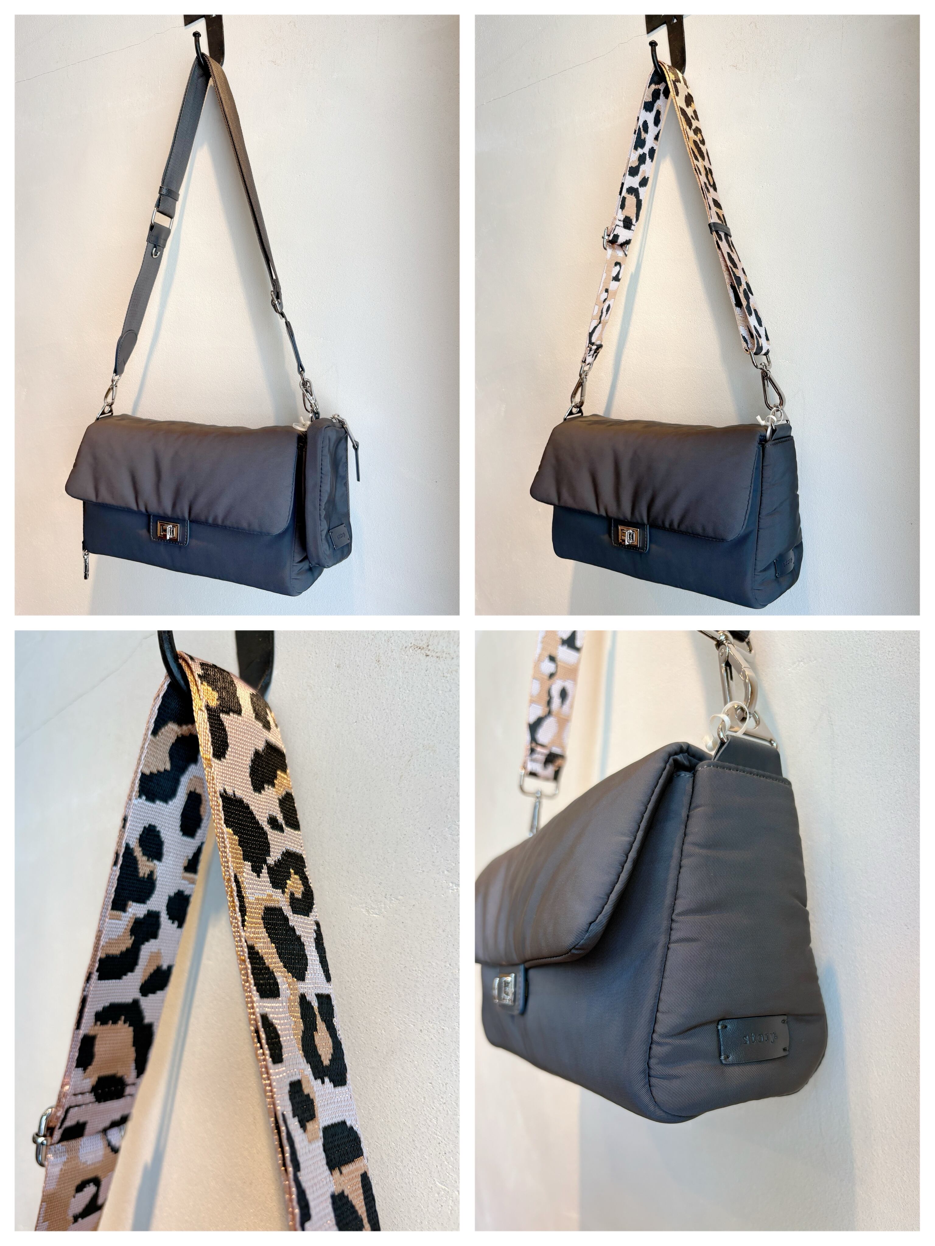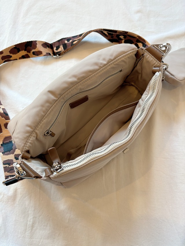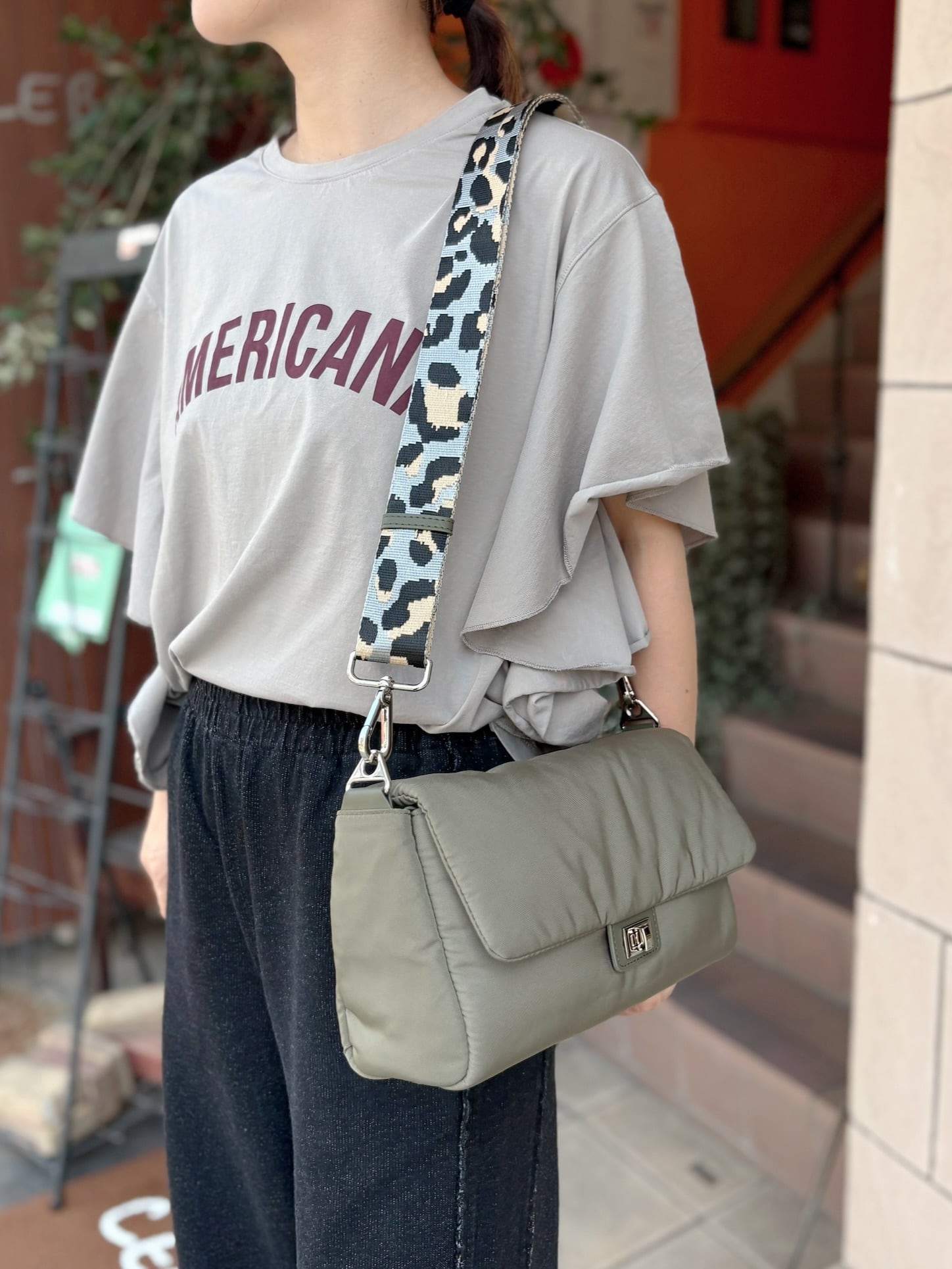 SOLD OUT 生地の中に綿が入っていて、ふかふかとした手触りが可愛らしいフラップショルダーバッグ。ターンロック金具を使用し、カジュアルになり過ぎずスタイリッシュな印象に仕上げました。ストラップや三角カン、内側のナスカンなどへ取り付け自由でマルチに使えるポーチチャームが付属。ベーシックな同色ストラップと、コーデのアクセントになるポップなカラーレオパードの2種のストラップつき。背面にもポケットが付いているので、スマートフォンなどよく使うアイテムの出し入れもスムーズです。視認性を高めるため、ポケット内のみバイカラーを採用しています。