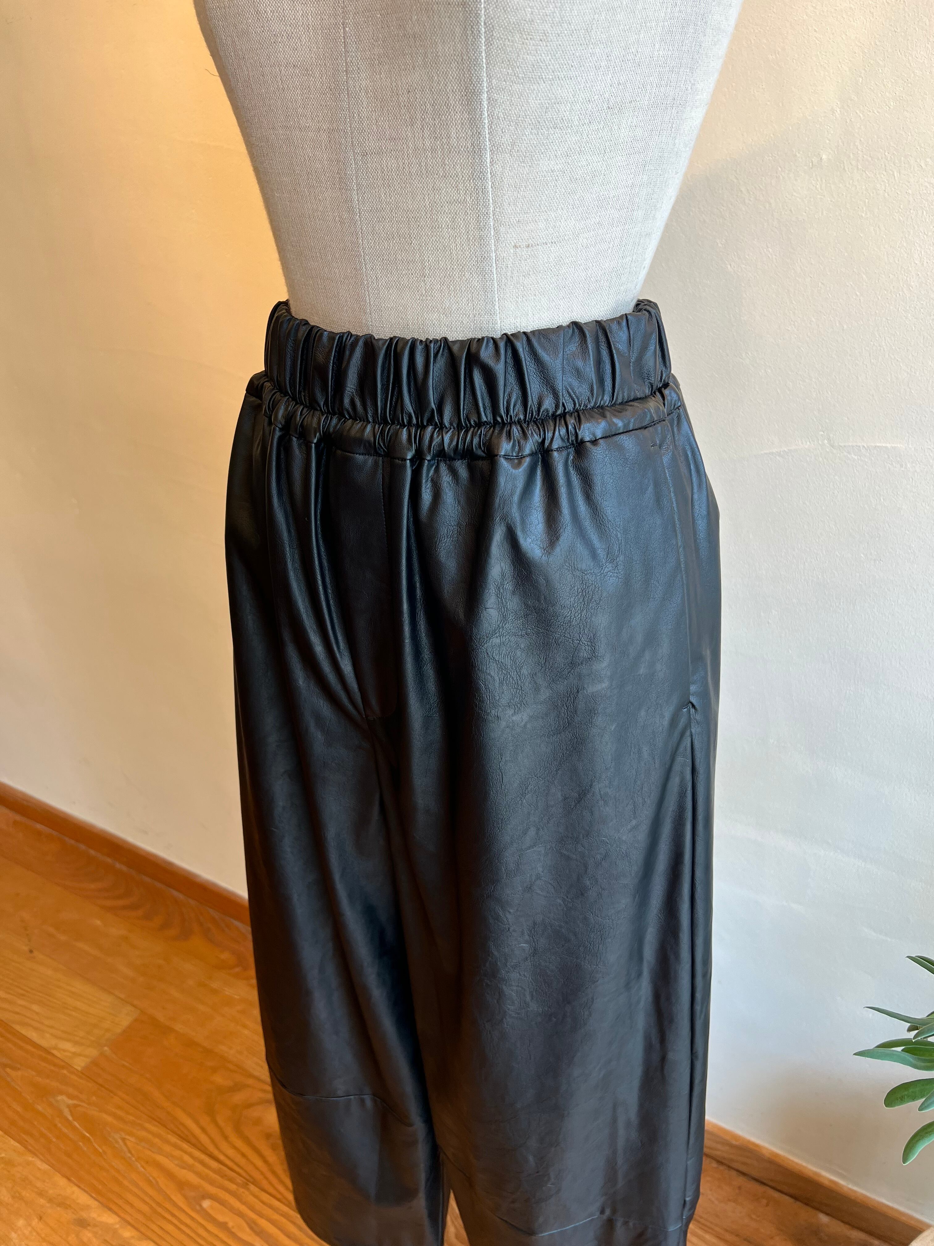 SOLD OUT 風合いの柔らかさに優れ、天然皮革に近い高級感のある表情が特徴の上質なエコレザーを使用したカービーワイドパンツ。ウエストはリラックス感のあるゴム仕様で、内側のドローストリングでサイズ調整が可能。ひざ下切替えでほんのりカービーさせたワイドシルエットがモード感のあるシーズンムード高まる一着です。