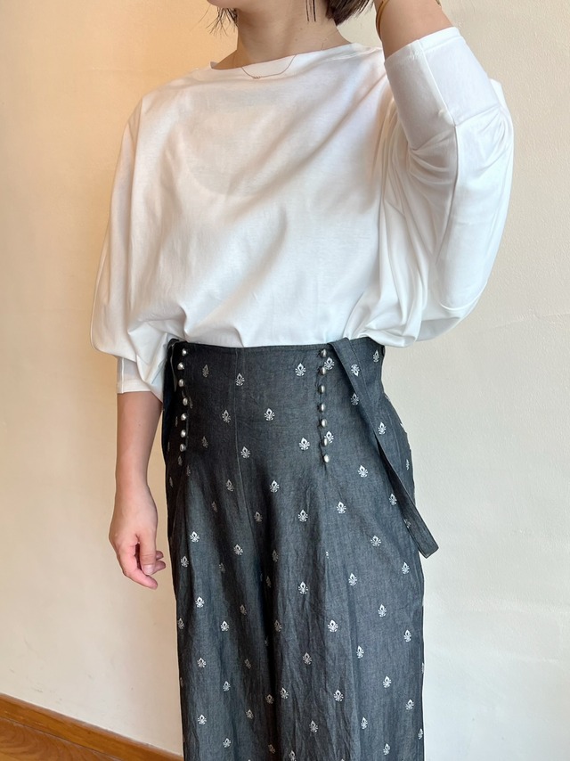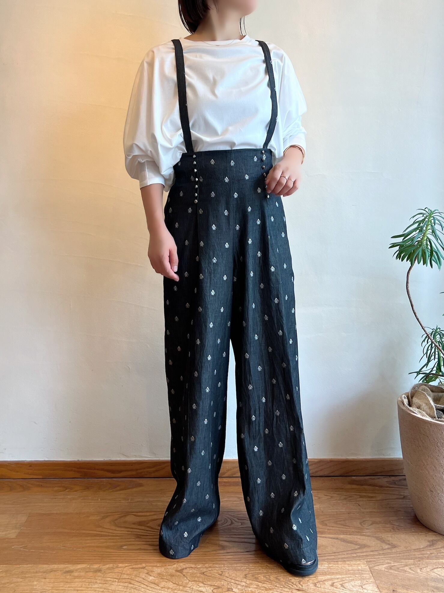 SOLD OUT ハイウエストのサスペンダーパンツを、ブラックデニムのようなシャンブレーで仕立てました。シルバー箔の小紋プリントと、縦にきれいに並ぶシルバーメタルボタンがポイント。ボタンがまっすぐ前を向くように縫い込みも工夫しています。サスペンダーは長さの調節も可能。