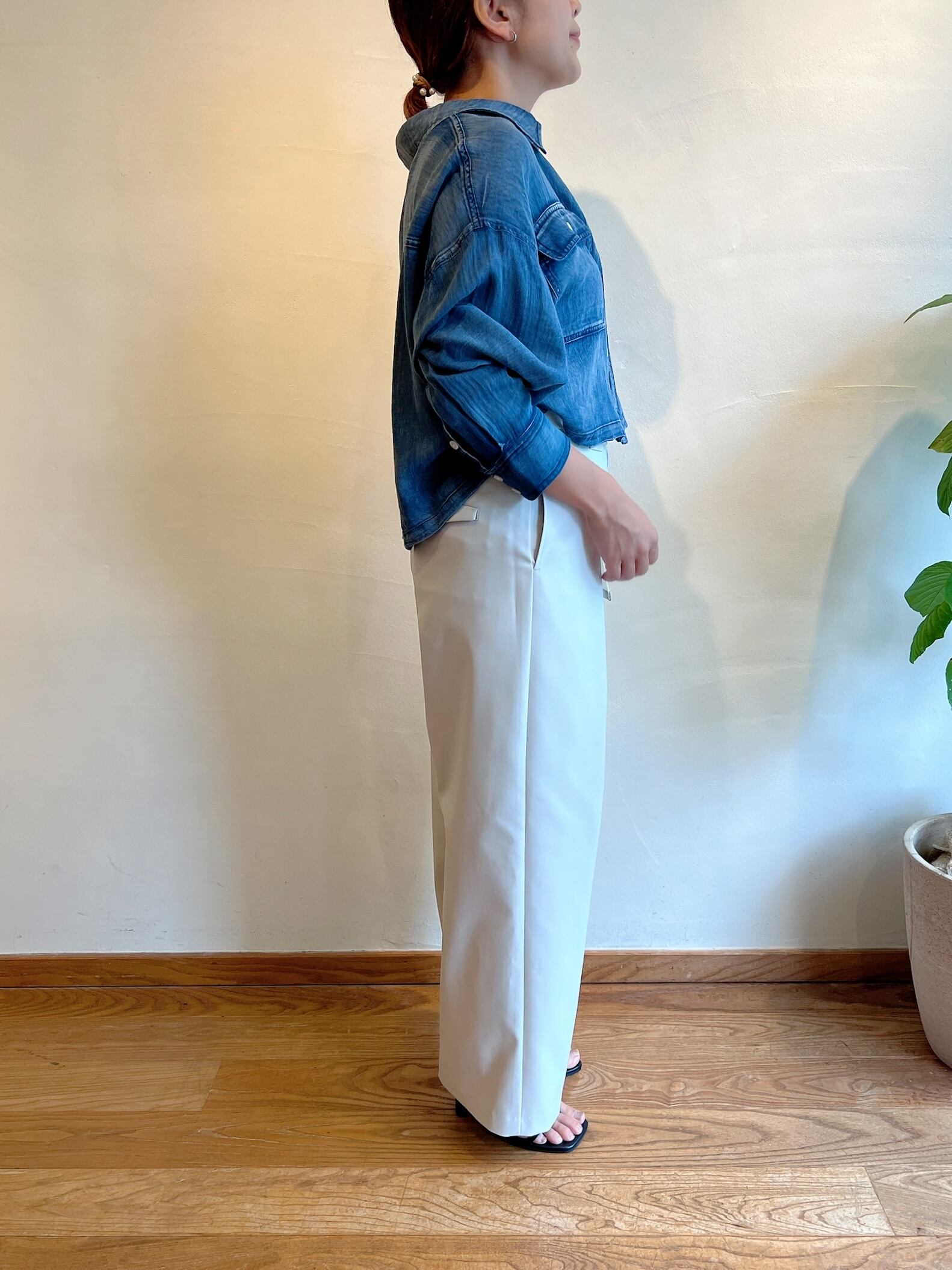 Tシャツやタンクトップとのレイヤードスタイルがおすすめ。夏の羽織にも最適なので、冷房対策やノースリーブにワンプラスするのも重宝します。秋にはインナーに薄手タートルを重ねて長く活躍します。