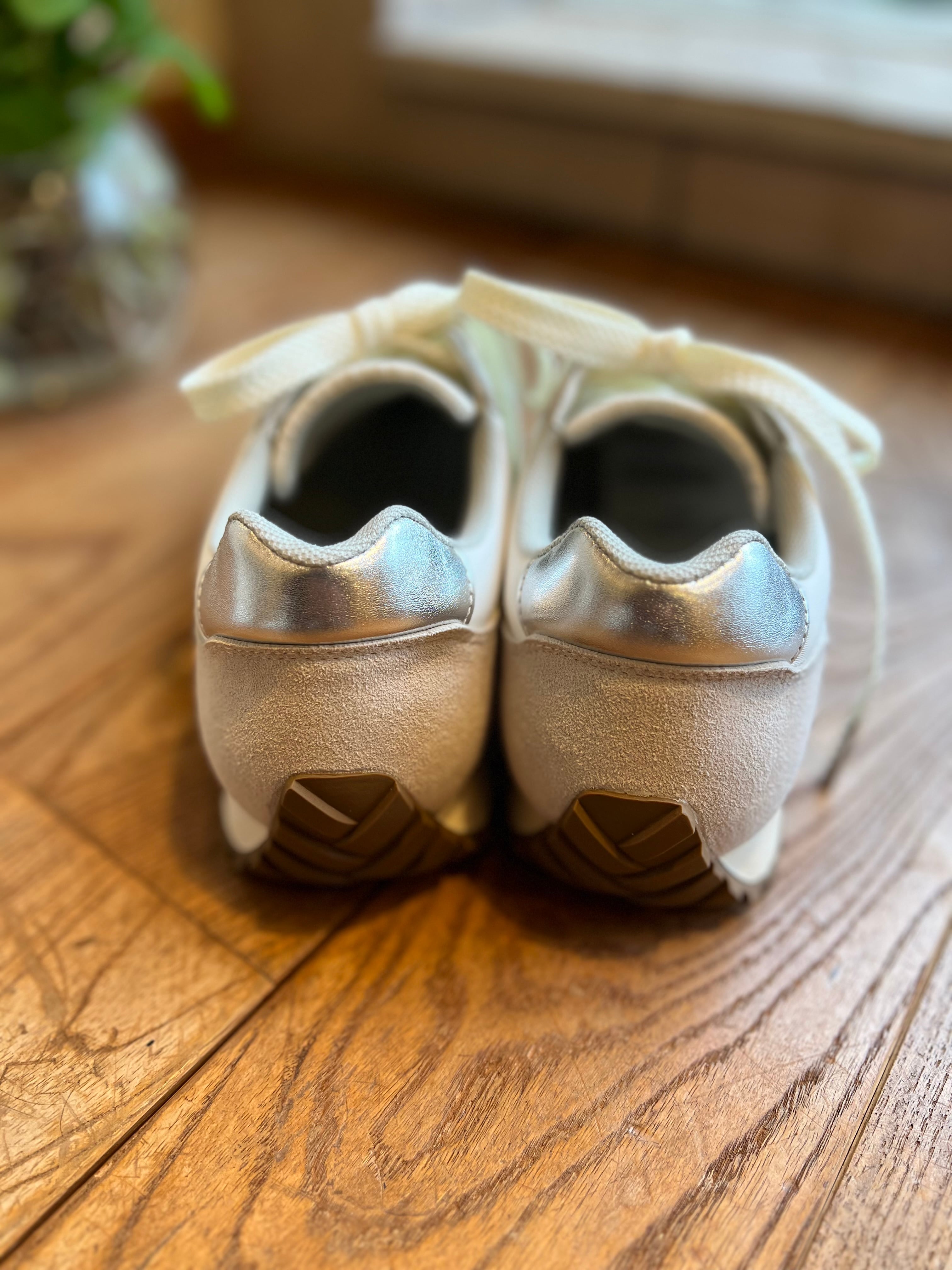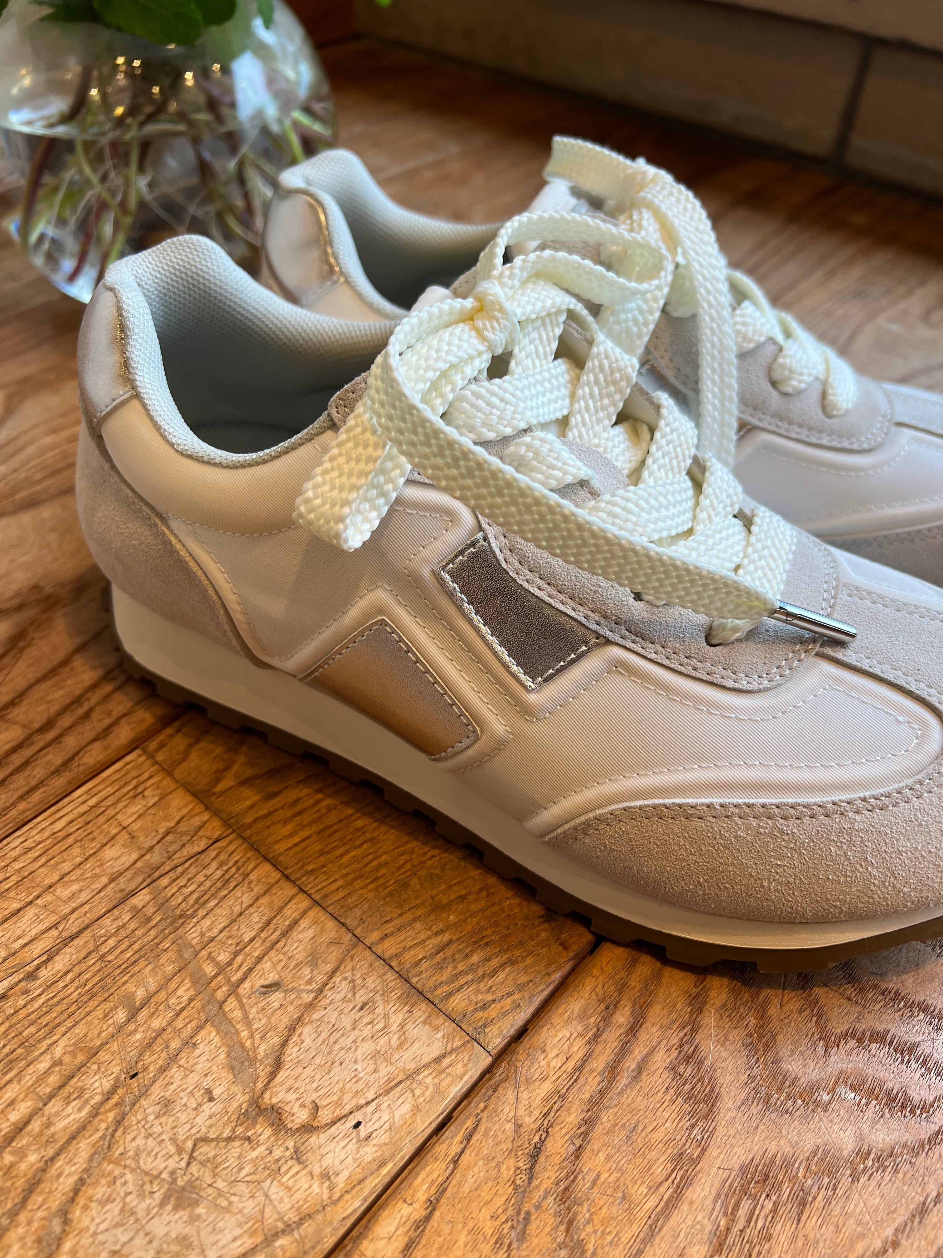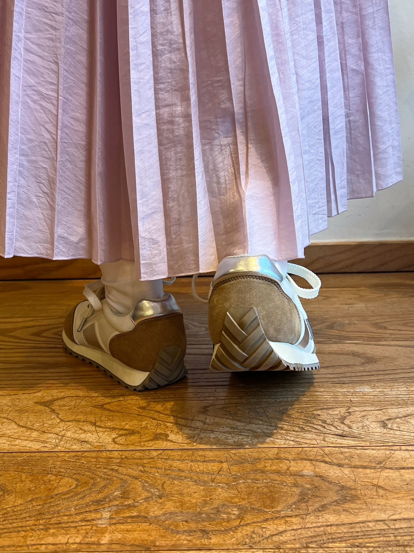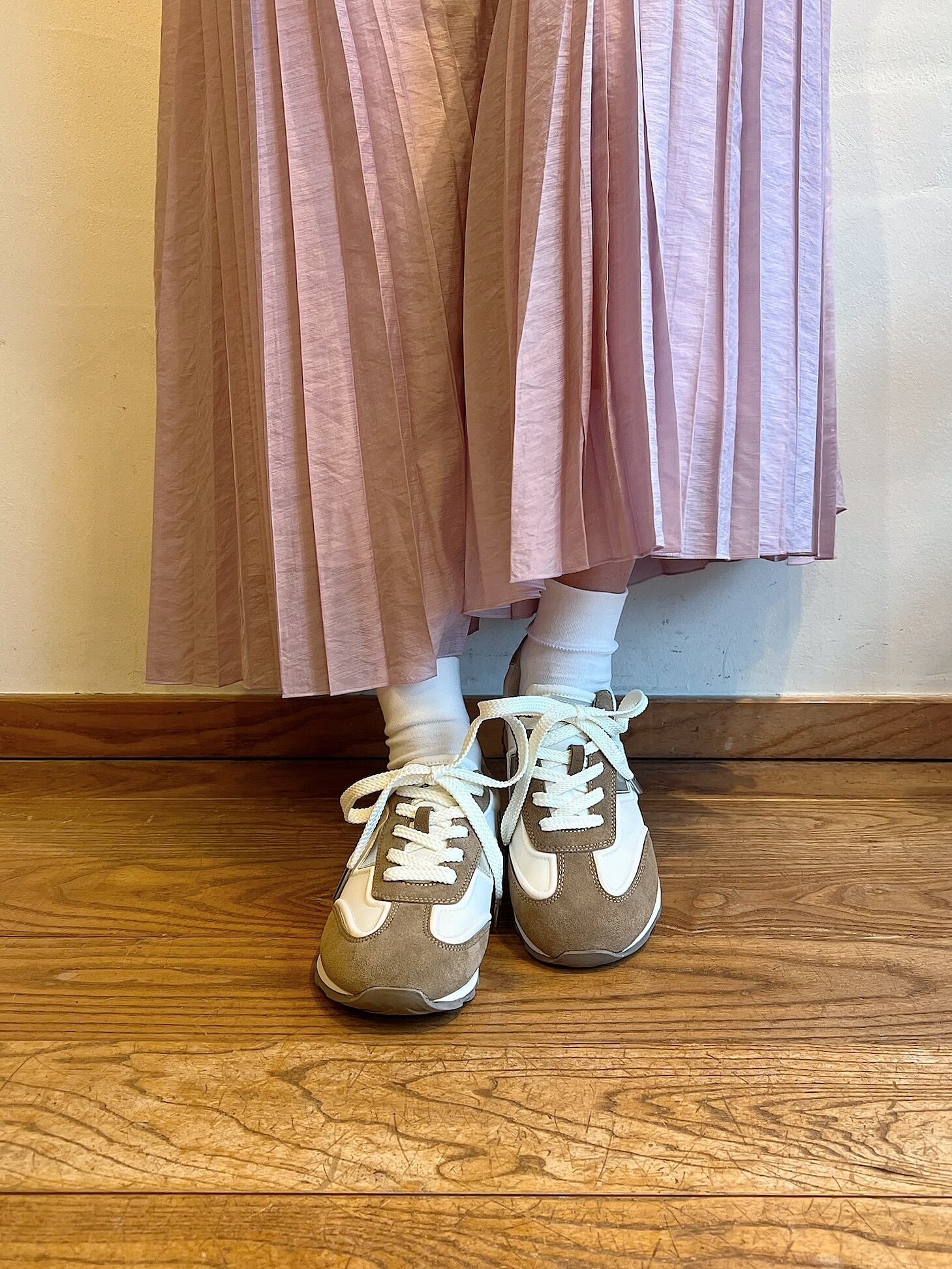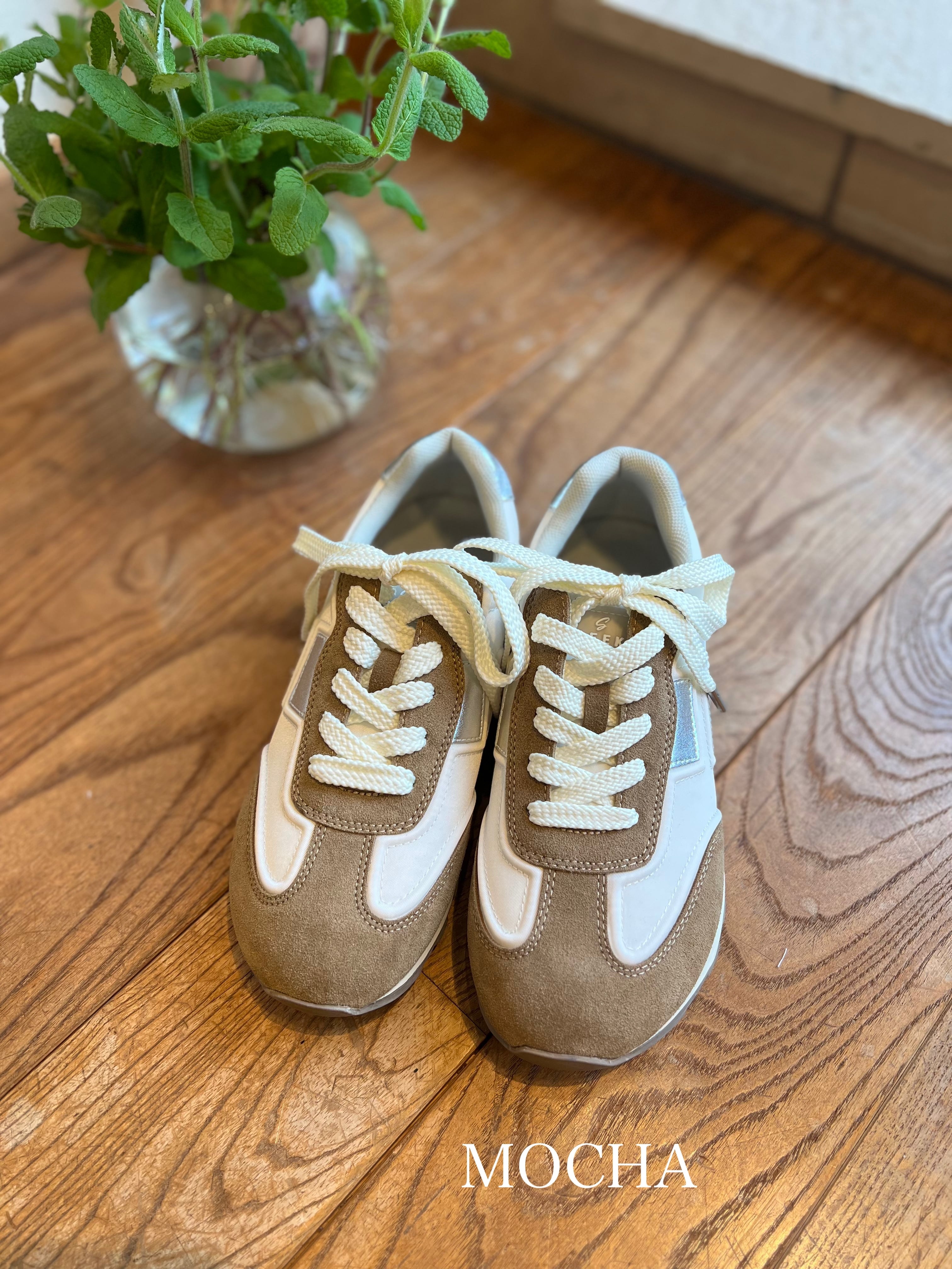 フェイクスウェード×ホワイトの切り替えがカジュアルすぎず、上品にまとまる1足。