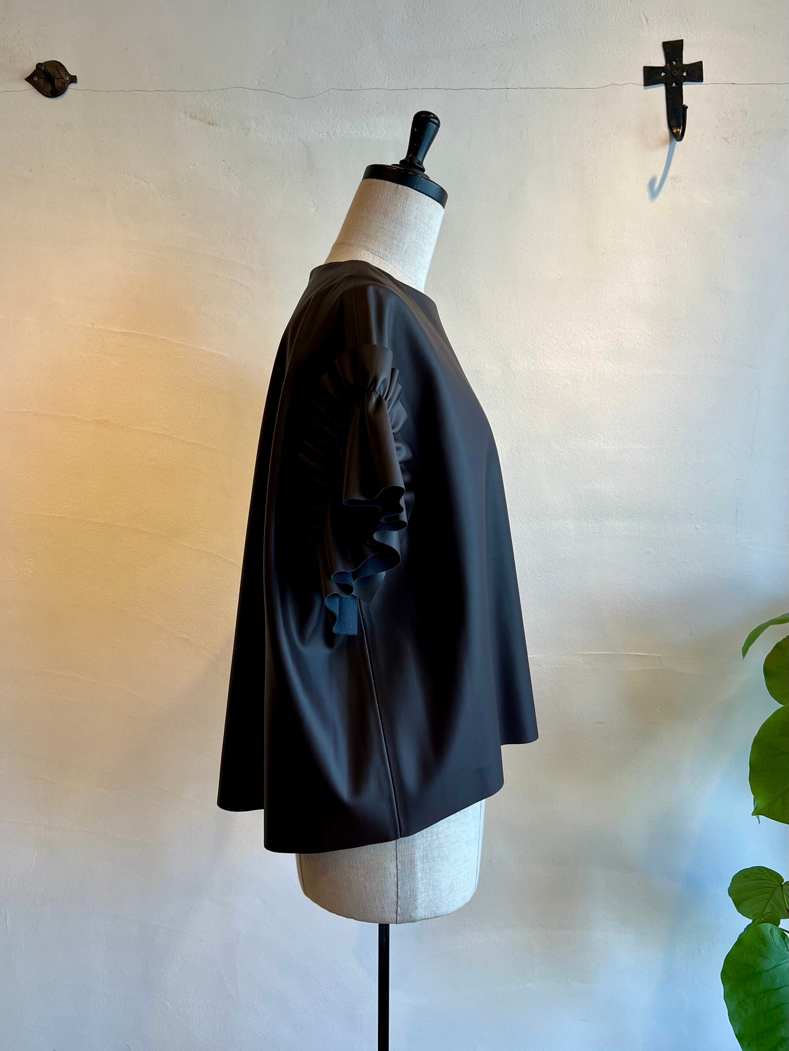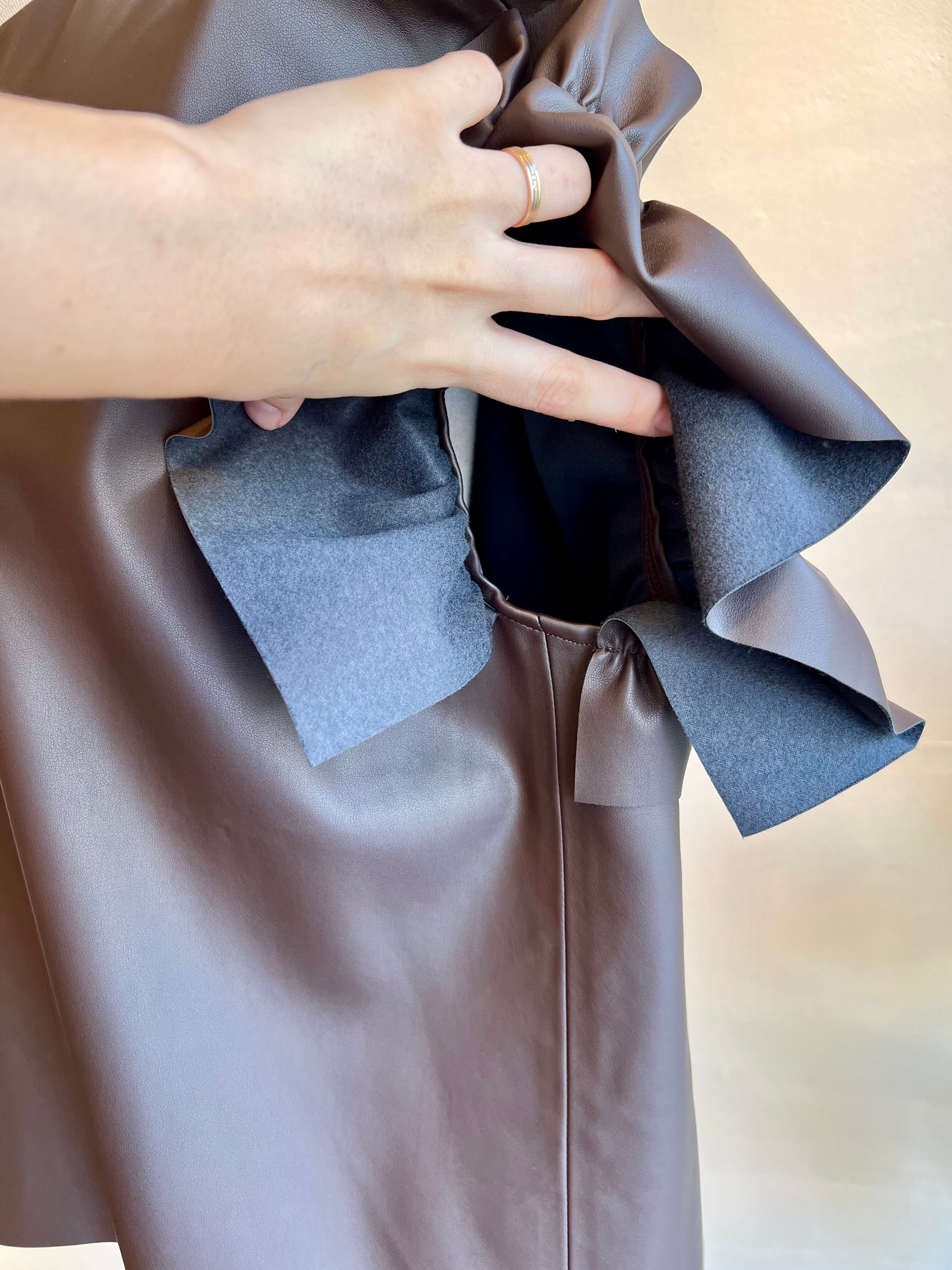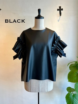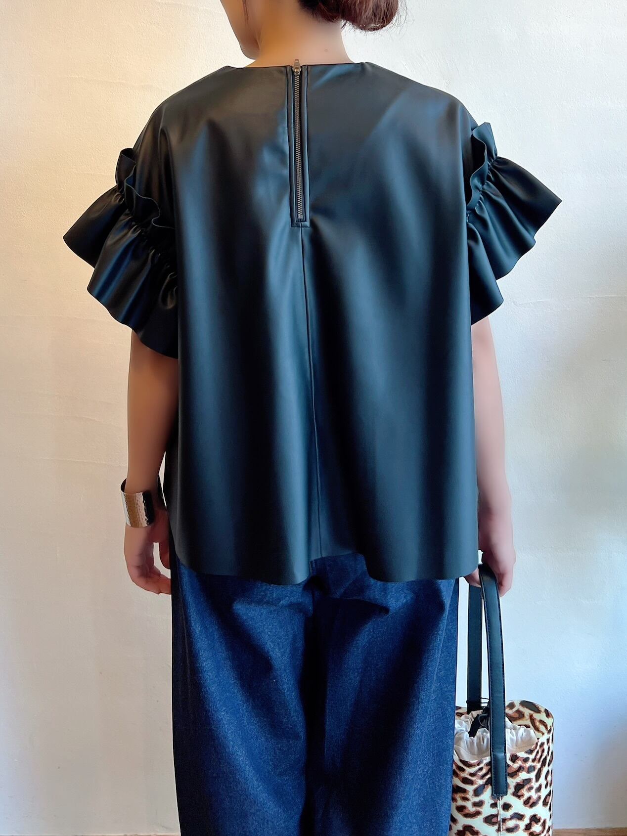 SOLD OUT 柔らかなフェイクレザーにフリルの甘辛ミックスがお洒落なトップスです。ボリューミーなフリルは立体的なシルエットで目を惹きます。少し気温が下がってきたときは、タートルネックなどのインナーを合わせて着用出来ます。