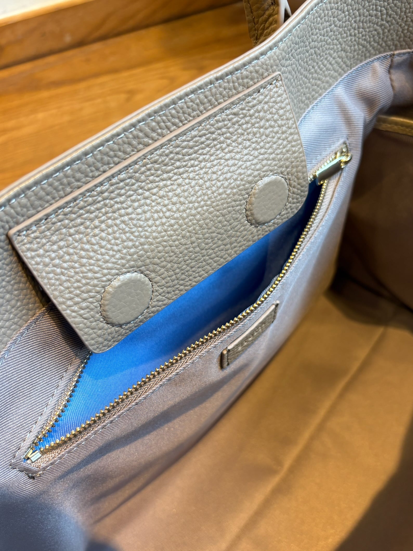 SOLD OUT A4ファイルもすっきり収納できるワイドトートバッグ。ベーシックながらもトレンドのロングハンドルでさりげなく流行をプラス。通勤やきれいめはもちろん、サイドのコードを絞ってカジュアルにも持てます。シボ感がありキズや汚れが目立ちにくく、程よい柔らかさで扱いやすいカウレザー。ステッチワークやミラーチャームなどの細かなこだわりもポイントです。視認性を高めるため、ポケット内のみバイカラーを採用。