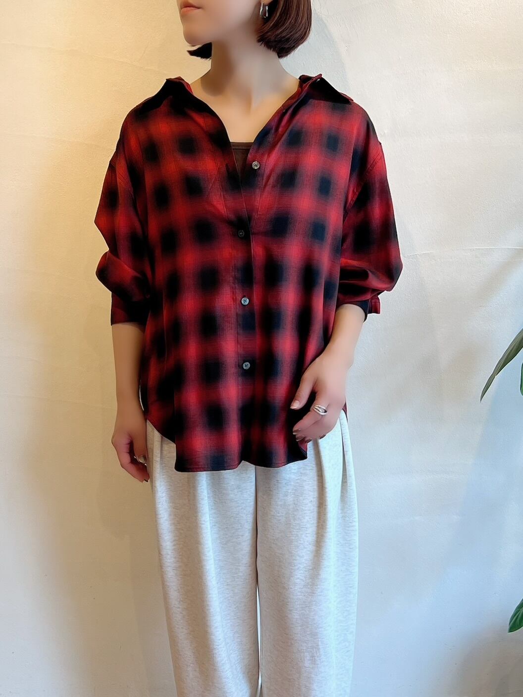 SOLD OUT 秋らしさを感じさせるチェック柄シャツ。これからの残暑コーデに新鮮さをプラスし、季節感もぐっと高めてくれるアイテムです。ポイントは後ろのボタンスリット。閉じたまま着たり、開けてスリットにして着たりとアレンジが利きます。