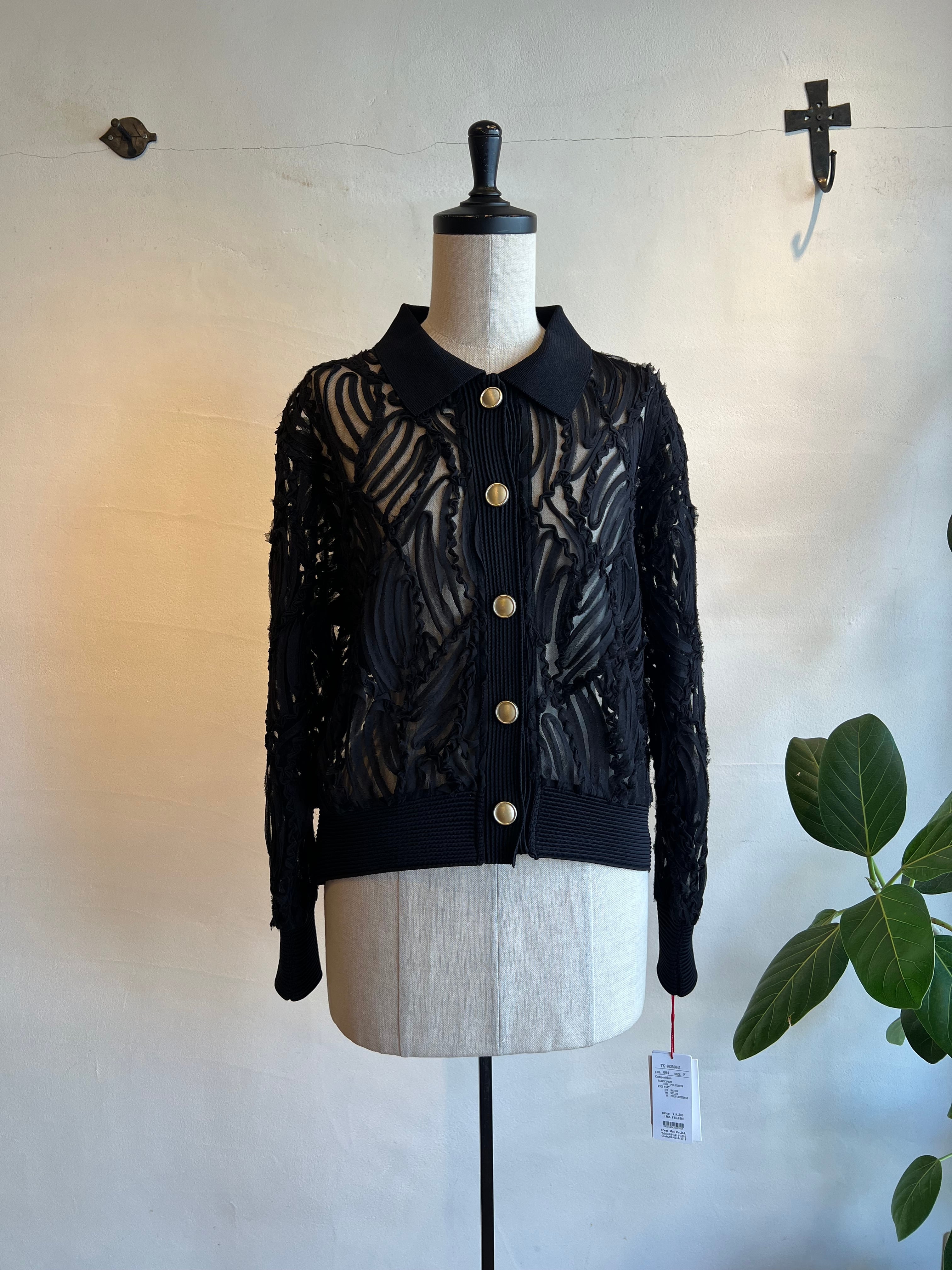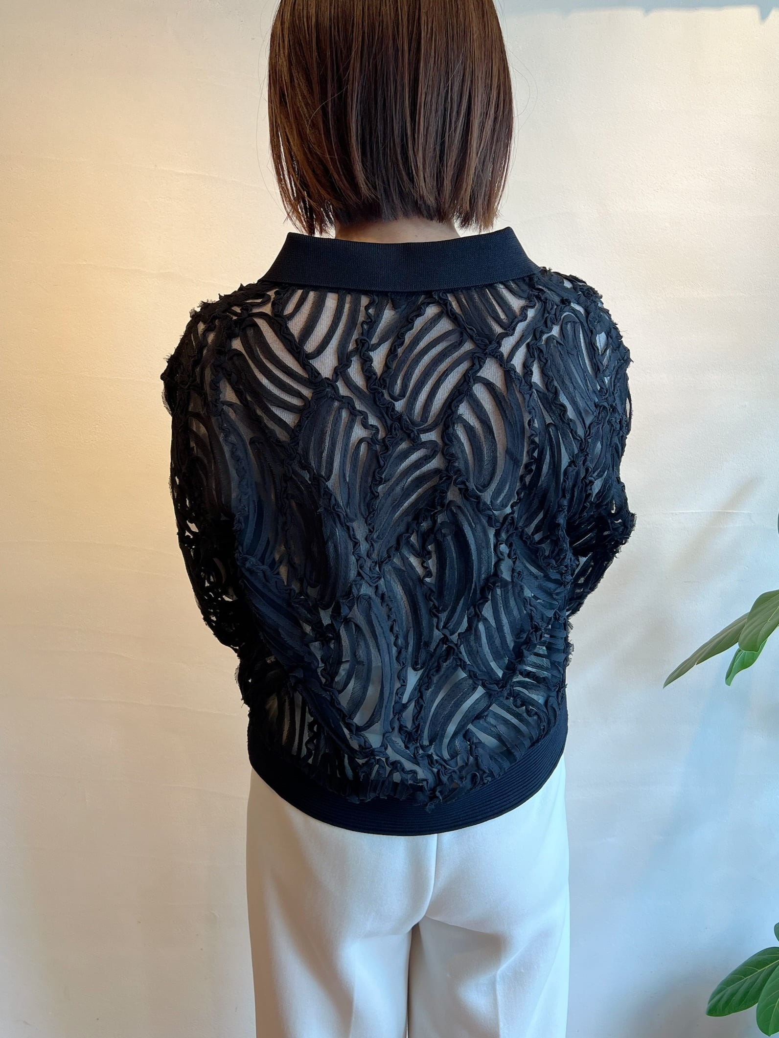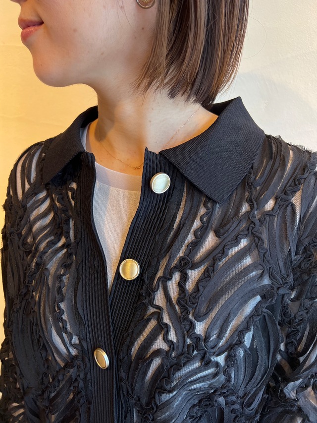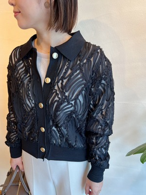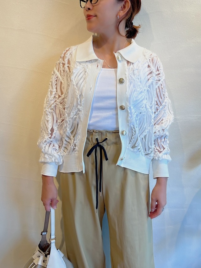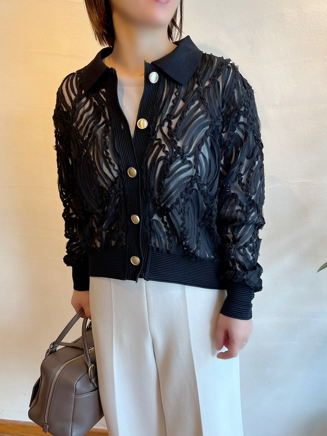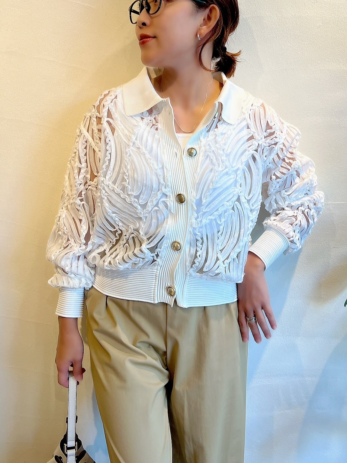 繊細なレースの透け感が楽しめる、ポロ襟デザインののレースカーディガン。フリンジのように立体感のあるレースデザインが目を惹きます。襟、袖、裾、ボタン部分にはニットをドッキングして、デザイン性を高めました。ショート丈のすっきりとしたシンプルなデザインで、どんなボトムにもマッチします。フロントはボタン仕様で、ゴールドの大きめな釦がアクセントに。晩夏はタンクトップに重ねて透け感を楽しんだり、Tシャツにカーディガンとして重ねても、秋口は薄手のタートルに重ねても素敵です。今から長いシーズン重宝します。
