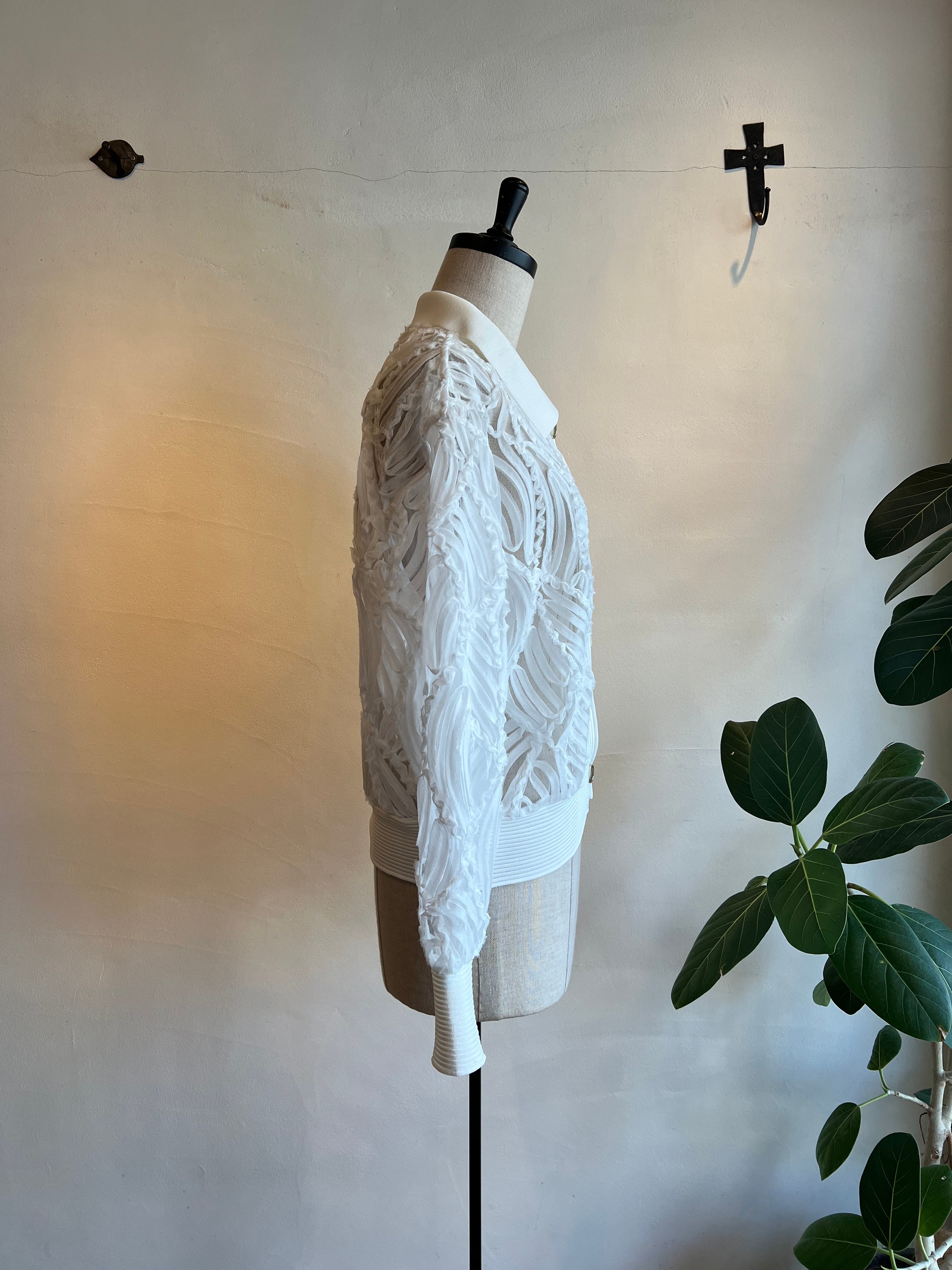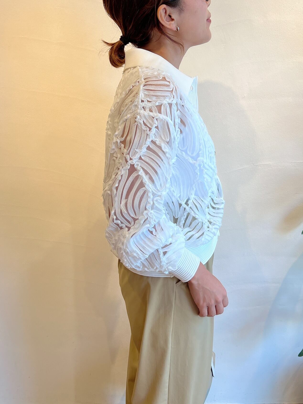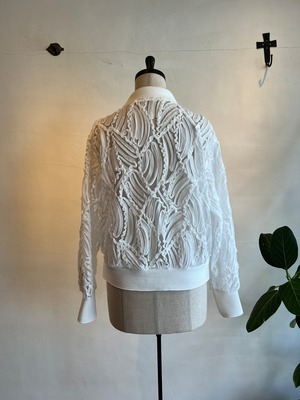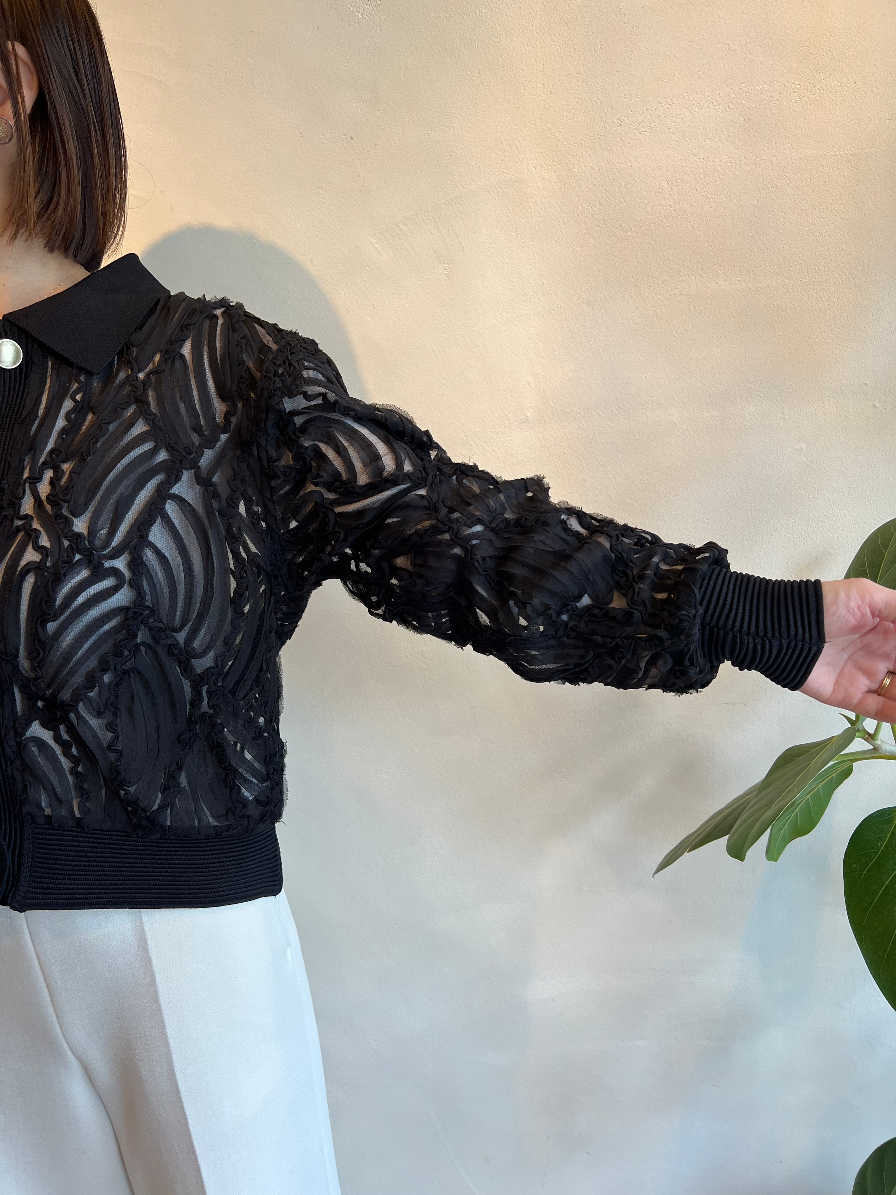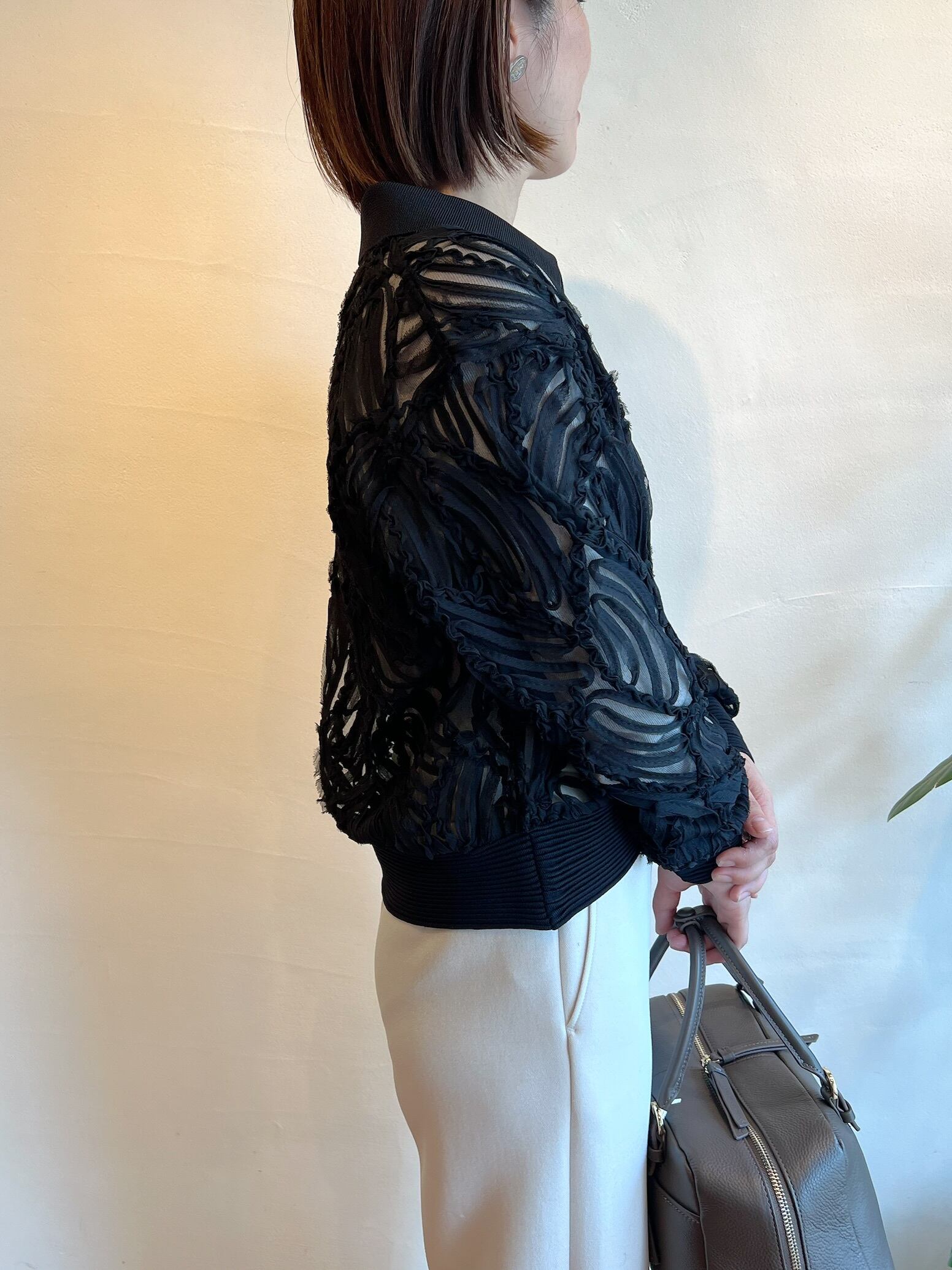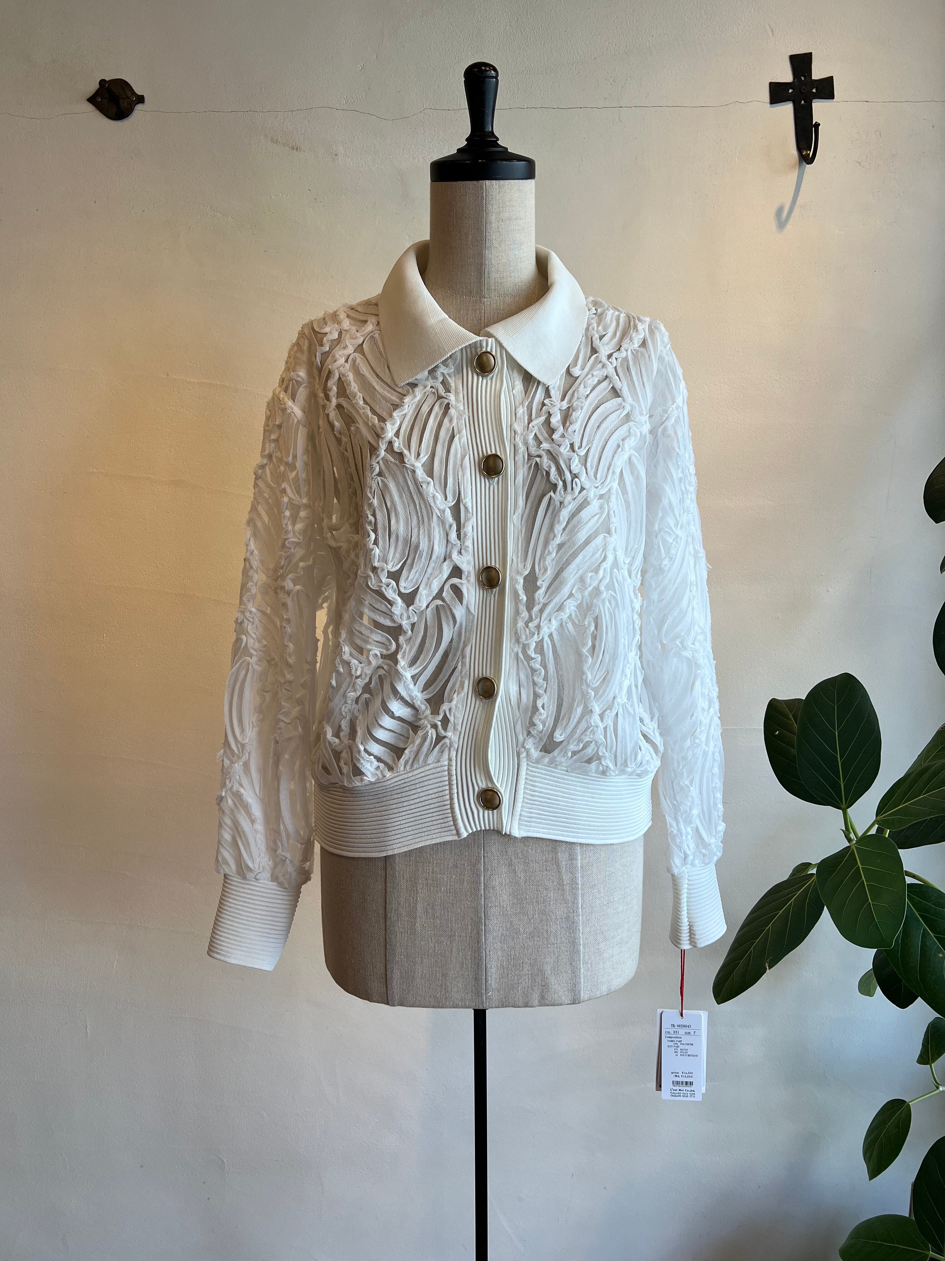 繊細なレースの透け感が楽しめる、ポロ襟デザインののレースカーディガン。フリンジのように立体感のあるレースデザインが目を惹きます。襟、袖、裾、ボタン部分にはニットをドッキングして、デザイン性を高めました。ショート丈のすっきりとしたシンプルなデザインで、どんなボトムにもマッチします。フロントはボタン仕様で、ゴールドの大きめな釦がアクセントに。晩夏はタンクトップに重ねて透け感を楽しんだり、Tシャツにカーディガンとして重ねても、秋口は薄手のタートルに重ねても素敵です。今から長いシーズン重宝します。