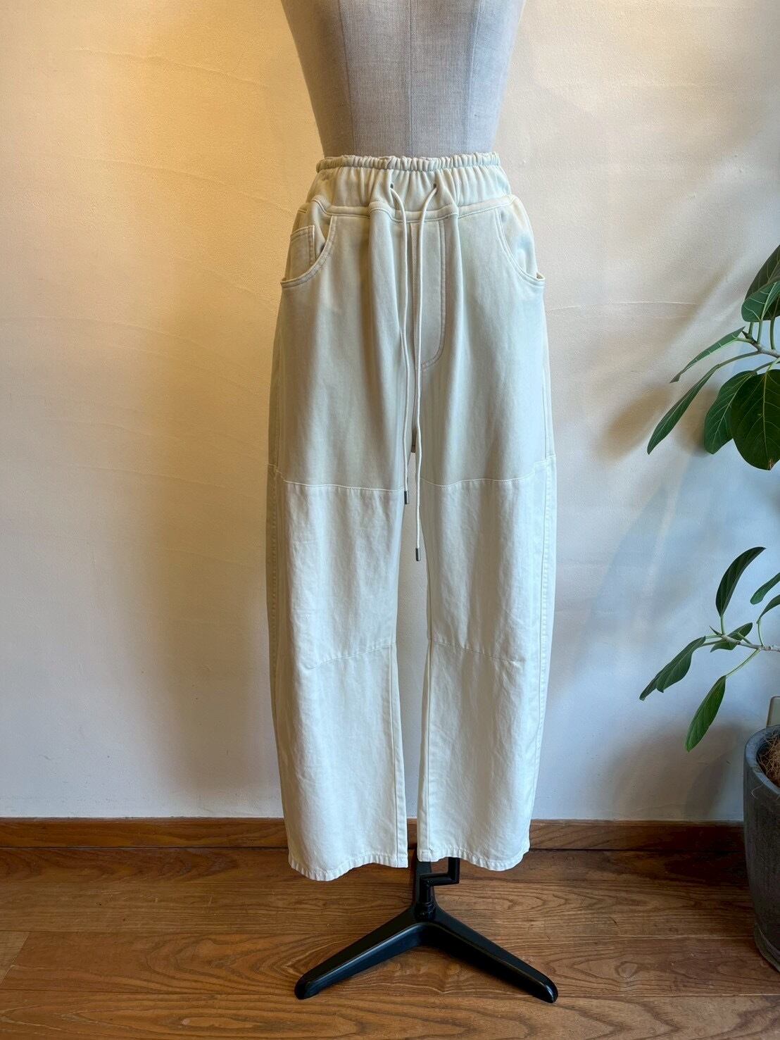 カットソーと布帛を膝上あたりで切り替えた素材ドッキングな1枚。カットソー部分はスウェット生地で履きやすく、ウエストはドローコード付きのゴム仕様でストレスフリーで穿いていただけます。