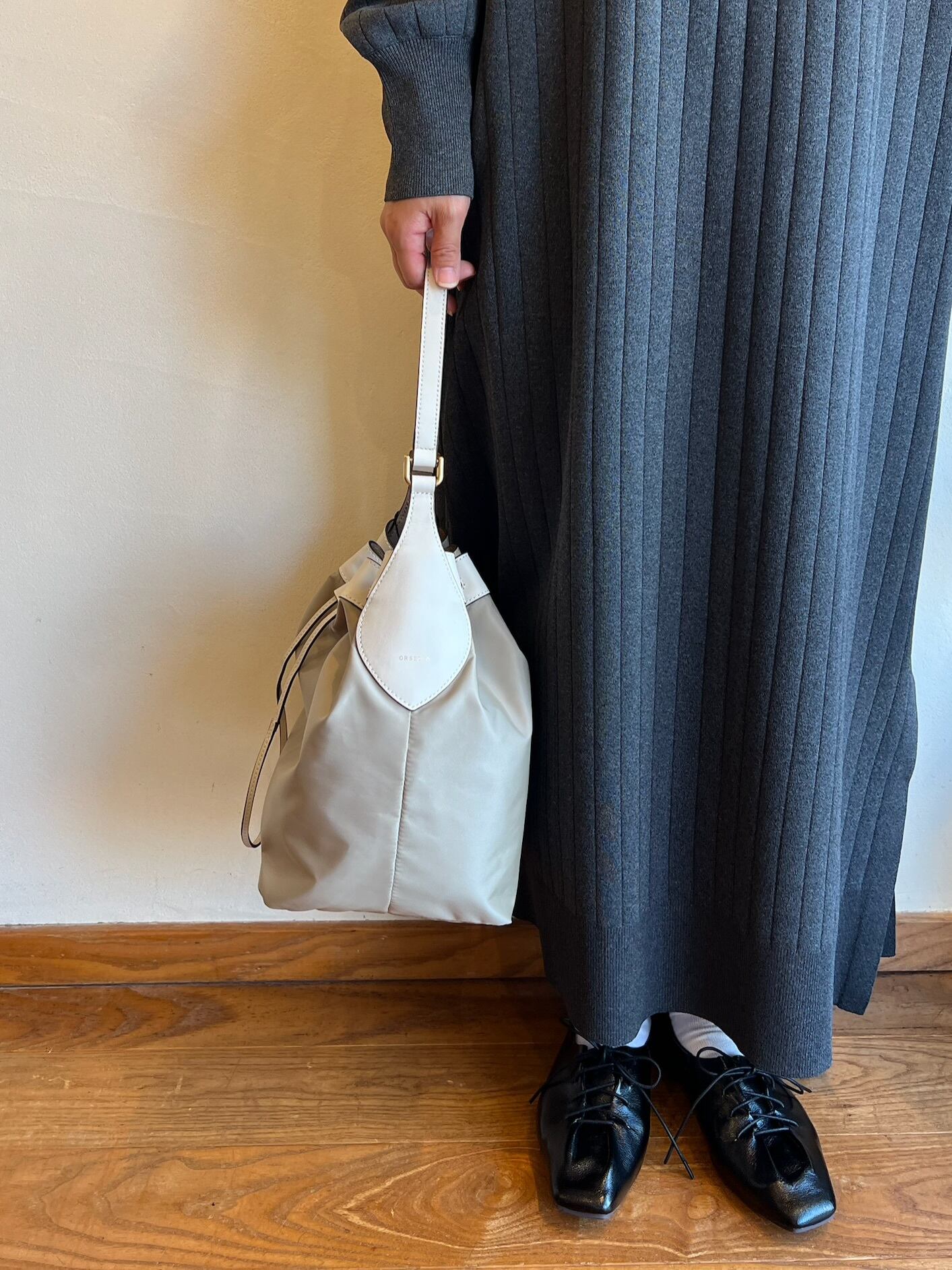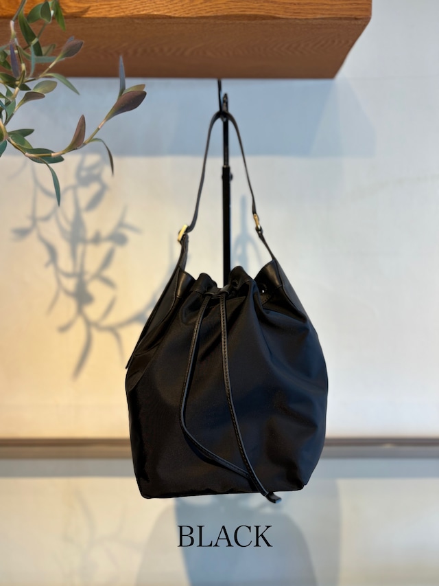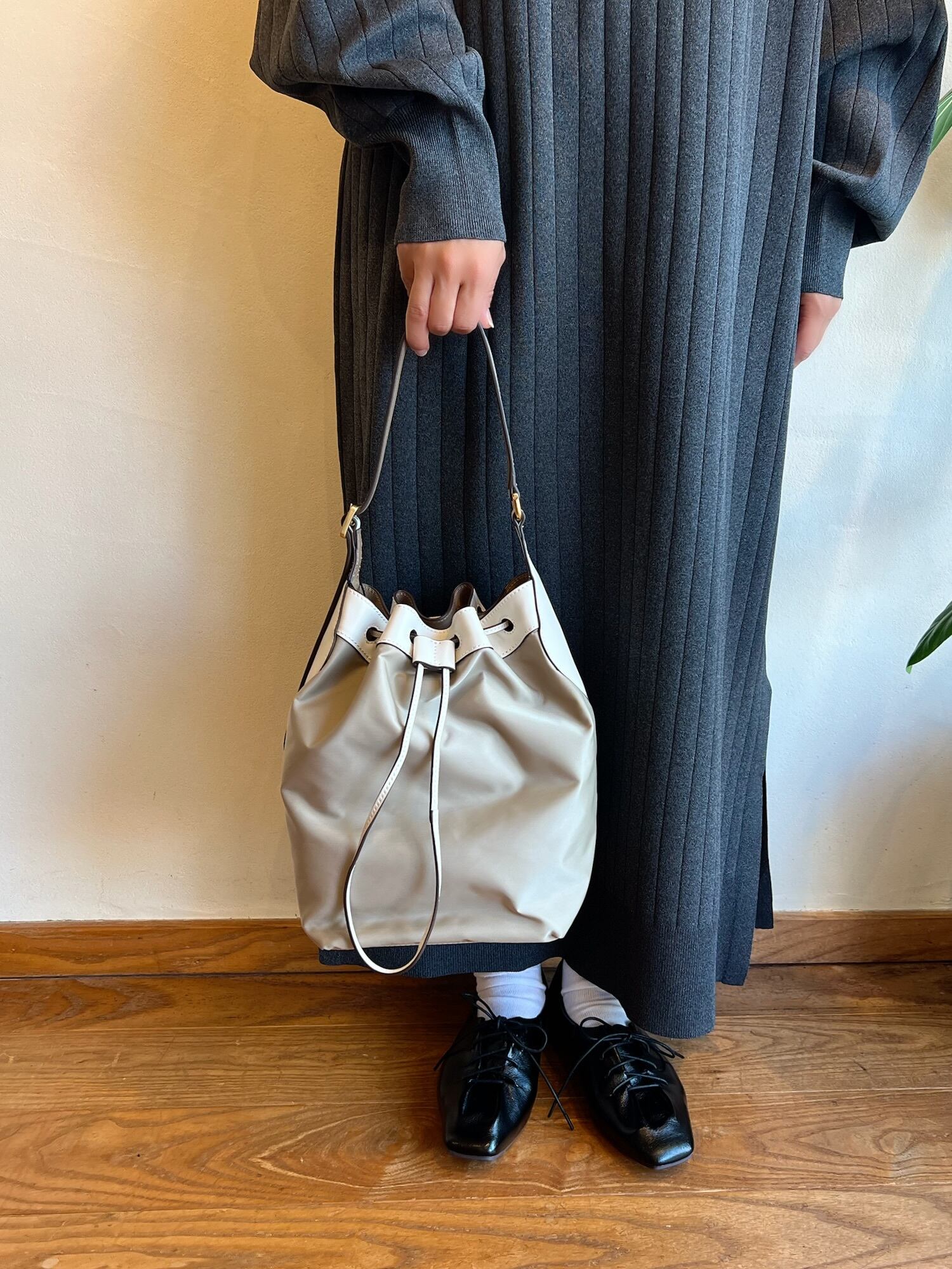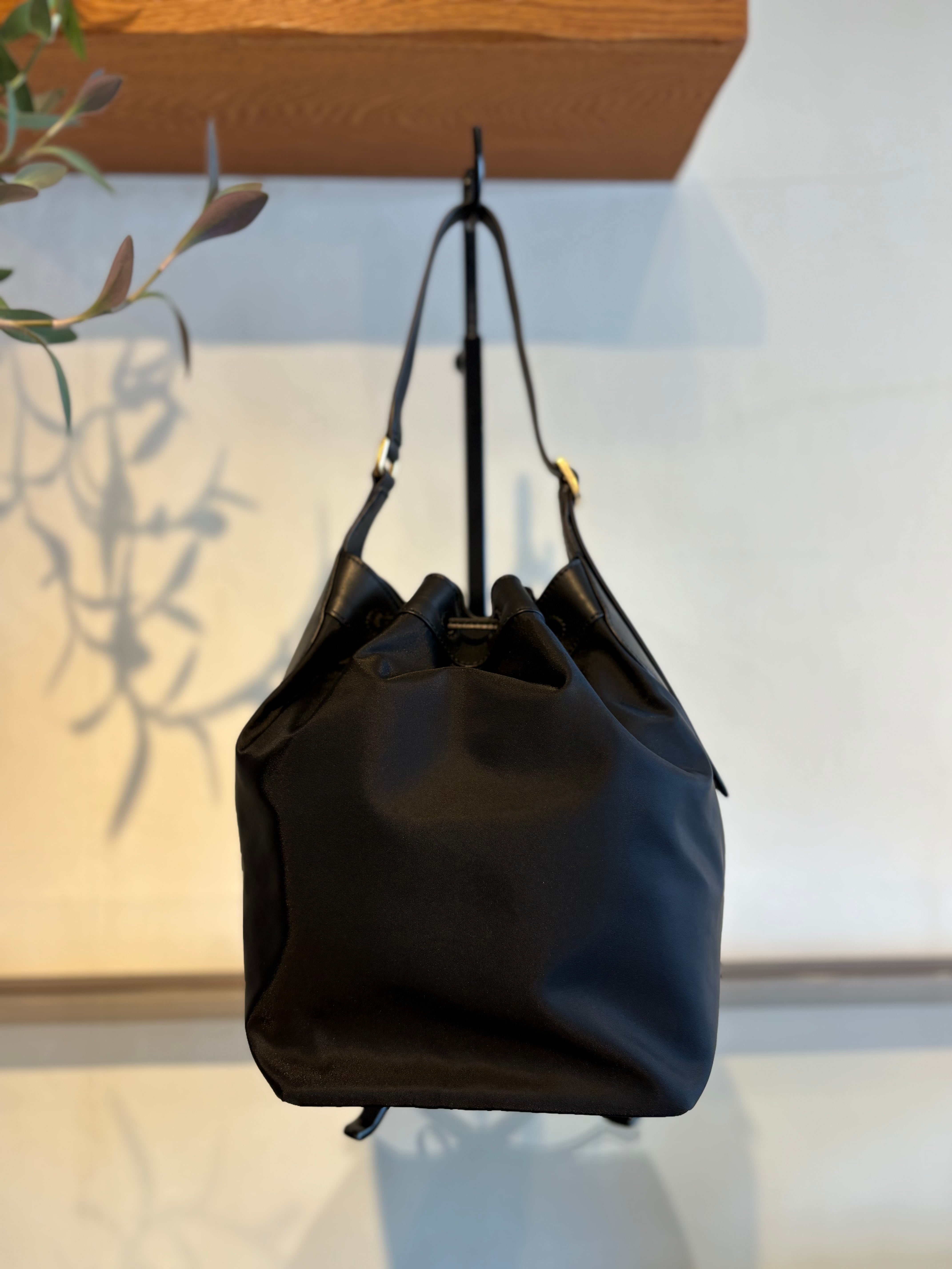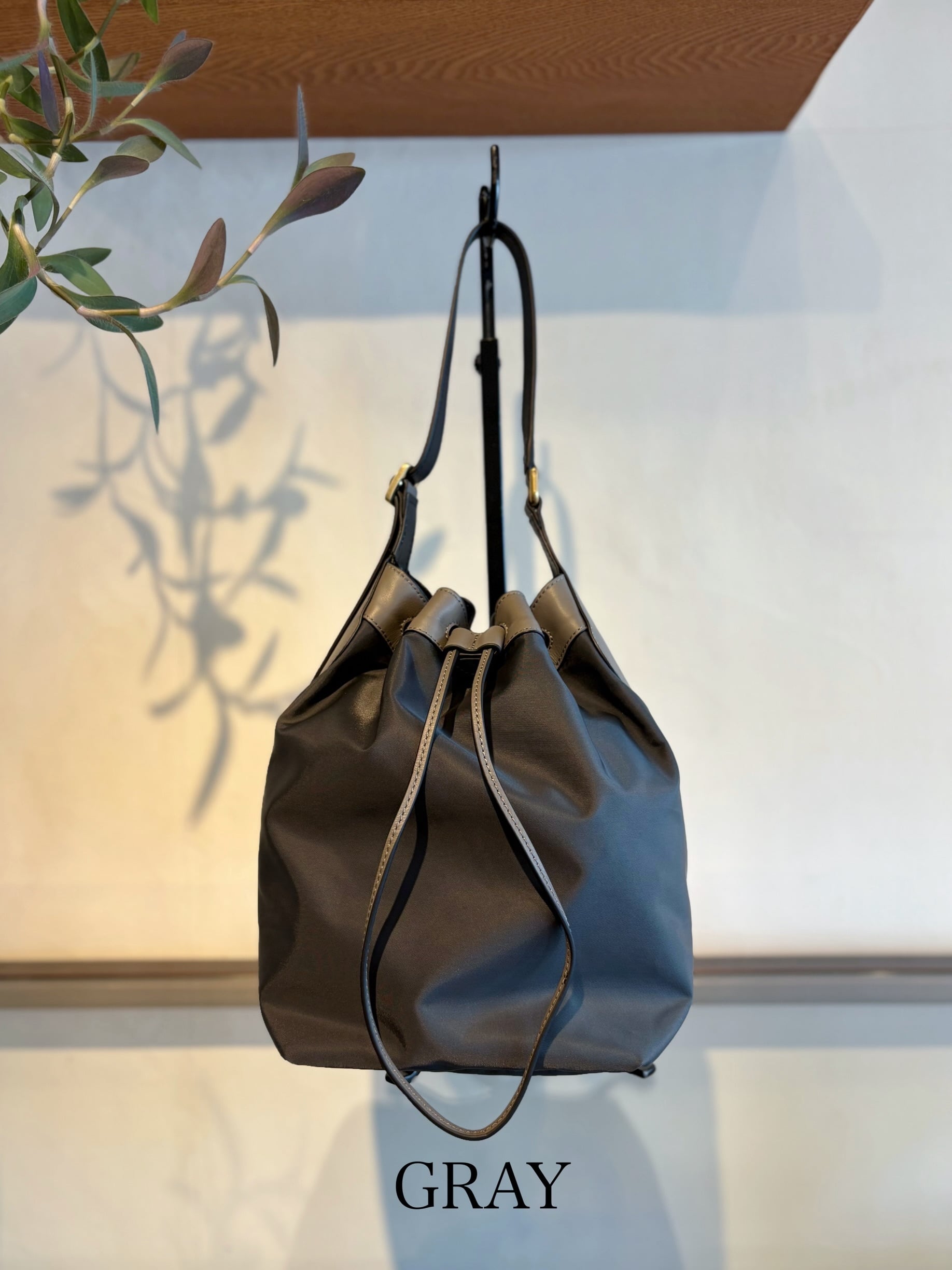ナイロン素材の巾着タイプのワンショルダーバッグ。 コンパクトで小さめなサイズ感で、ハンド持ちからワンショルダー仕様が可能。 正方形の底は安定感があり、コロンとした可愛らしいフォルム、荷物もしっかり収まります。 サイドに当てたレザーをデザインとして効かせ、シンプルなフォルムに程よいインパクトをプラスしました。