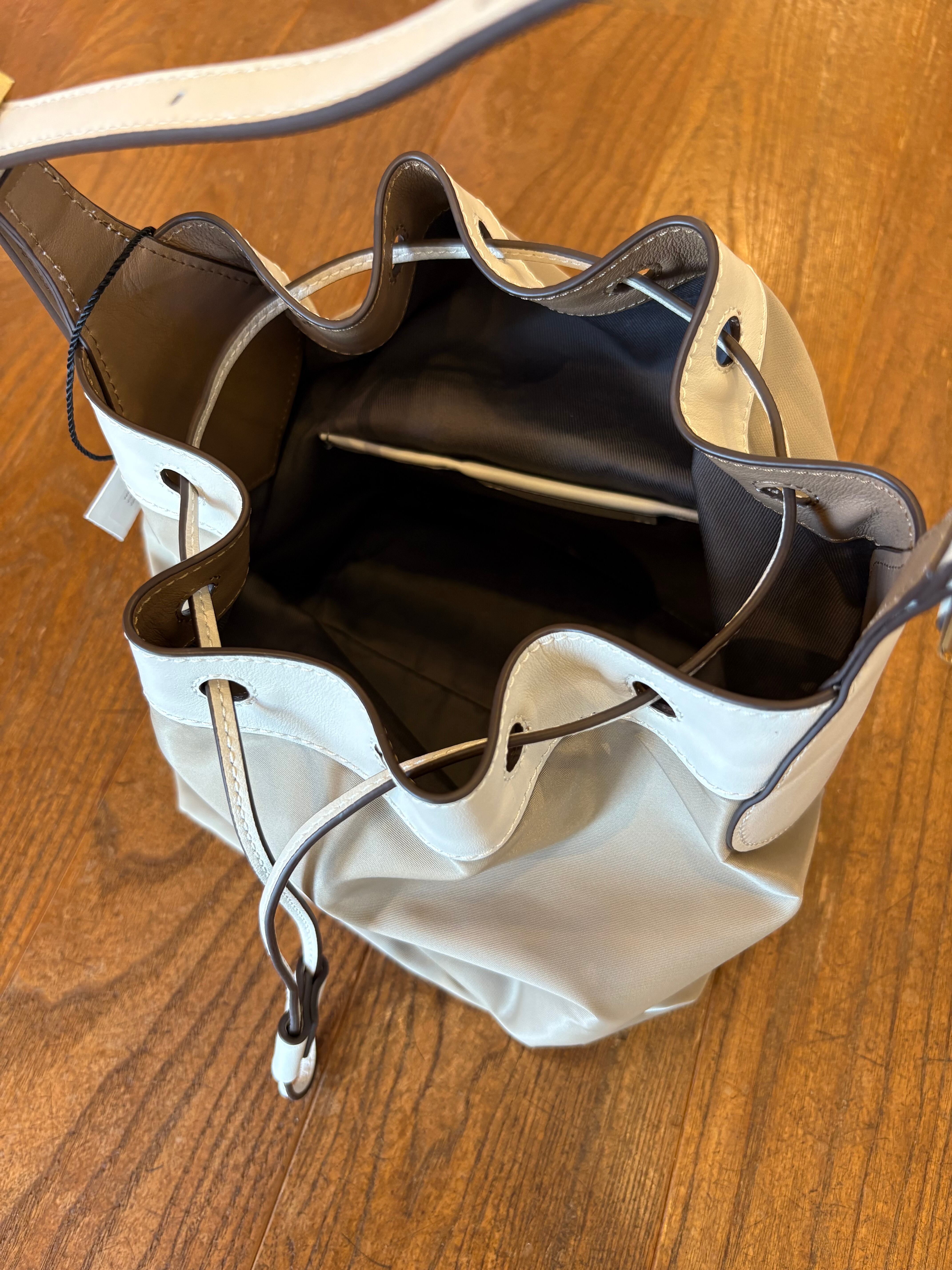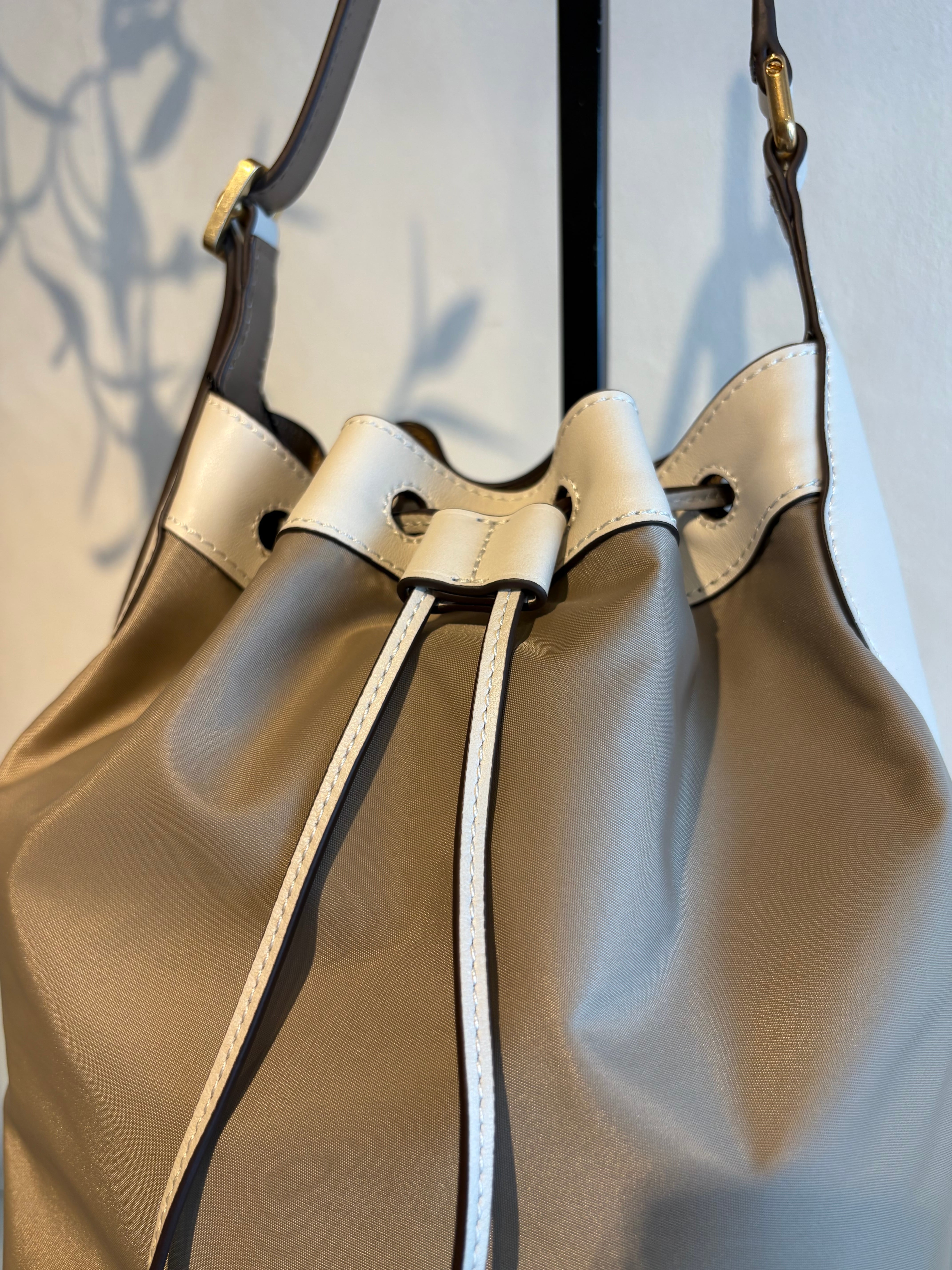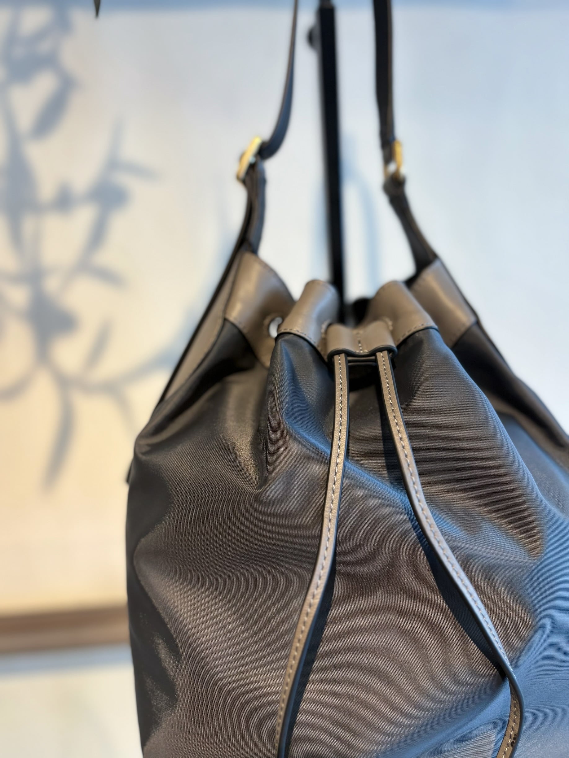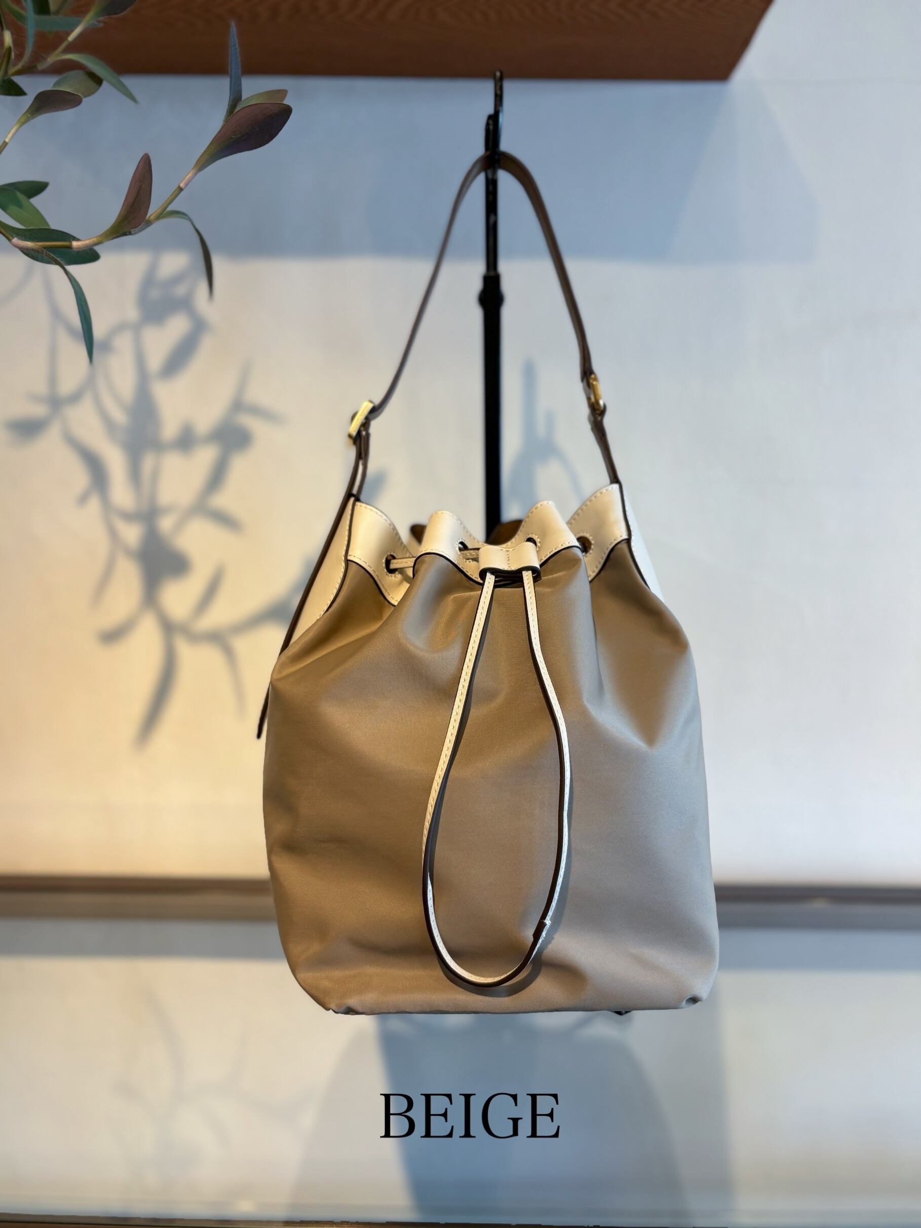 ナイロン素材の巾着タイプのワンショルダーバッグ。 コンパクトで小さめなサイズ感で、ハンド持ちからワンショルダー仕様が可能。 正方形の底は安定感があり、コロンとした可愛らしいフォルム、荷物もしっかり収まります。 サイドに当てたレザーをデザインとして効かせ、シンプルなフォルムに程よいインパクトをプラスしました。