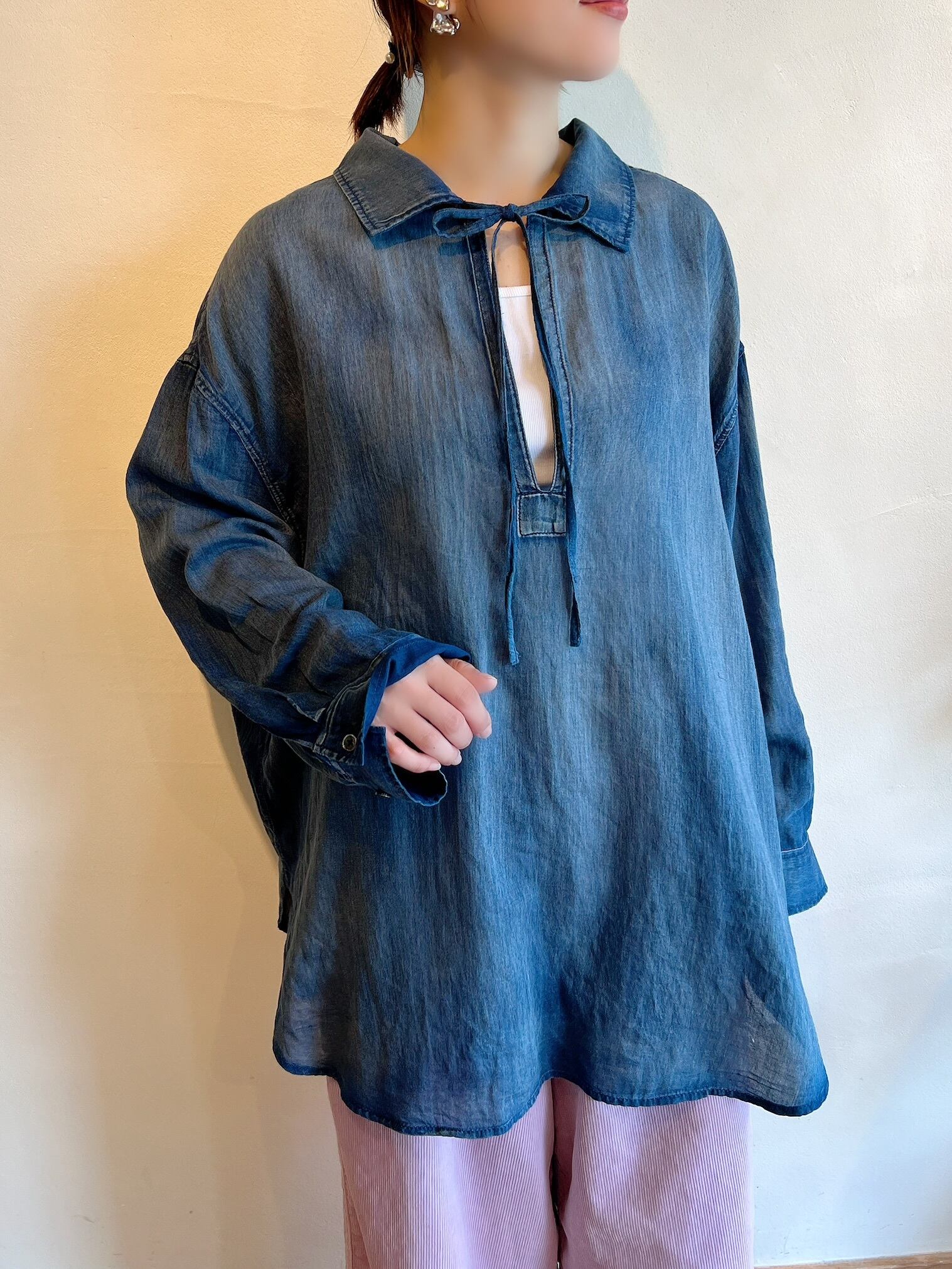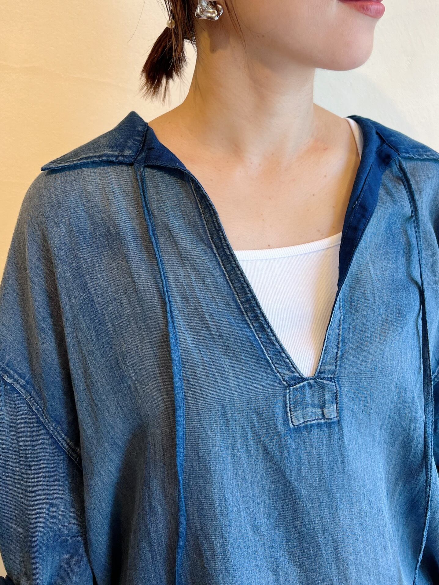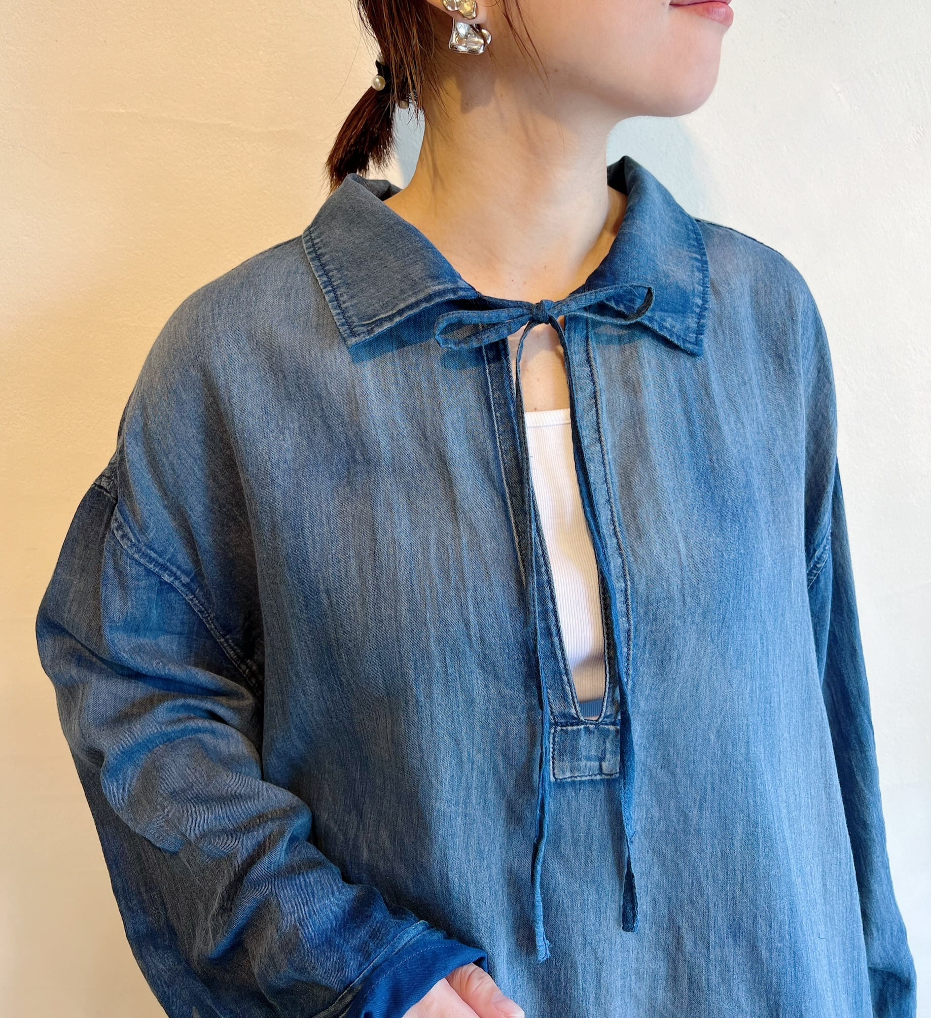 SOLD OUT シアーデニムシリーズからスキッパーブラウスが新登場しました!フロントのリボンを結んでも可愛いですし、結ばず垂らすスタイルもリラックス感のあるスタイリングで素敵です。スキッパーのデザインがお顔回りをスッキリと見せてくれて合わせるインナーによっても雰囲気が変わる着回し力抜群のブラウス。薄くサラッとした生地感なので合わせるインナーを変えて長い季節着ていただけます。