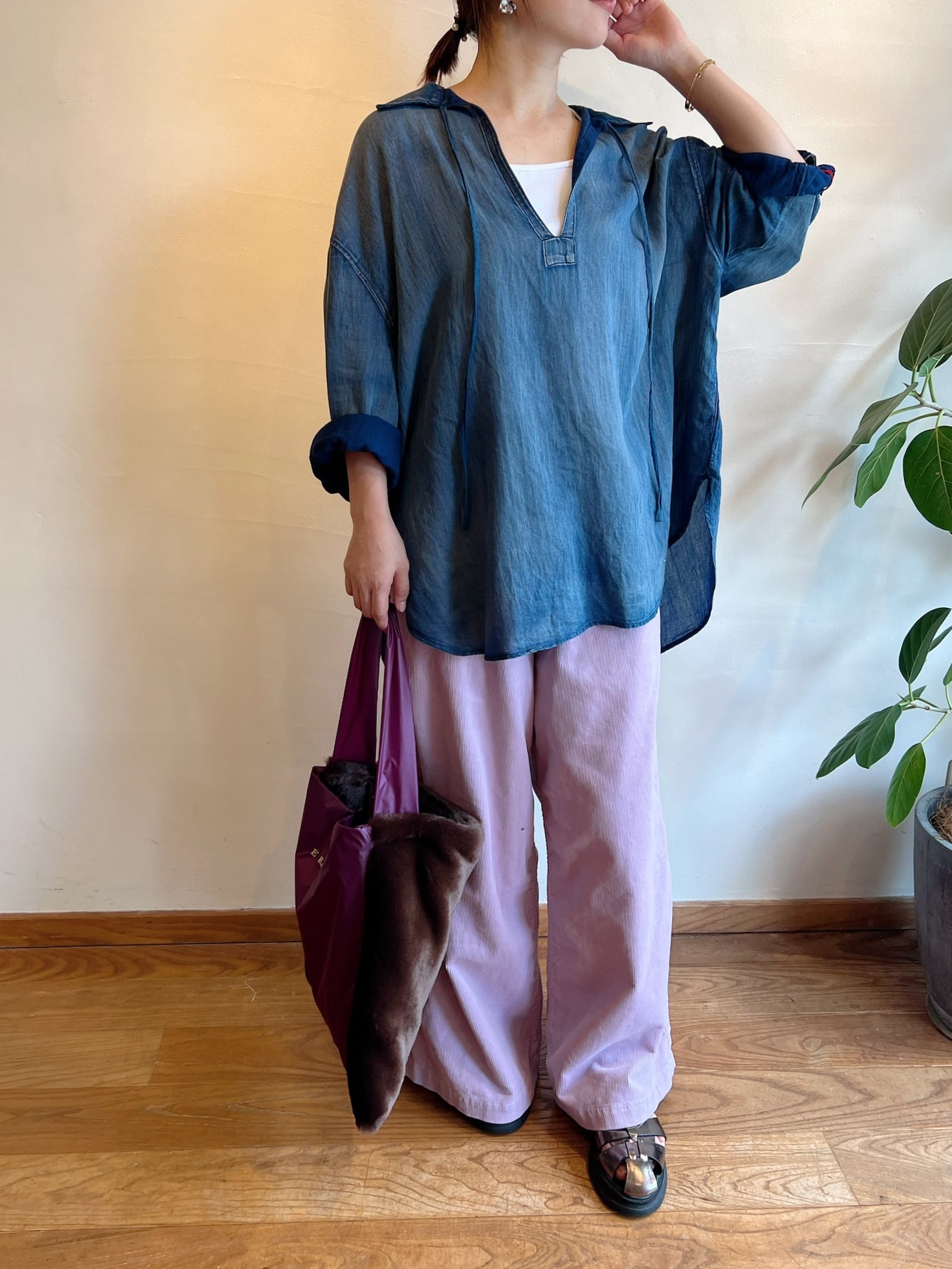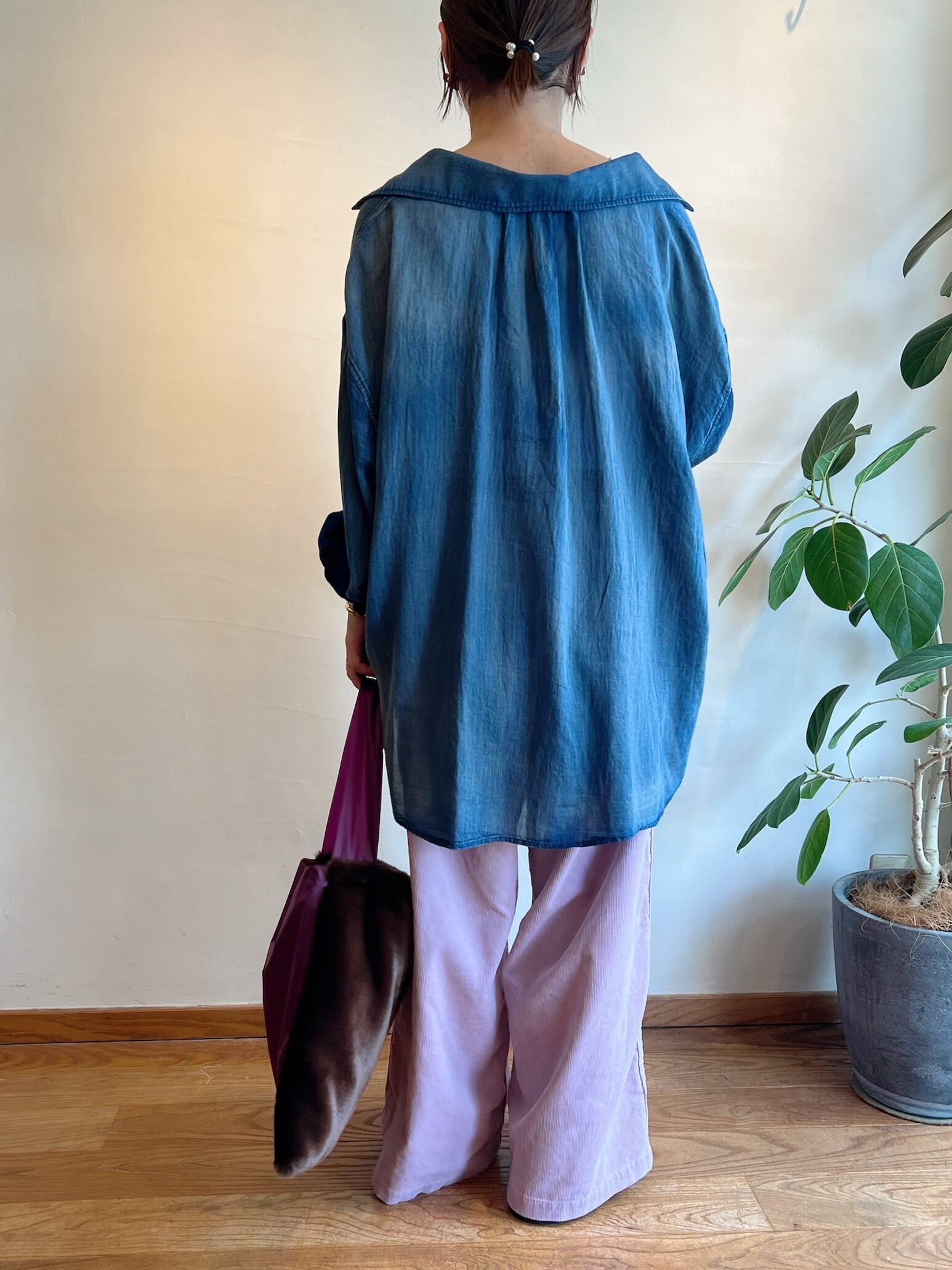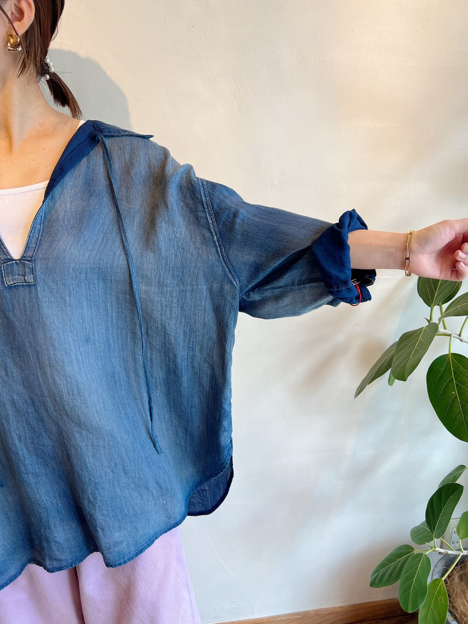 SOLD OUT シアーデニムシリーズからスキッパーブラウスが新登場しました!フロントのリボンを結んでも可愛いですし、結ばず垂らすスタイルもリラックス感のあるスタイリングで素敵です。スキッパーのデザインがお顔回りをスッキリと見せてくれて合わせるインナーによっても雰囲気が変わる着回し力抜群のブラウス。薄くサラッとした生地感なので合わせるインナーを変えて長い季節着ていただけます。