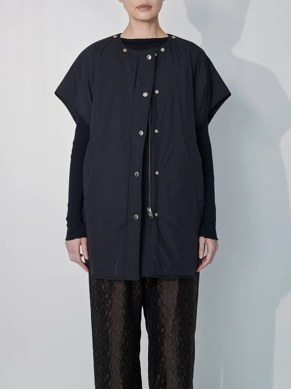 カタチは1枚で主役になる存在感のポンチョ。サイドのスナップ釦の付け方で、スリットやドレープをアレンジしたり、フードを外して、クルーネックにもできるのでスタイリングに変化もつけれる。表のタフタはエレガント、裏のキルティングはカジュアル、多くのシーンでも活躍できる一枚。