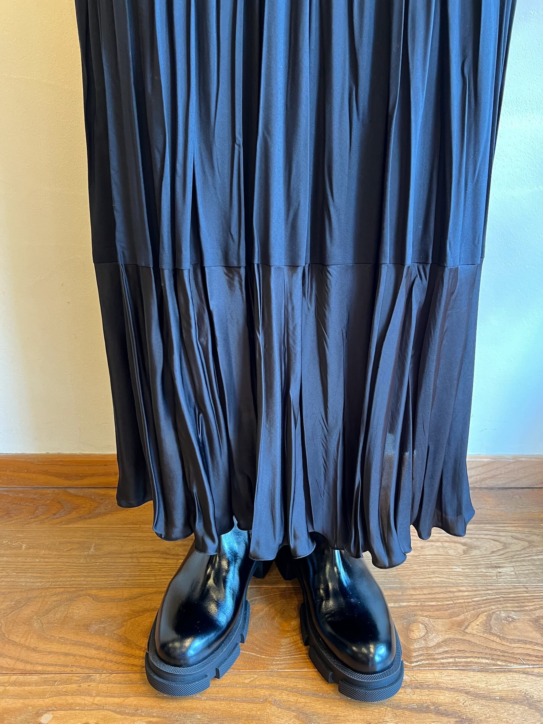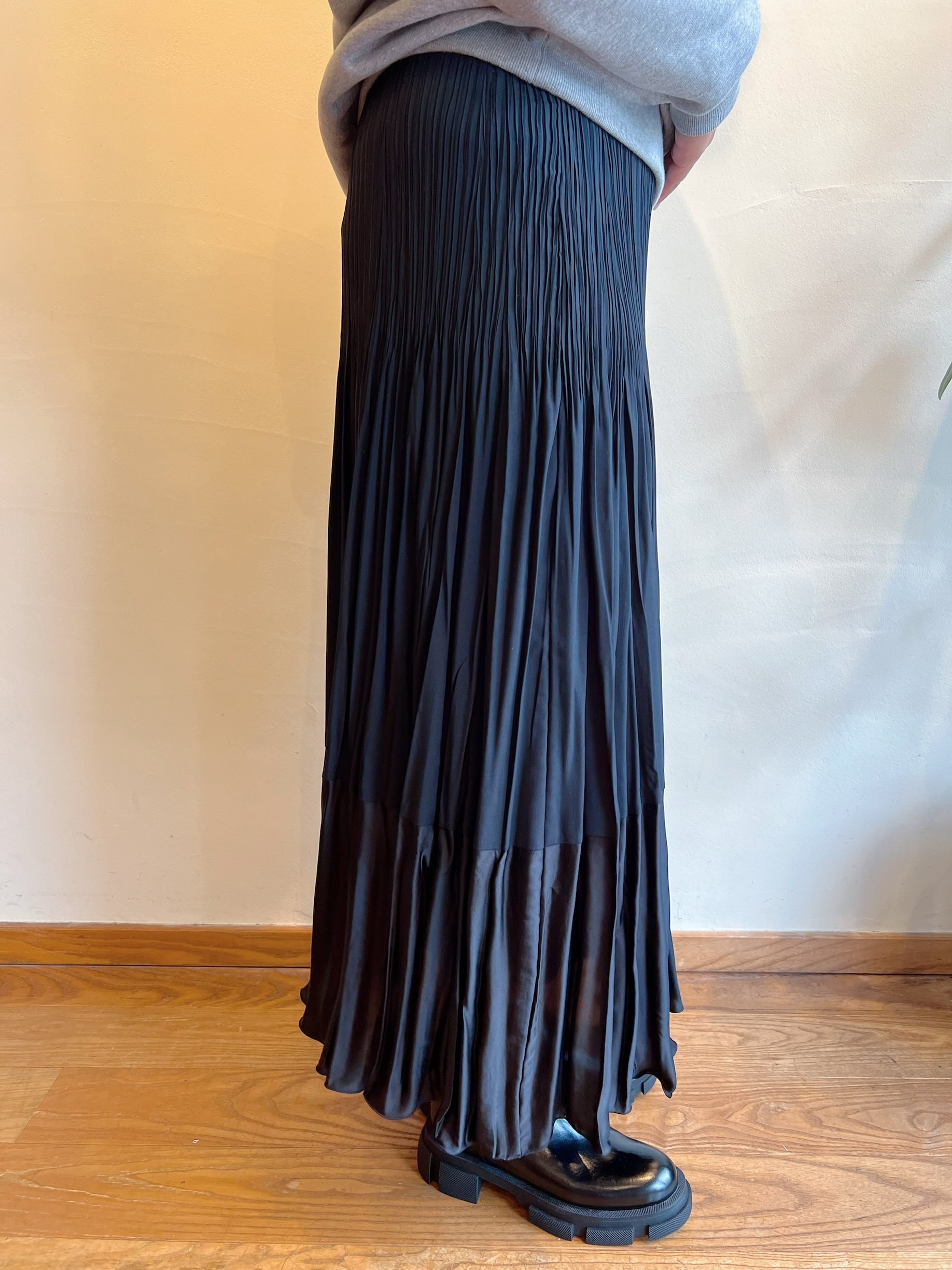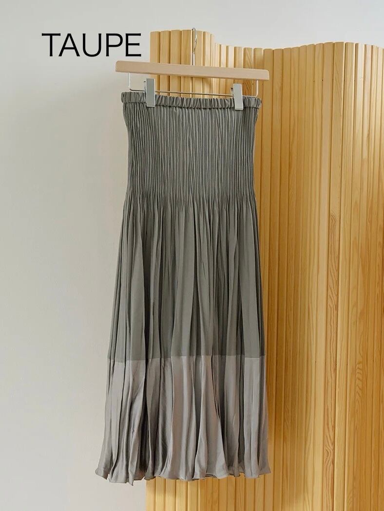 光沢感の異なる2種類の生地を組み合わせ、立体感と陰影を生み出したダブルプリーツスカートです。ウエスト下には細やかなプリーツを施し、裾にかけてランダムな広幅プリーツへと切り替えることで、広がりすぎずすっきりとしたシルエットに仕上げました。