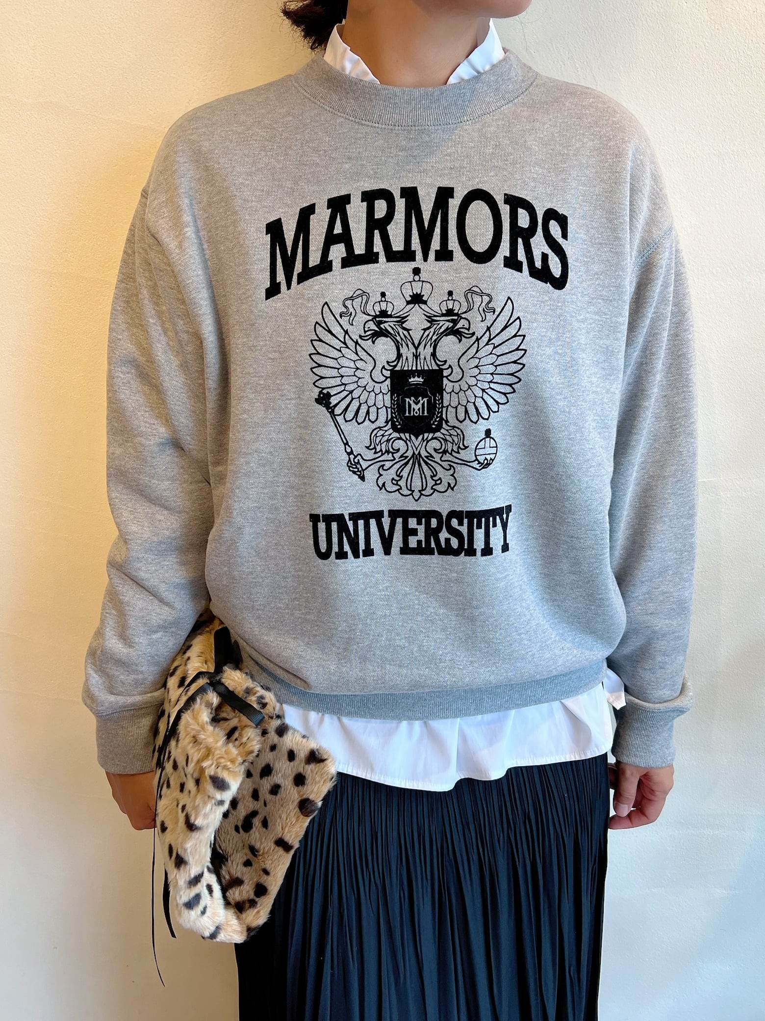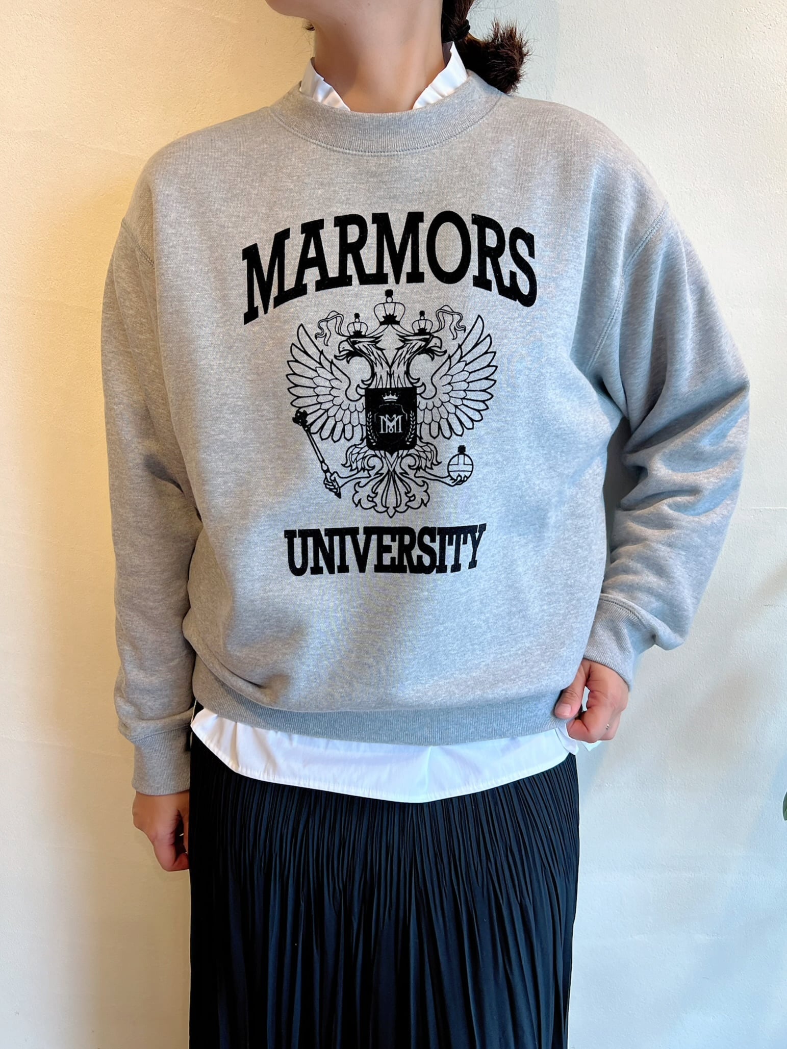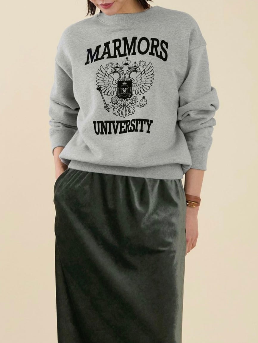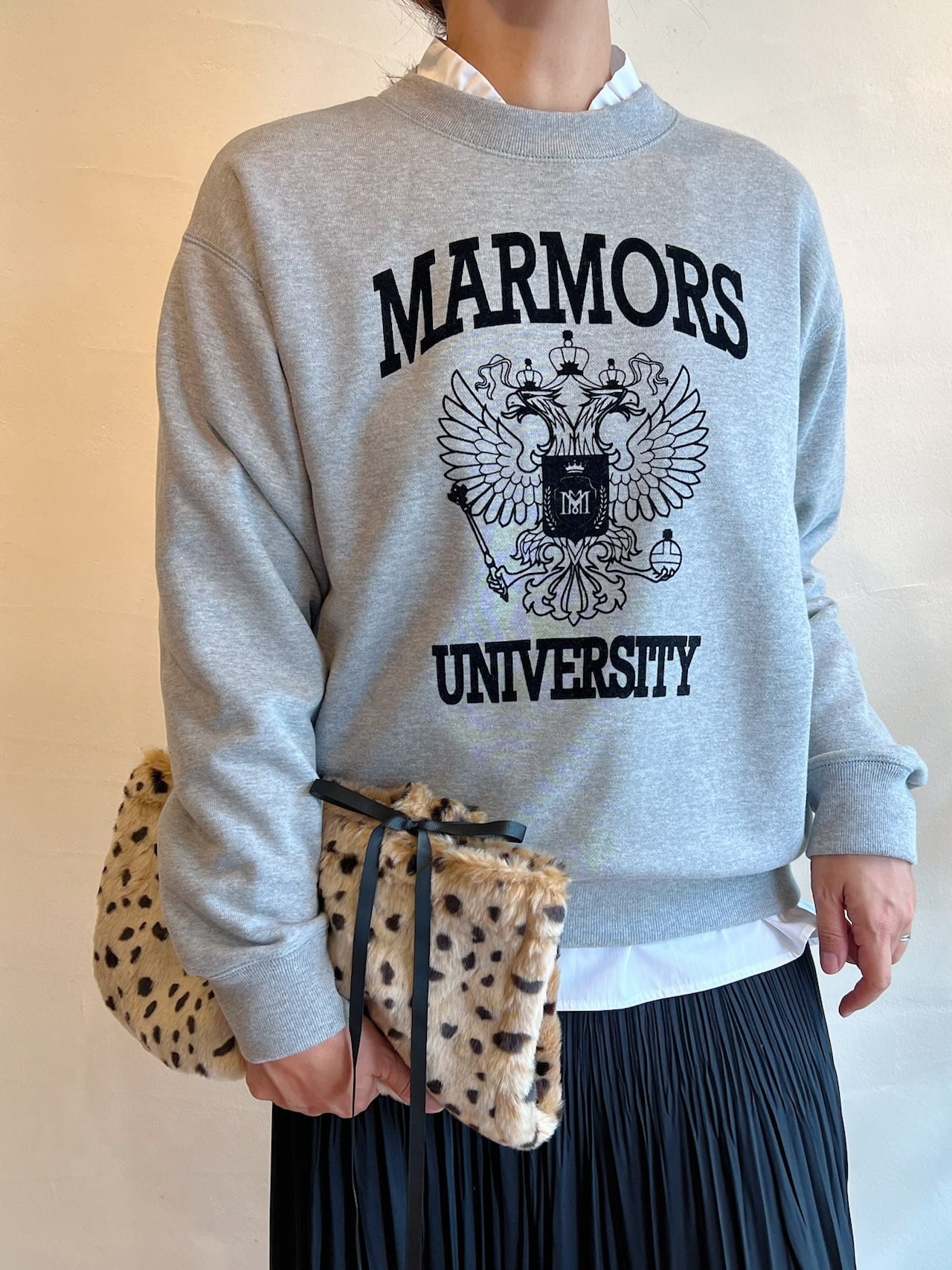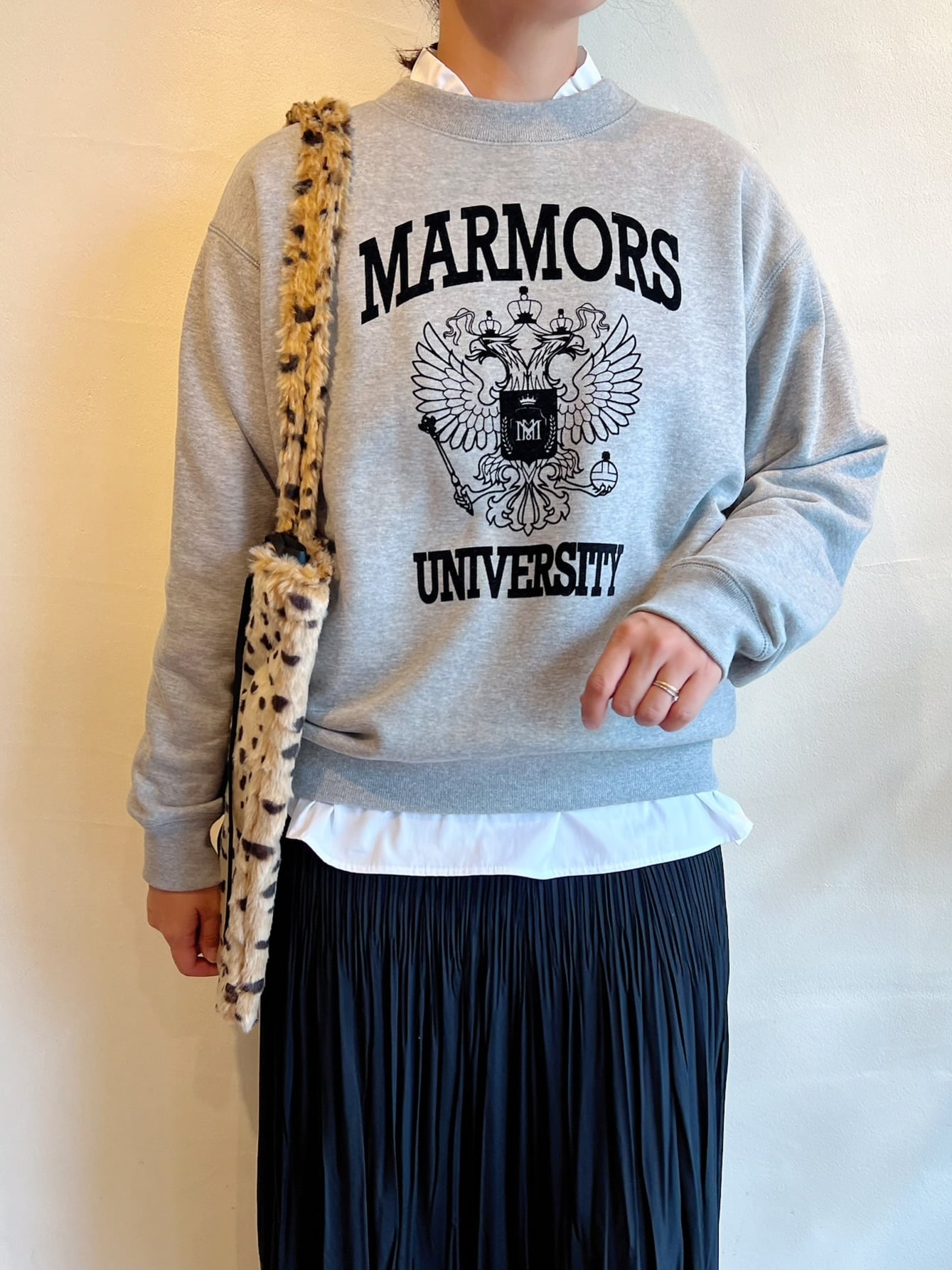 SOLD OUT 希少なアズマ裏毛を使用したエンブレムプリントスウェット。胸元に大胆にあしらわれたエンブレムプリントが存在感を放ちます。丸みのあるデザインで大人カジュアルな着こなしを楽しめます。