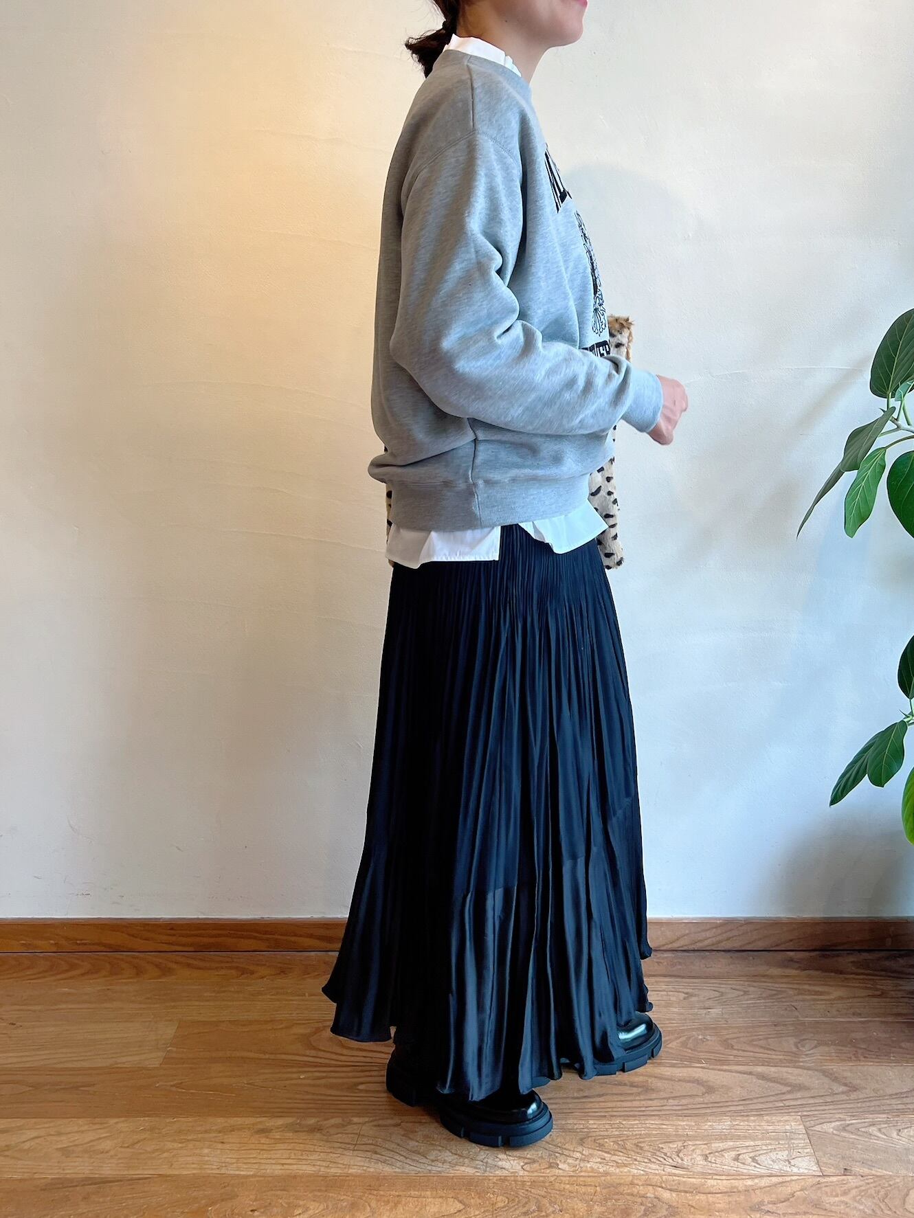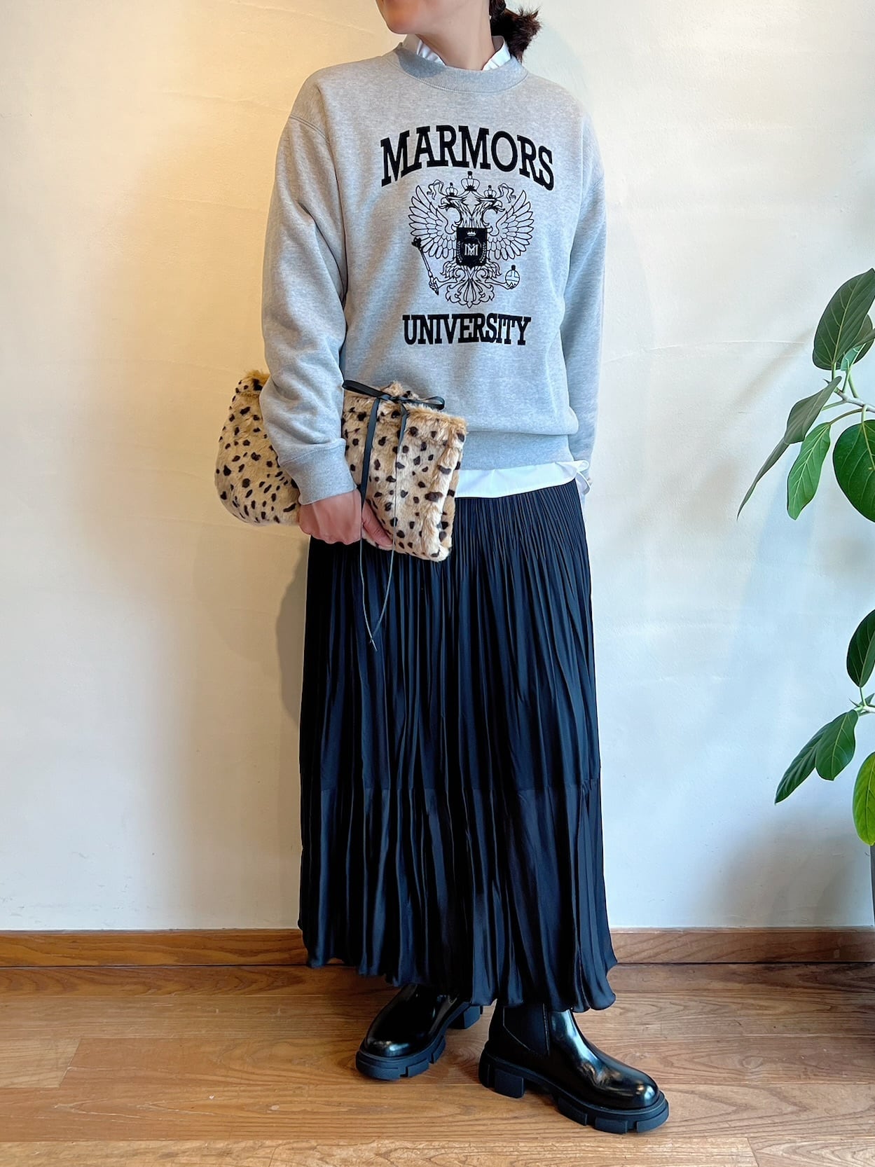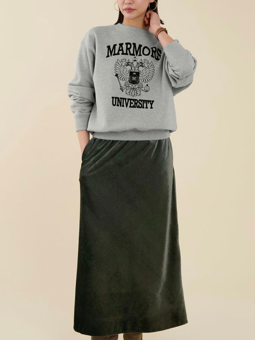 非常にゆっくりとしたスピードで編まれ、絶妙な風合いのふくらみのあるやわらかい生地感が特徴です。腰に掛かるほどのコンパクトな丈感で、コーディネートをすっきりと見せてくれます。大胆なエンブレムプリントが目を惹くデザインで、シーズンムード高まる素材感のボトムスと合わせるのがおすすめ。一枚で着てももちろん、インナーにロンTやブラウスを合わせて、抜け感のある着こなしも今年らしいです。