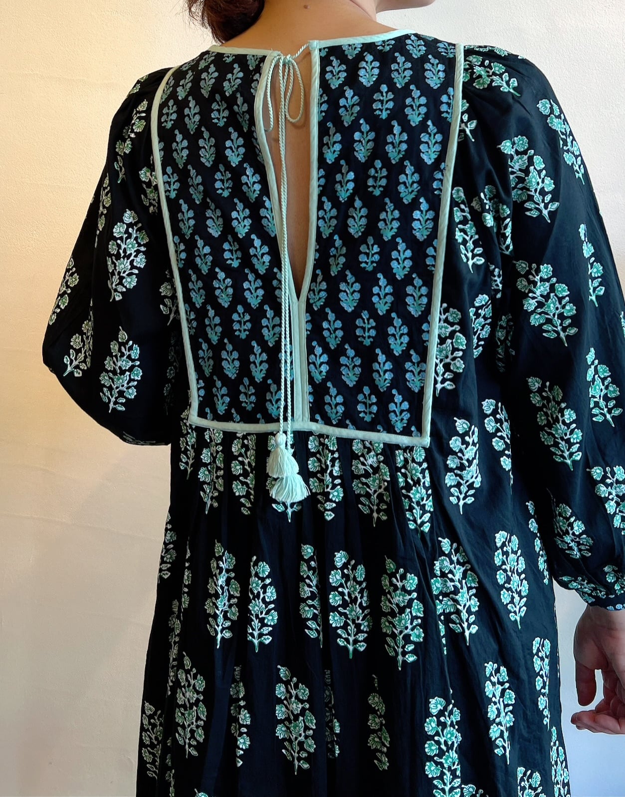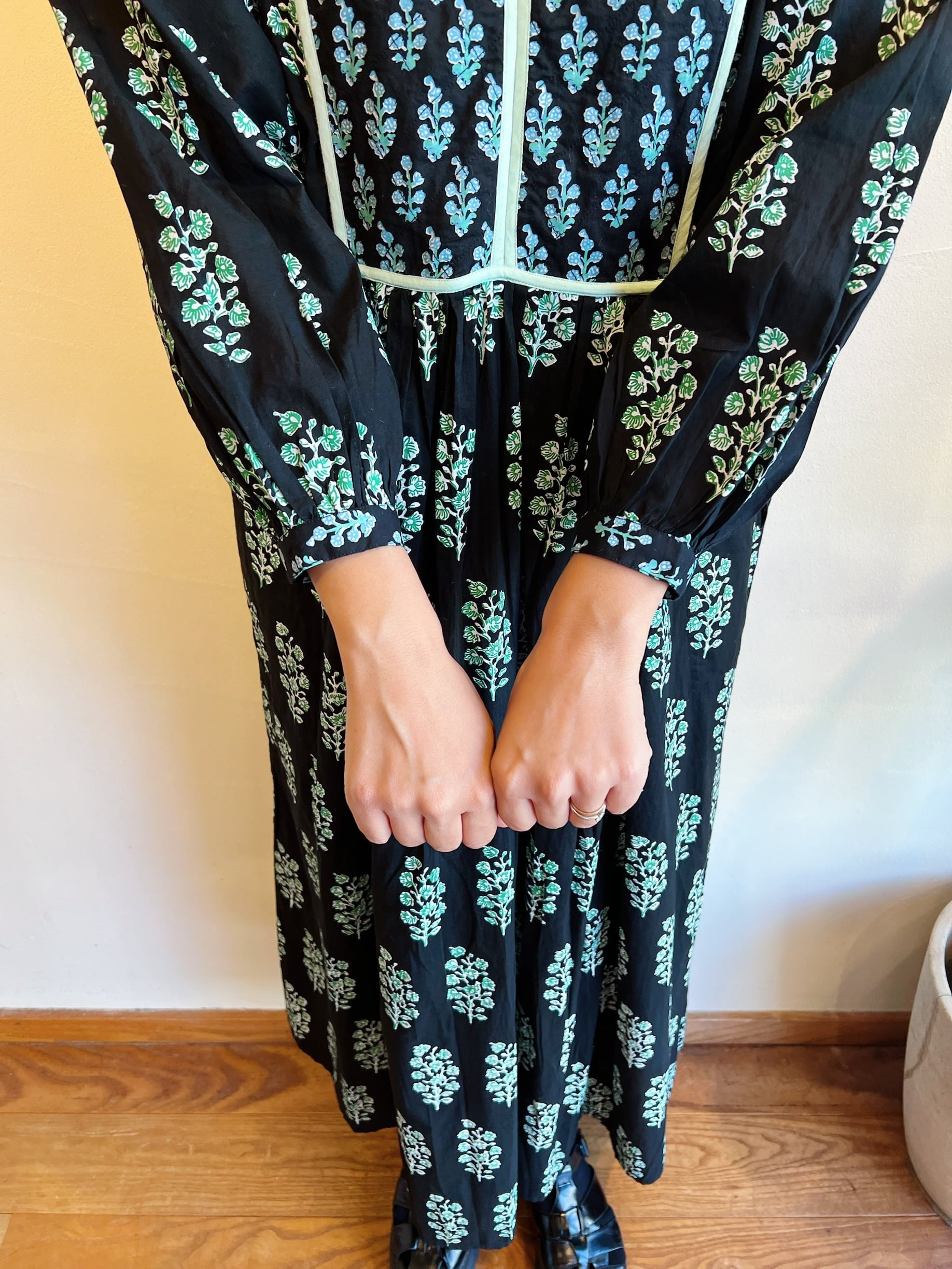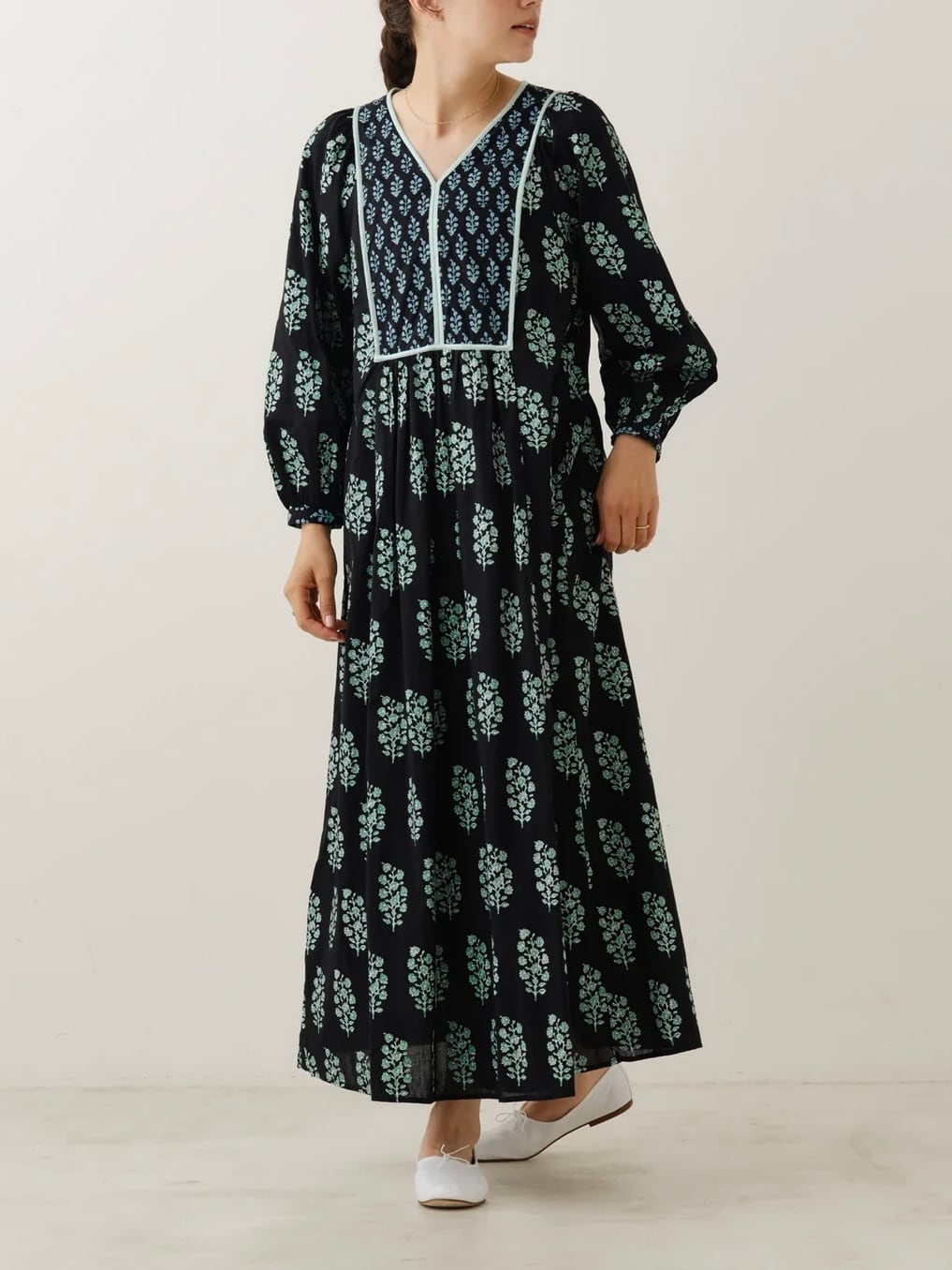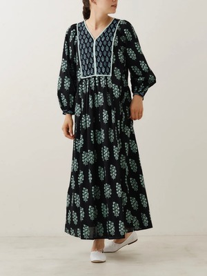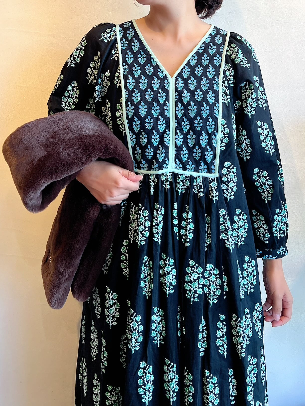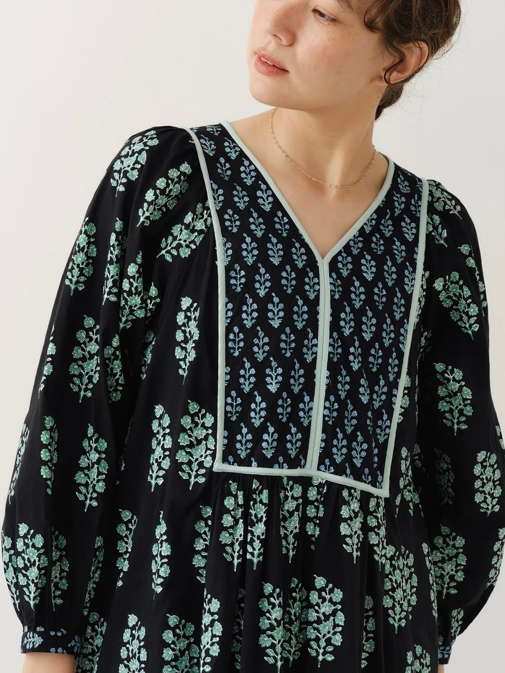 インド中央部の先住民族が描いたトライバルアート“ゴンド”にインスパイアされた色柄が目を引くエスニックドレス。大胆なモチーフ使いの3柄をミックスし、胸元をカラーパイピングで切り替えたデザインは、〈neQuittezpas〉らしい色彩センスが際立つ一枚。