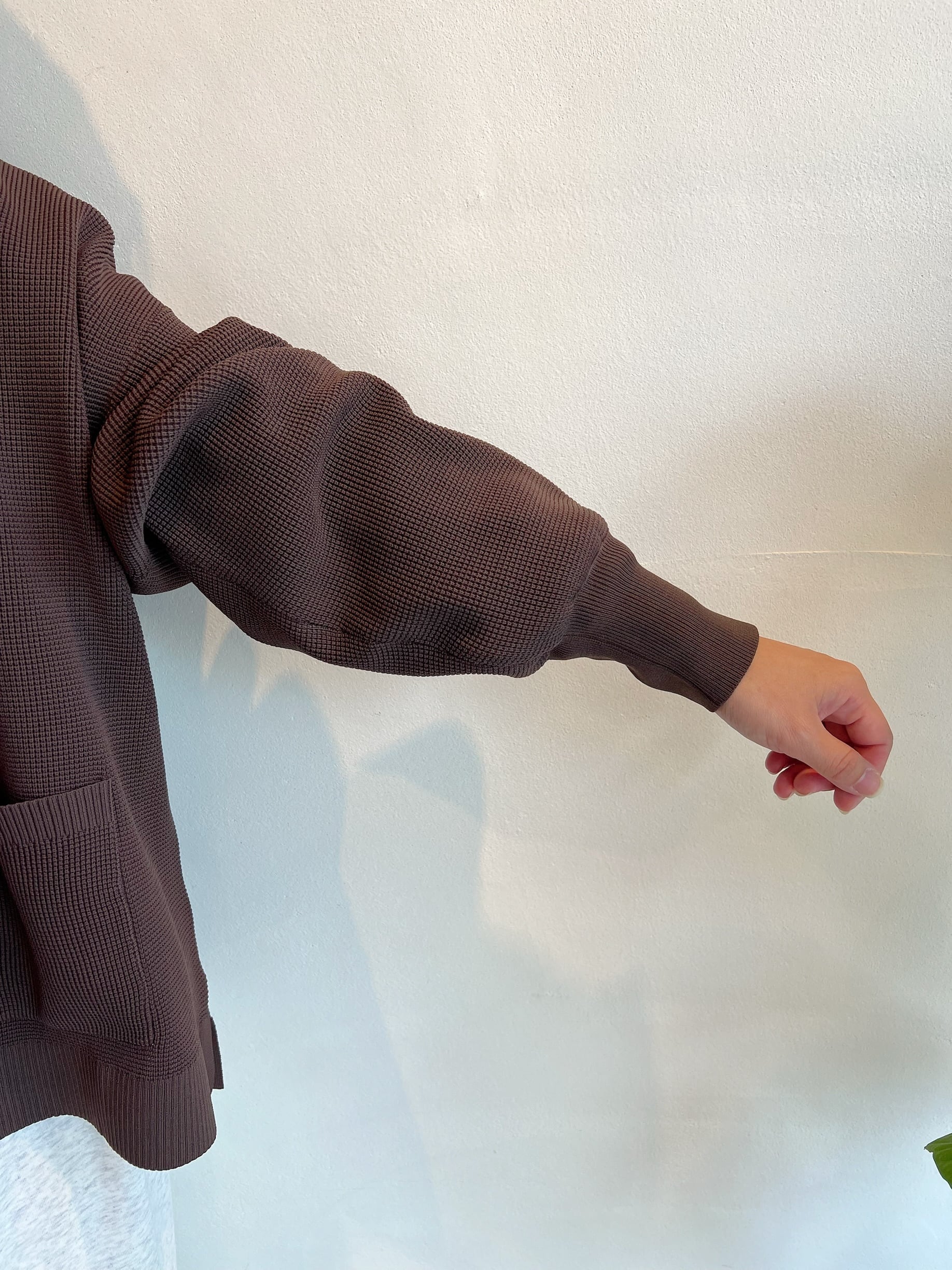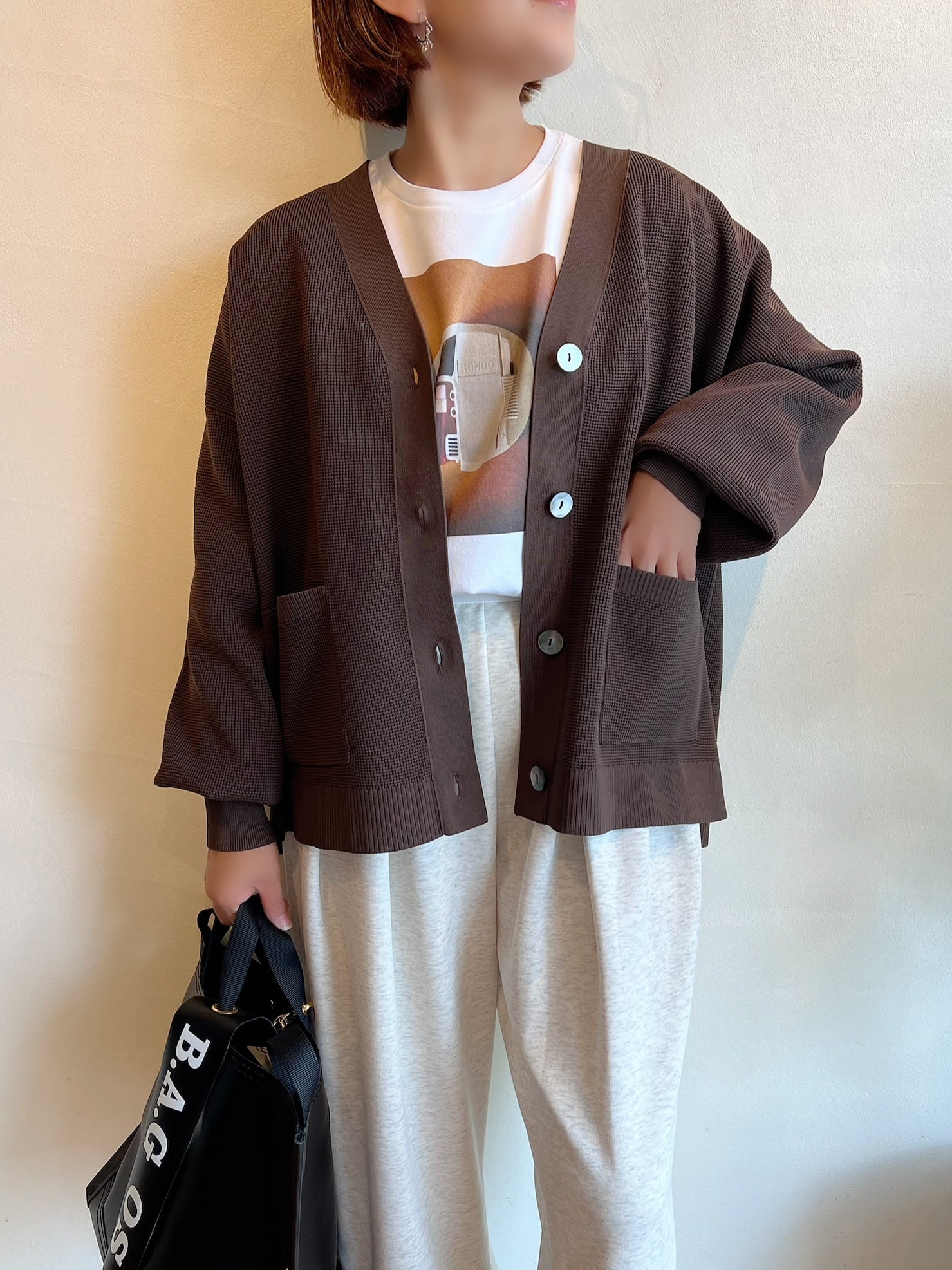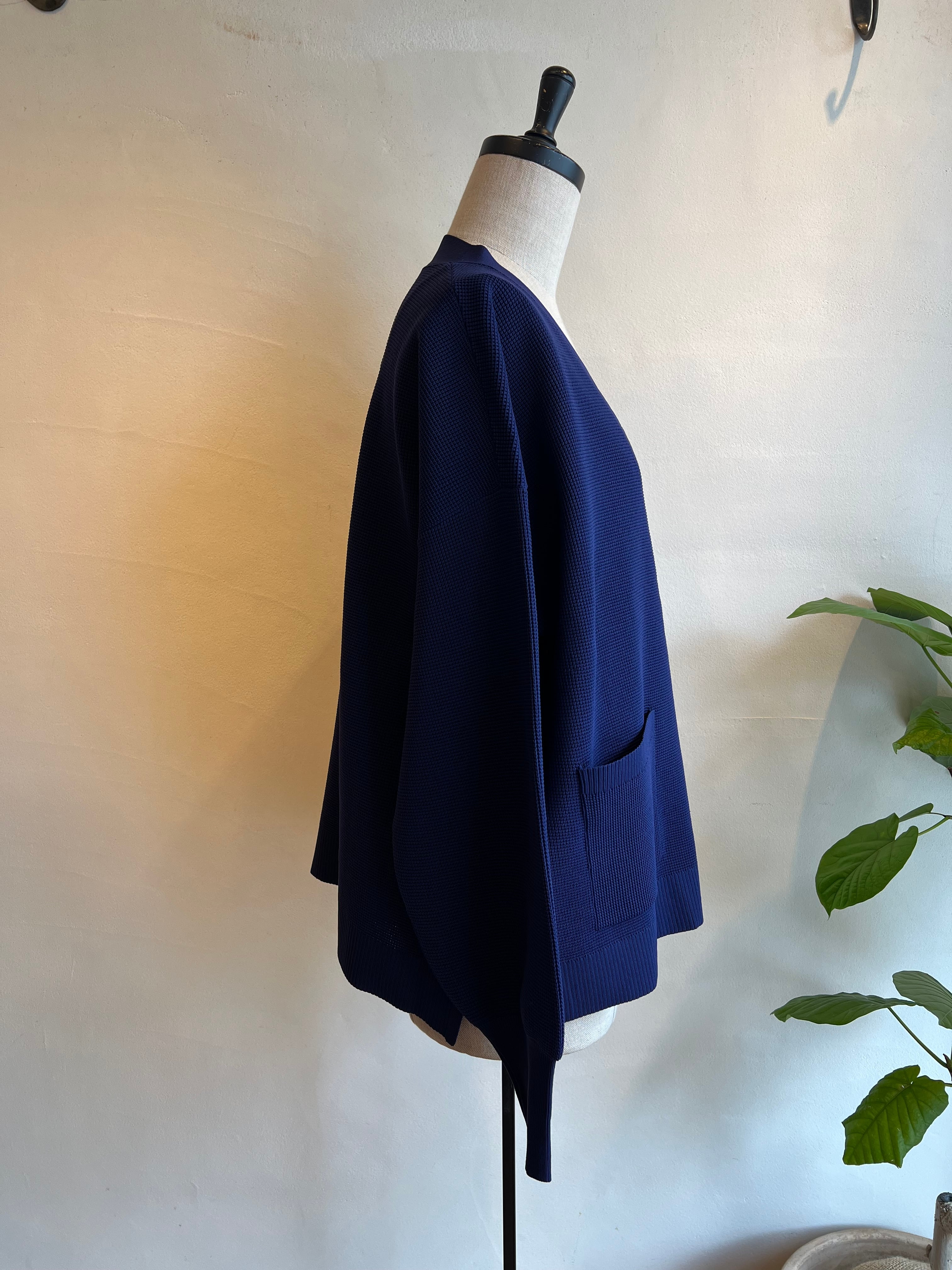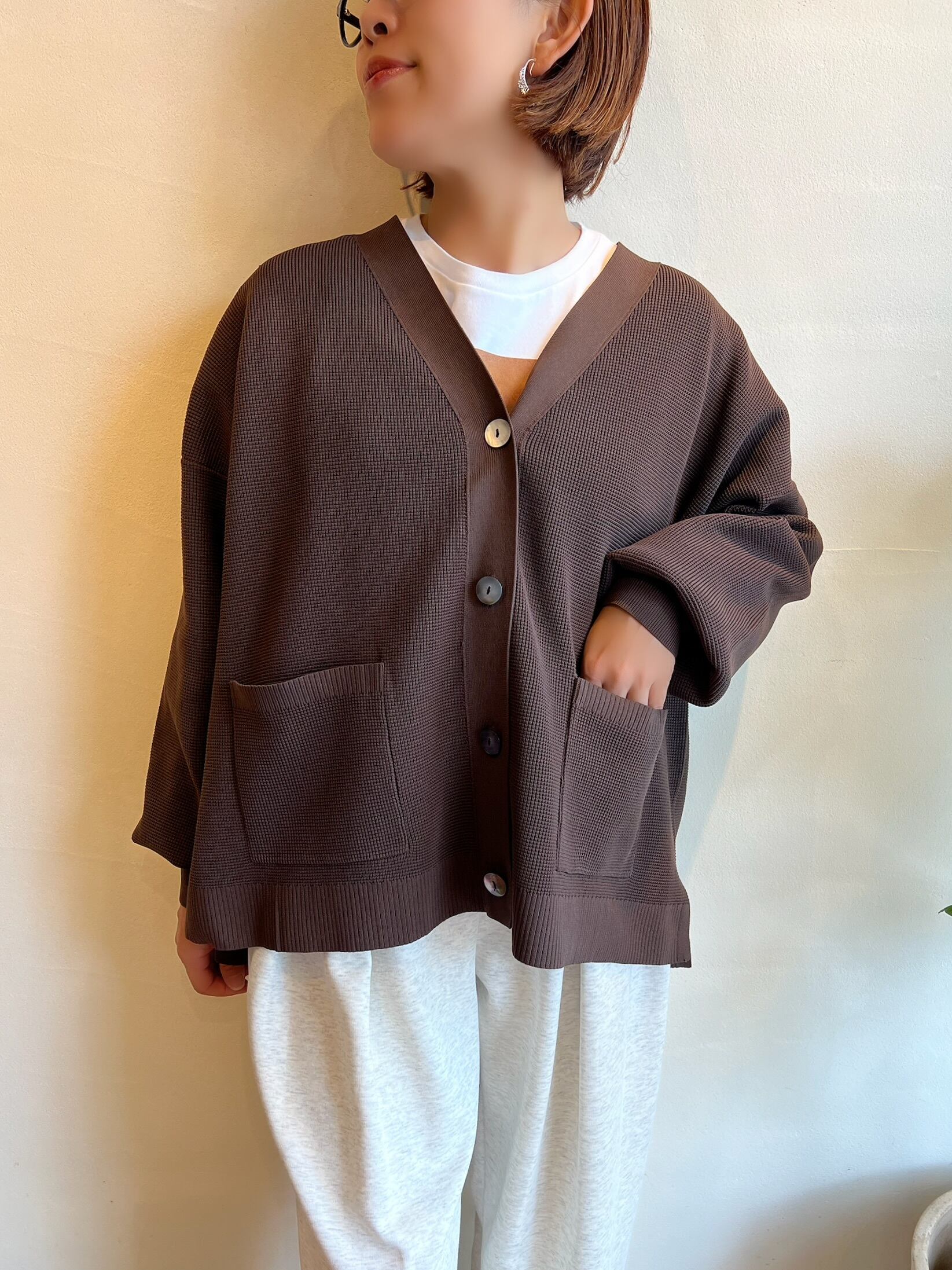 ハイテクニットシリーズ。大人気のハイテクニットカーディガンをベースに、生地をより伸びやかでレイヤードしやすいワッフル化しました。型崩れ、ピリングにも強く、おまけに洗濯機で洗える、まさにヘビロテする為に生まれたカーディガンに仕上げています。ベーシック好きには是非お試しして頂きたいカーディガンです。