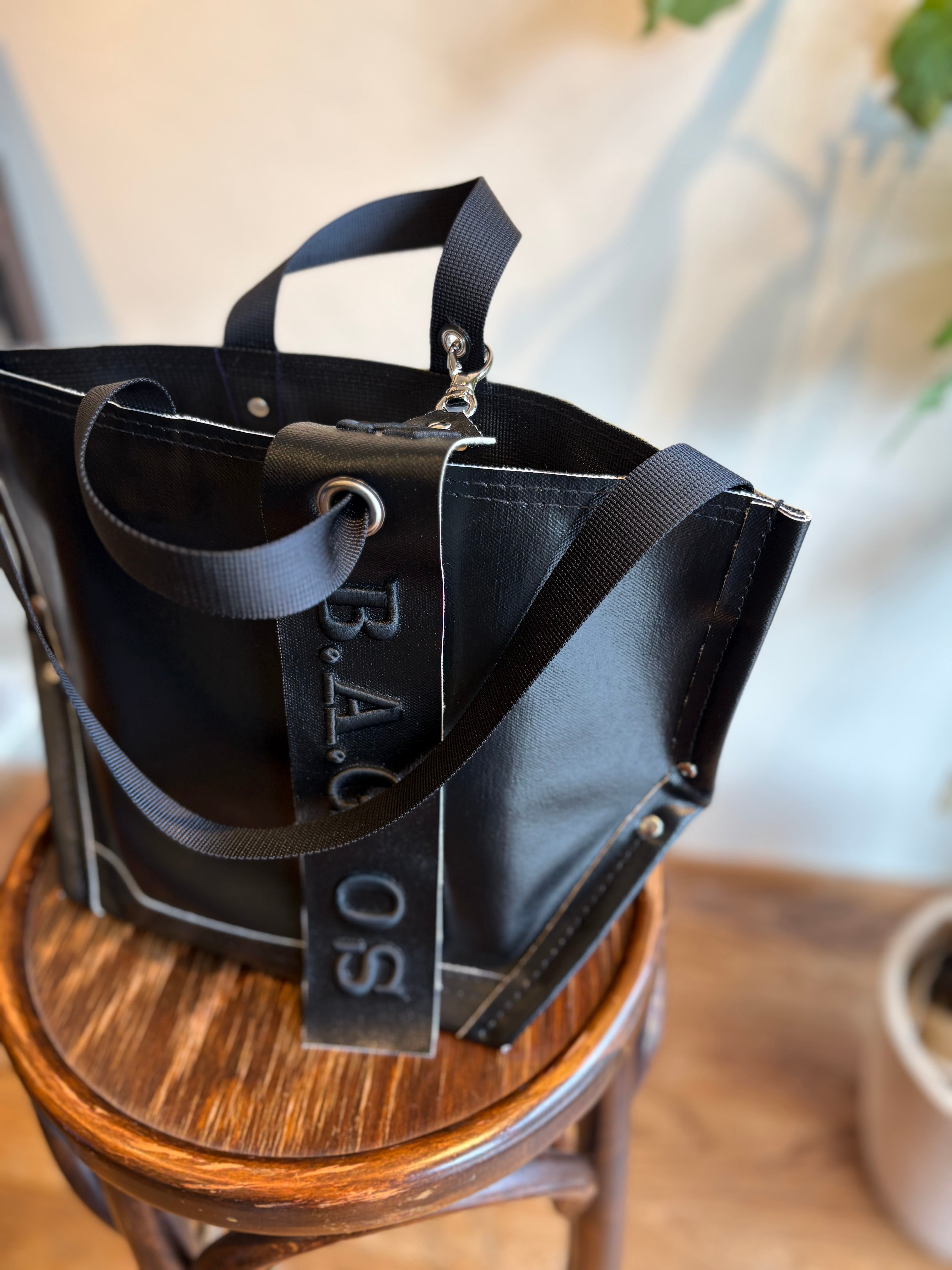 3D刺繍を施されたEBAGOSテープ先のナスカンに鍵等を付けたり背胴にかけることにより口閉じにもなります。畳んで収納することが出来ます。キャンバスは8号倉敷帆布を使用し革のランドセル塗装の技術を使い、ポリカ―ボネイトで仕上げたキャンバスです。全て手作業で行われます。