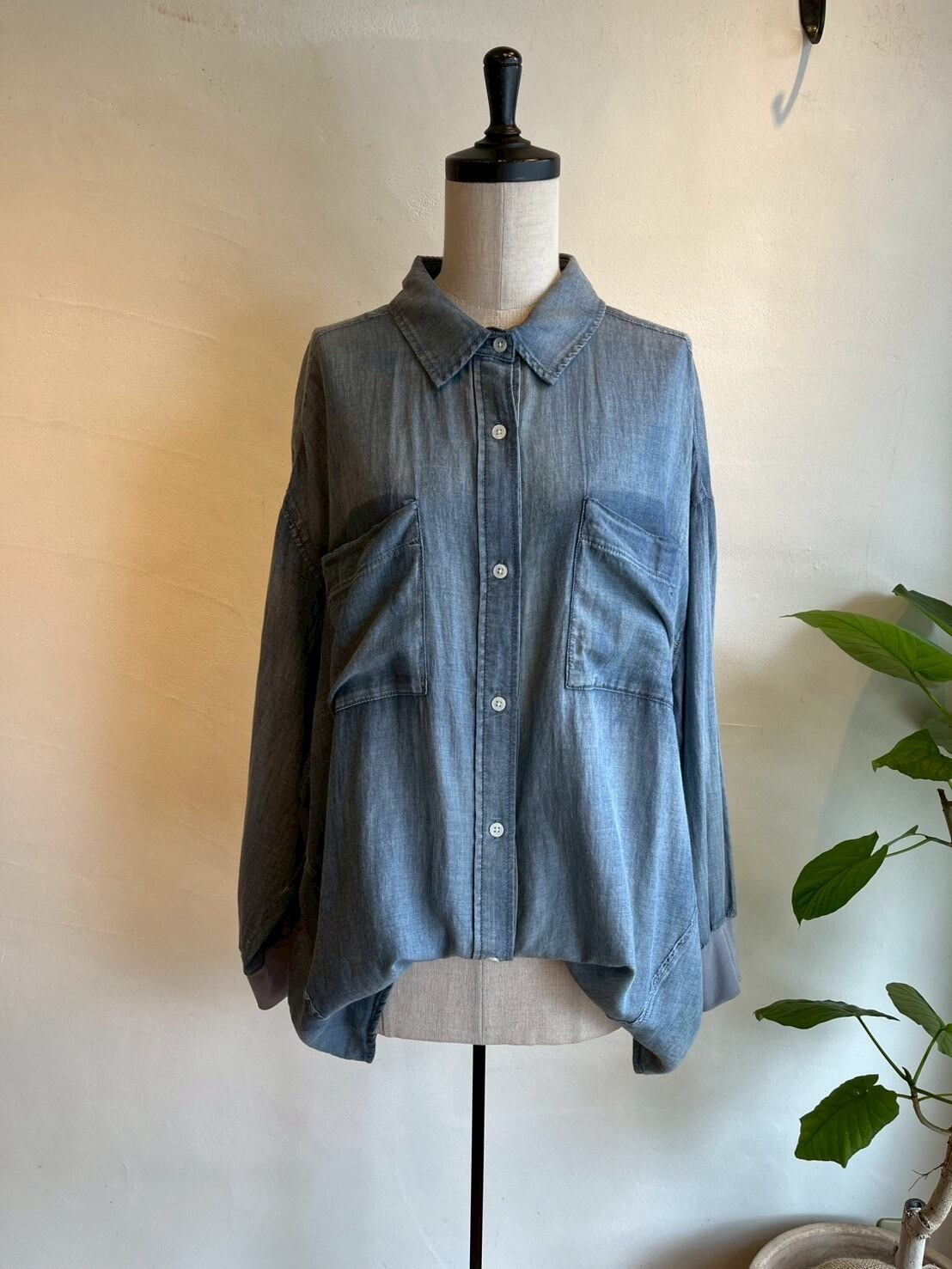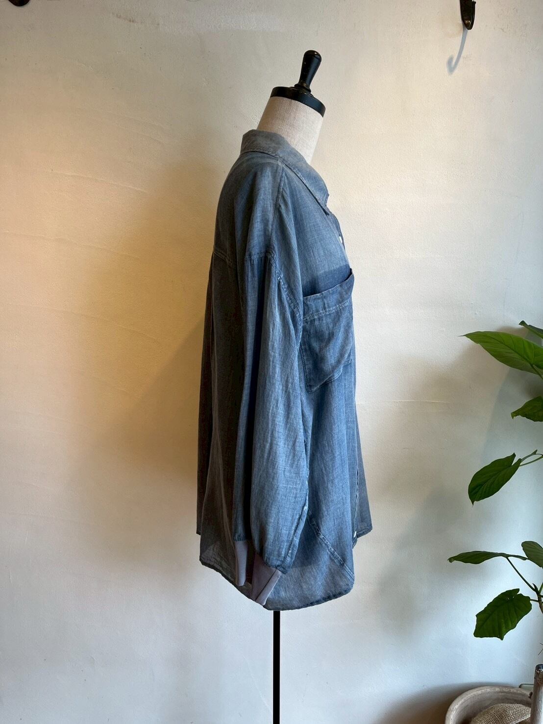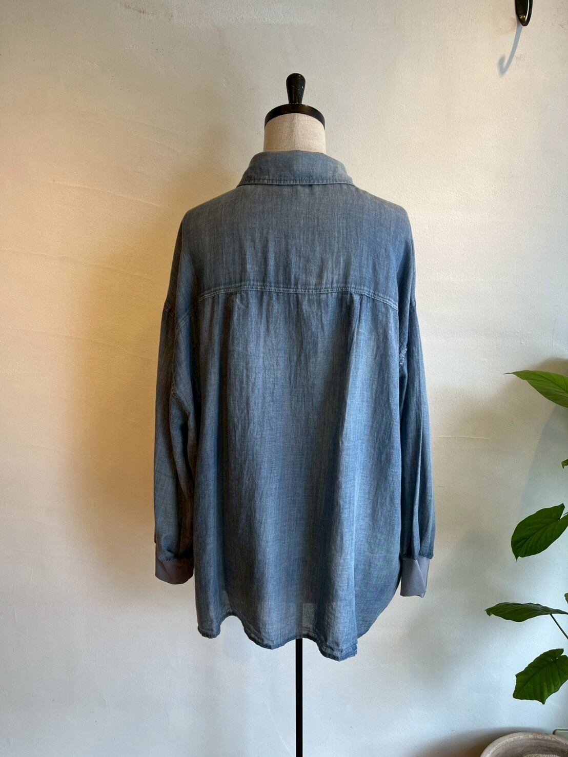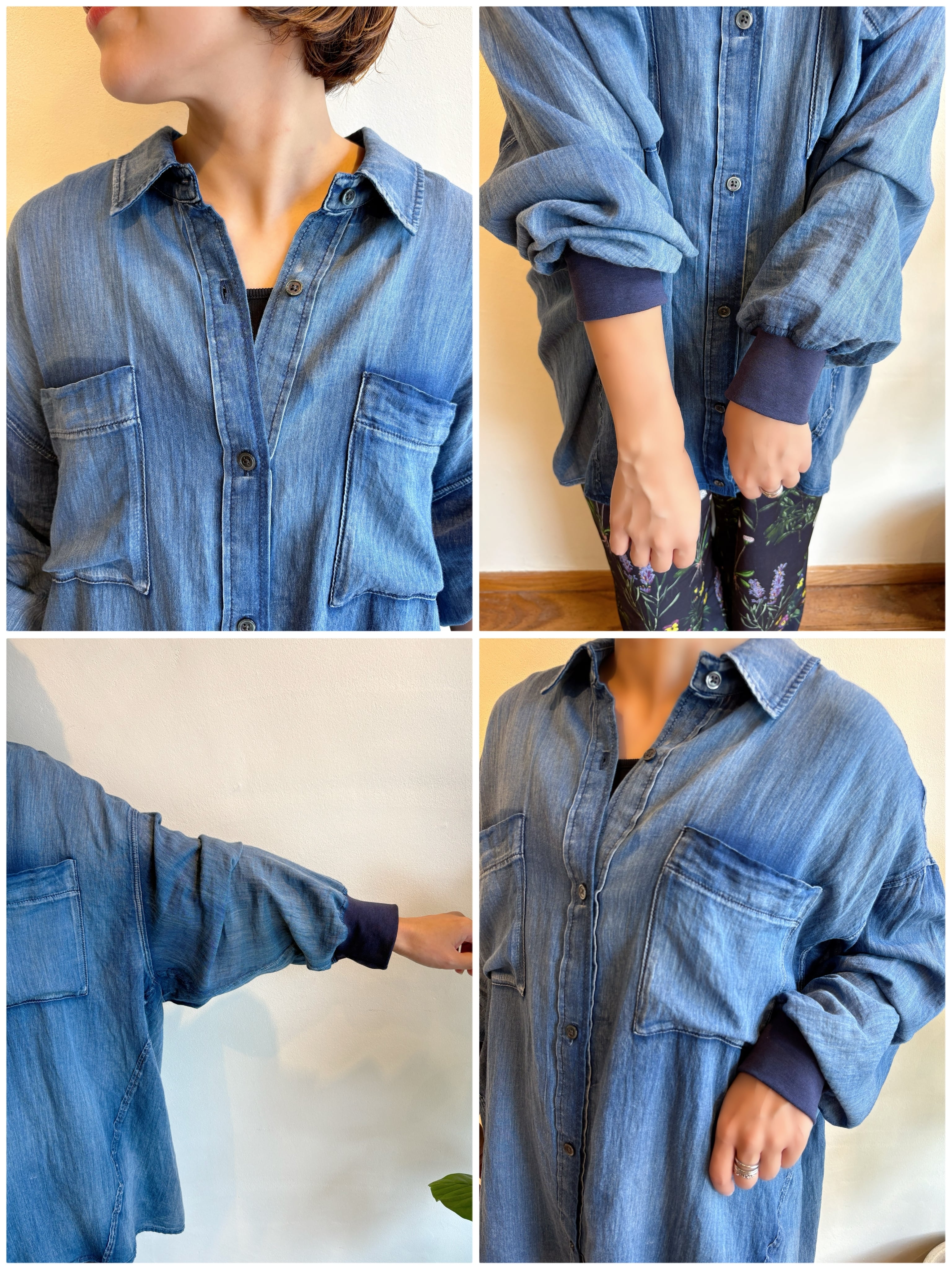 SOLD OUT シアー感のあるデニムの素材で、新鮮に見せてくれるデニムシャツ。お袖はリブ素材に仕上げ、さっとお袖を上げて快適に着用できます。裾を内側に入れ込み、内側のボタンを留めることでぽわんと丸みのあるインしたようなスタイルを作り上げることができます。(内側ボタンは2段階)そのまま着るのも、アレンジして着るのもどちらも楽しめるマルチWAYな仕様が楽しい1着です。いつものデニムシャツスタイルを新鮮に見せてくれる1着です。