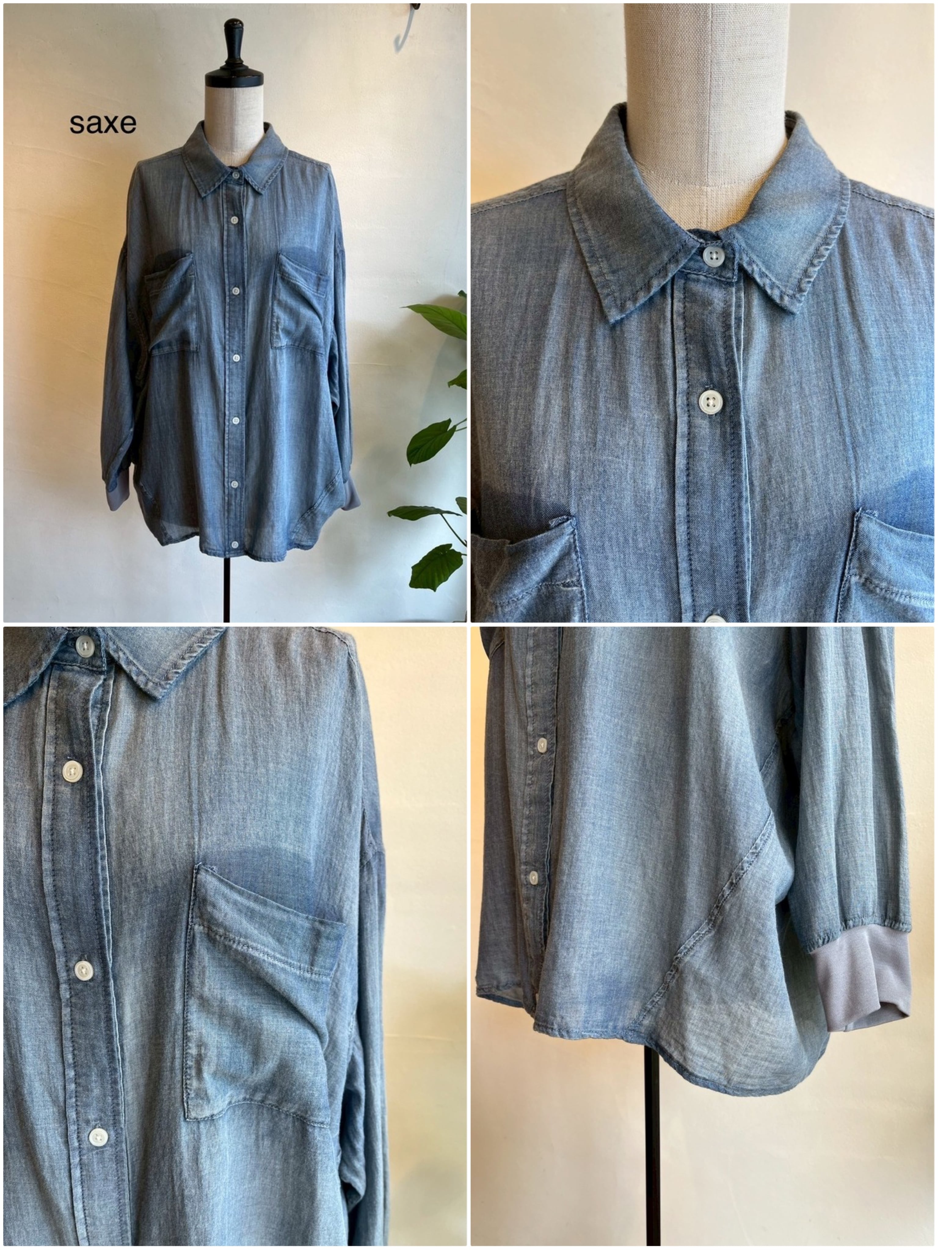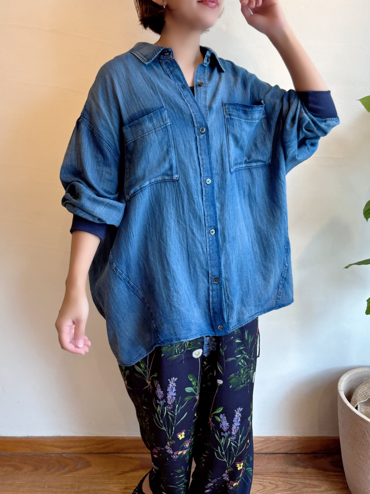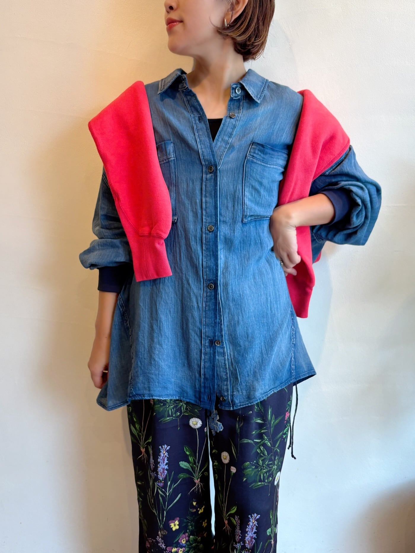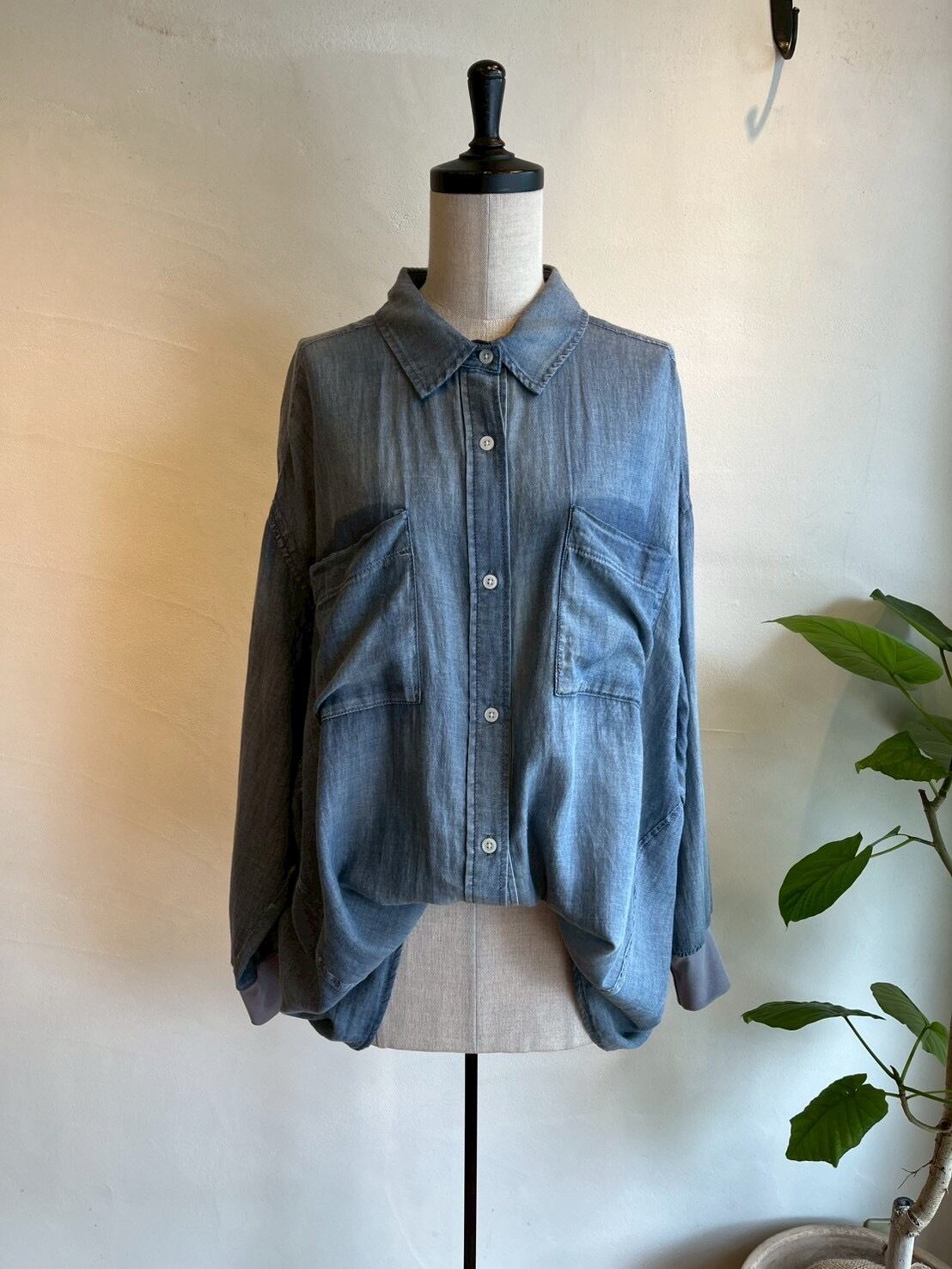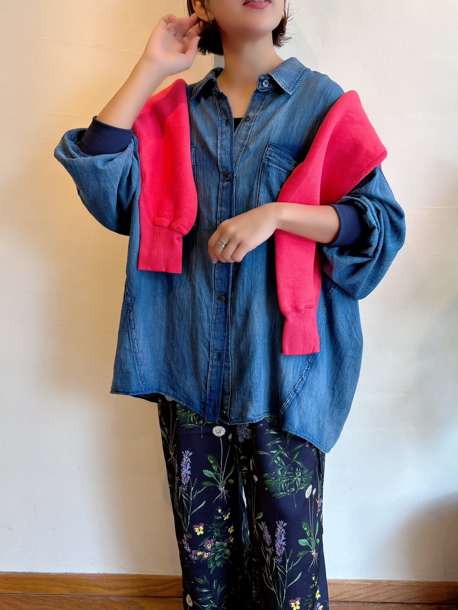 SOLD OUT シアー感のあるデニムの素材で、新鮮に見せてくれるデニムシャツ。お袖はリブ素材に仕上げ、さっとお袖を上げて快適に着用できます。裾を内側に入れ込み、内側のボタンを留めることでぽわんと丸みのあるインしたようなスタイルを作り上げることができます。(内側ボタンは2段階)そのまま着るのも、アレンジして着るのもどちらも楽しめるマルチWAYな仕様が楽しい1着です。いつものデニムシャツスタイルを新鮮に見せてくれる1着です。