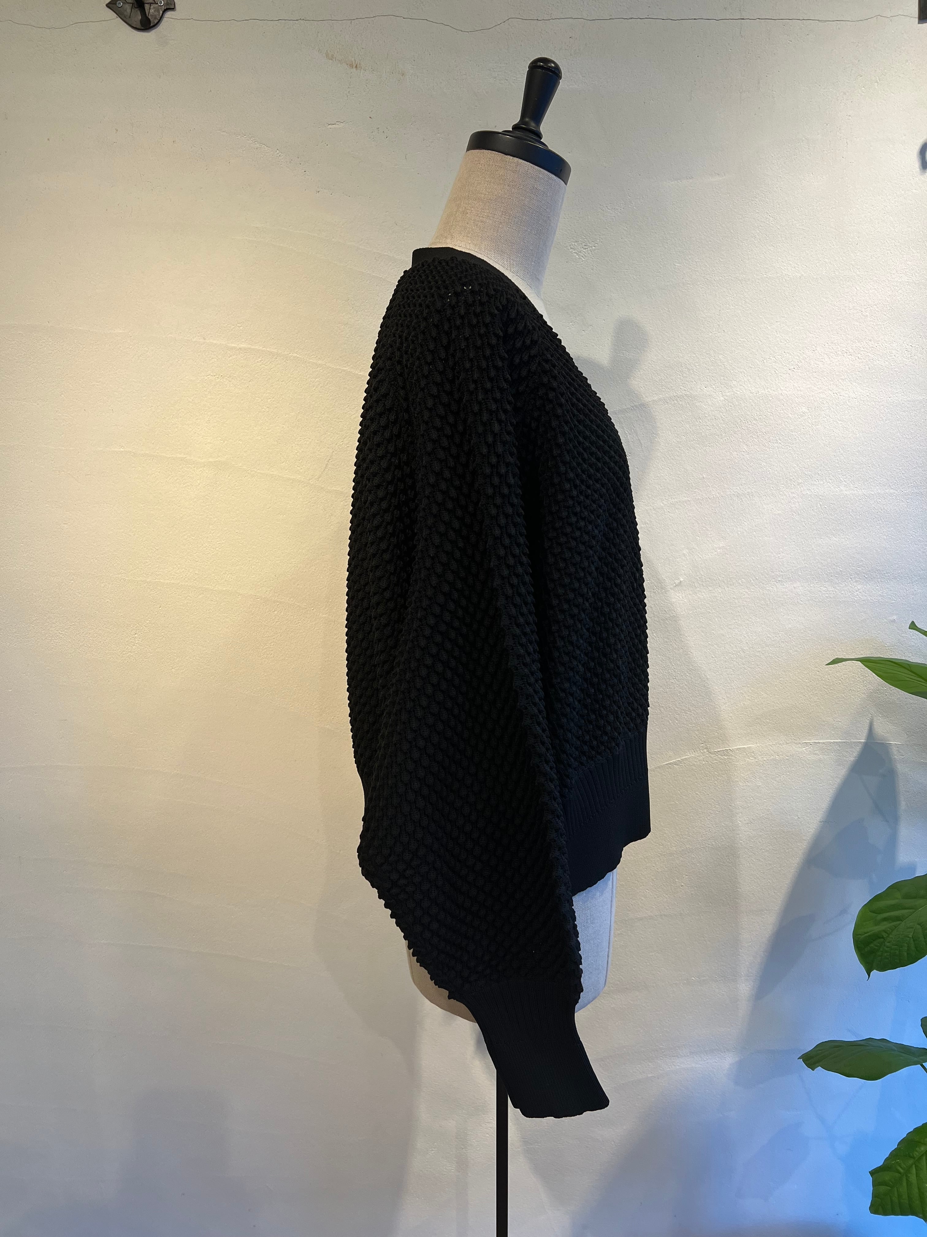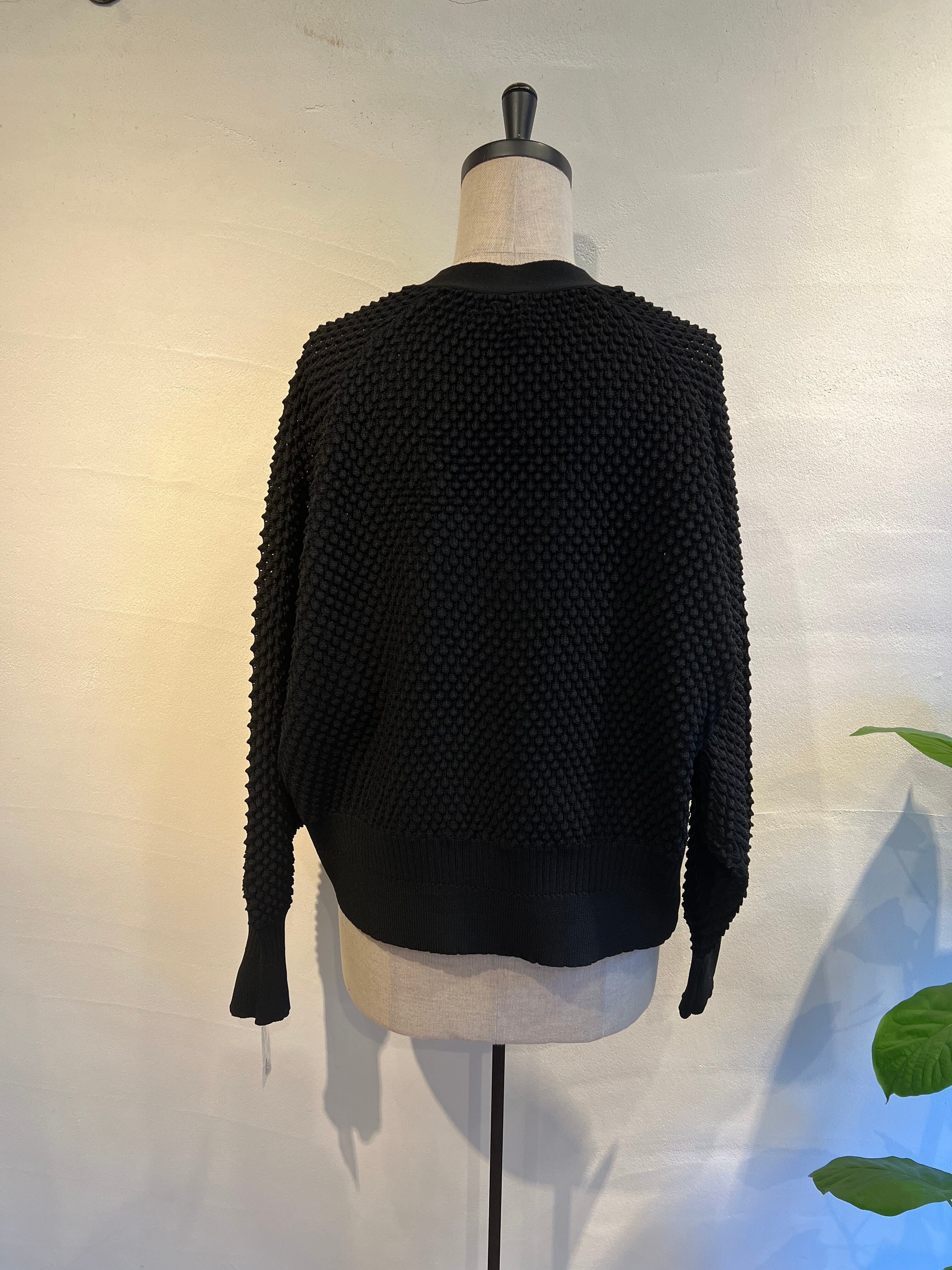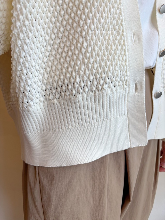 袖口、裾のリブは編み目が異なりこだわりを感じます。素材がポリエステルなので、軽くてシワになりにくく、毛玉もできにくく、手洗いも可能と優秀なカーディガンです。