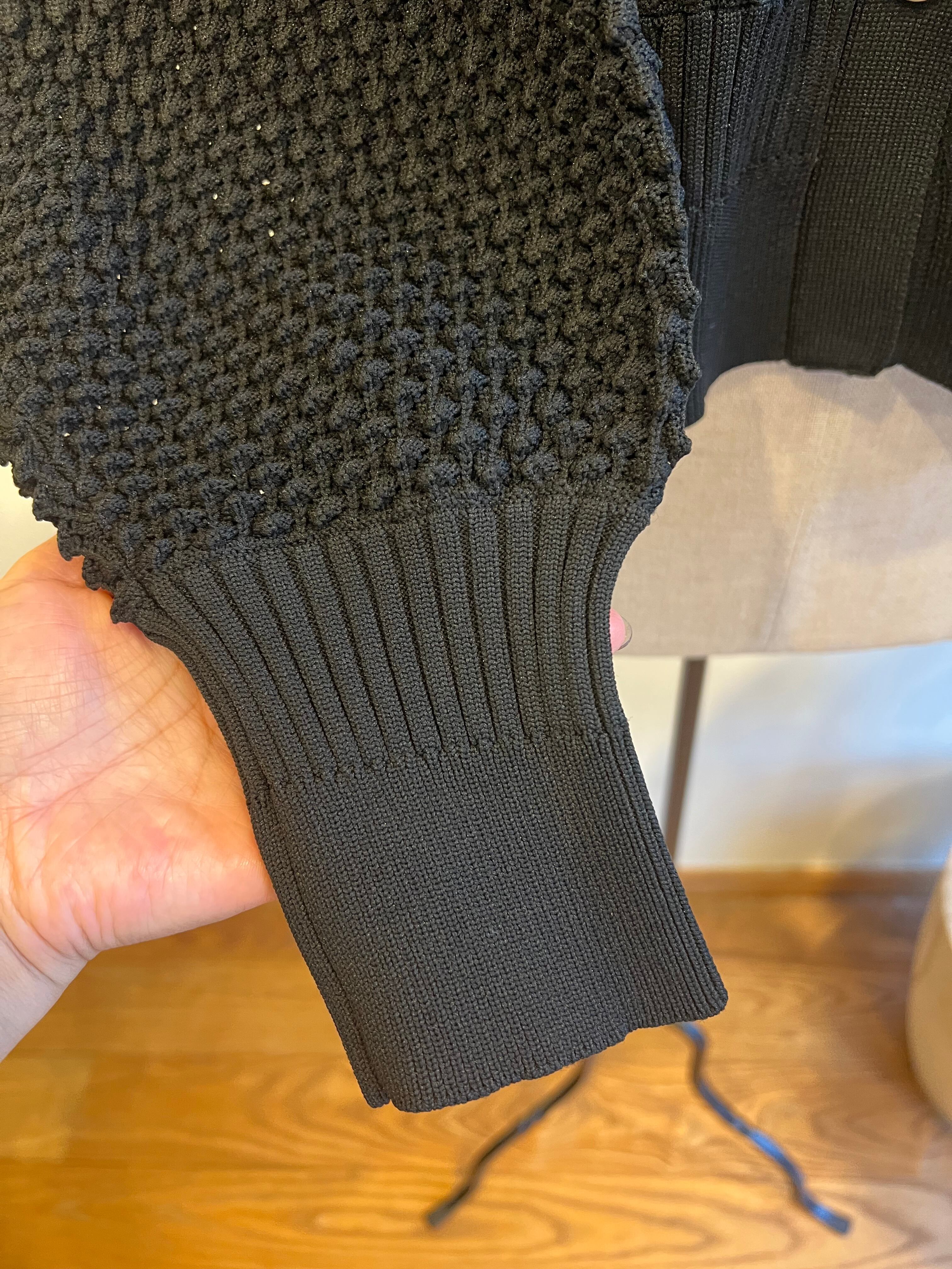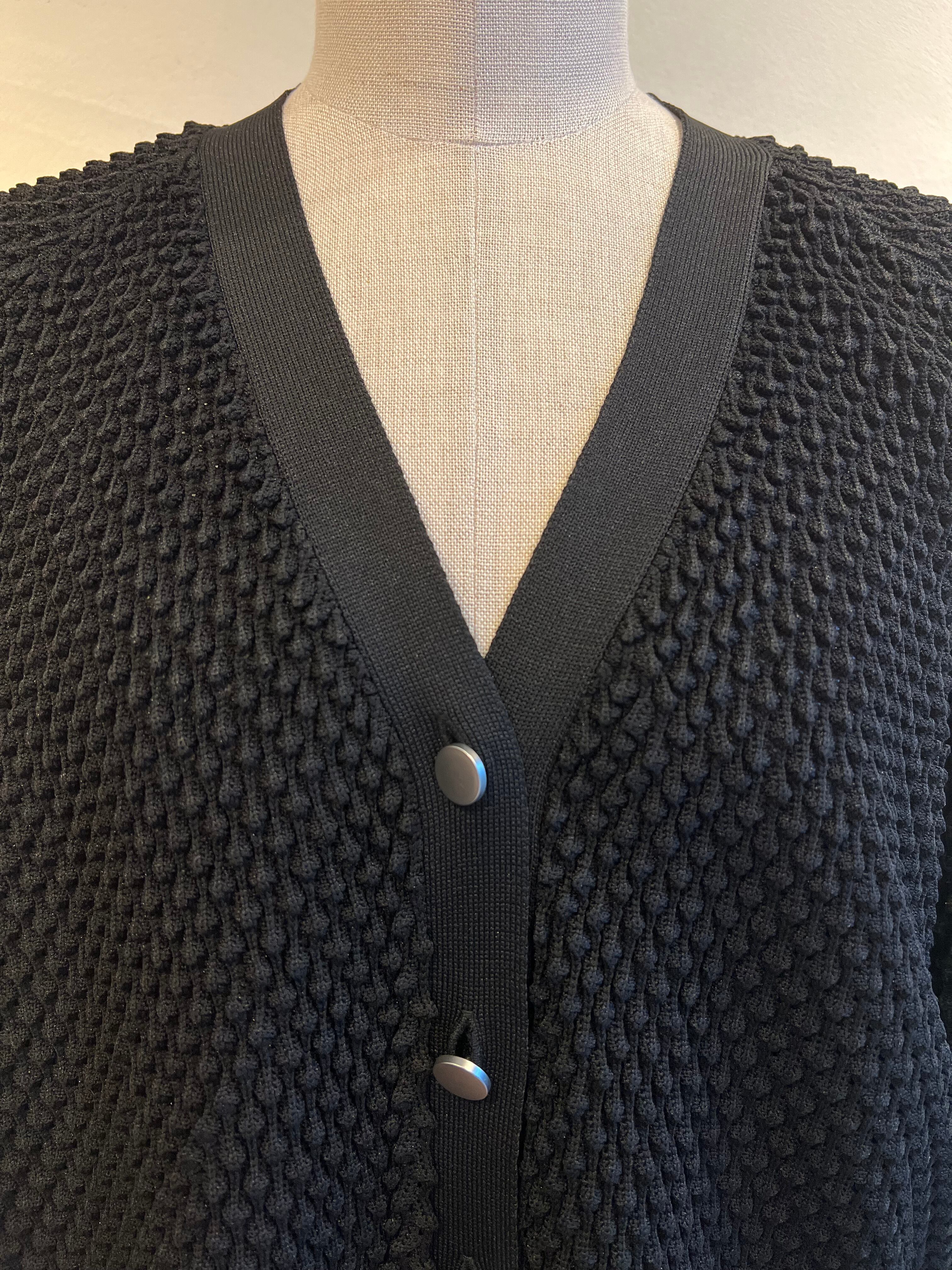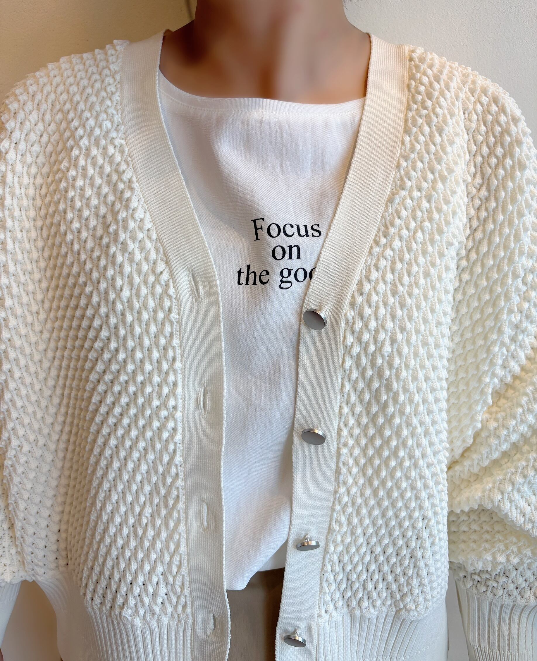 袖口、裾のリブは編み目が異なりこだわりを感じます。素材がポリエステルなので、軽くてシワになりにくく、毛玉もできにくく、手洗いも可能と優秀なカーディガンです。