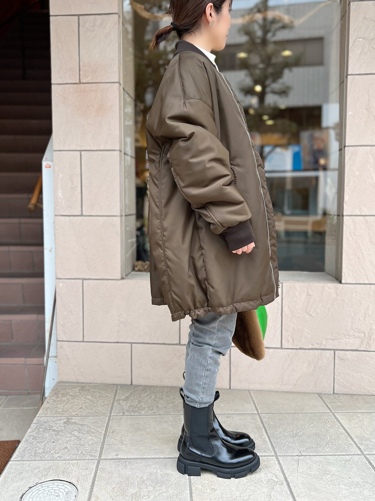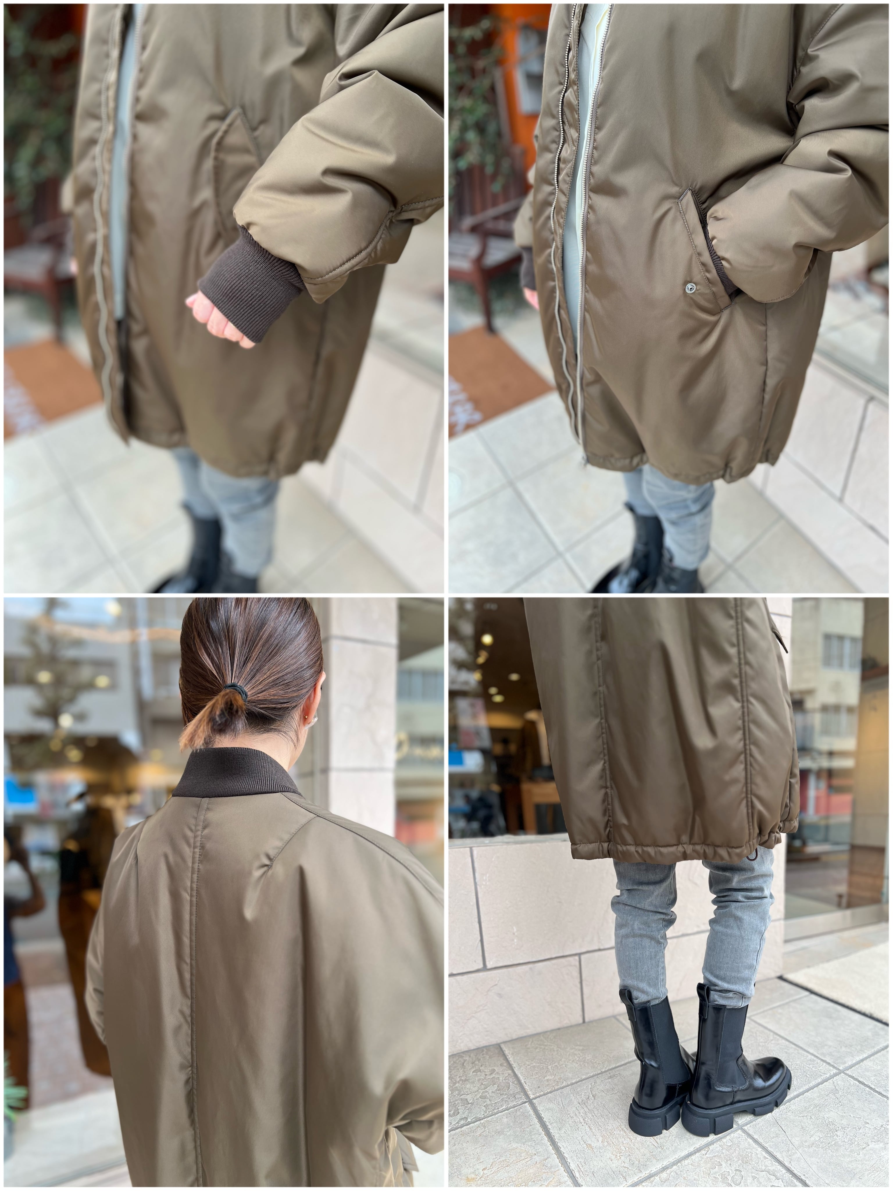 やや長めのチュニック丈が特徴のMA-1は、どんなトップスとも好相性。裾のコードを絞ってコクーンシルエットにすれば、よりモードな印象に。リラックス感のある着心地ながら、大人のきれいめカジュアルを叶える一枚です。パンツスタイルにもスカートにも合わせやすく、端境期の軽やかな羽織として活躍します。