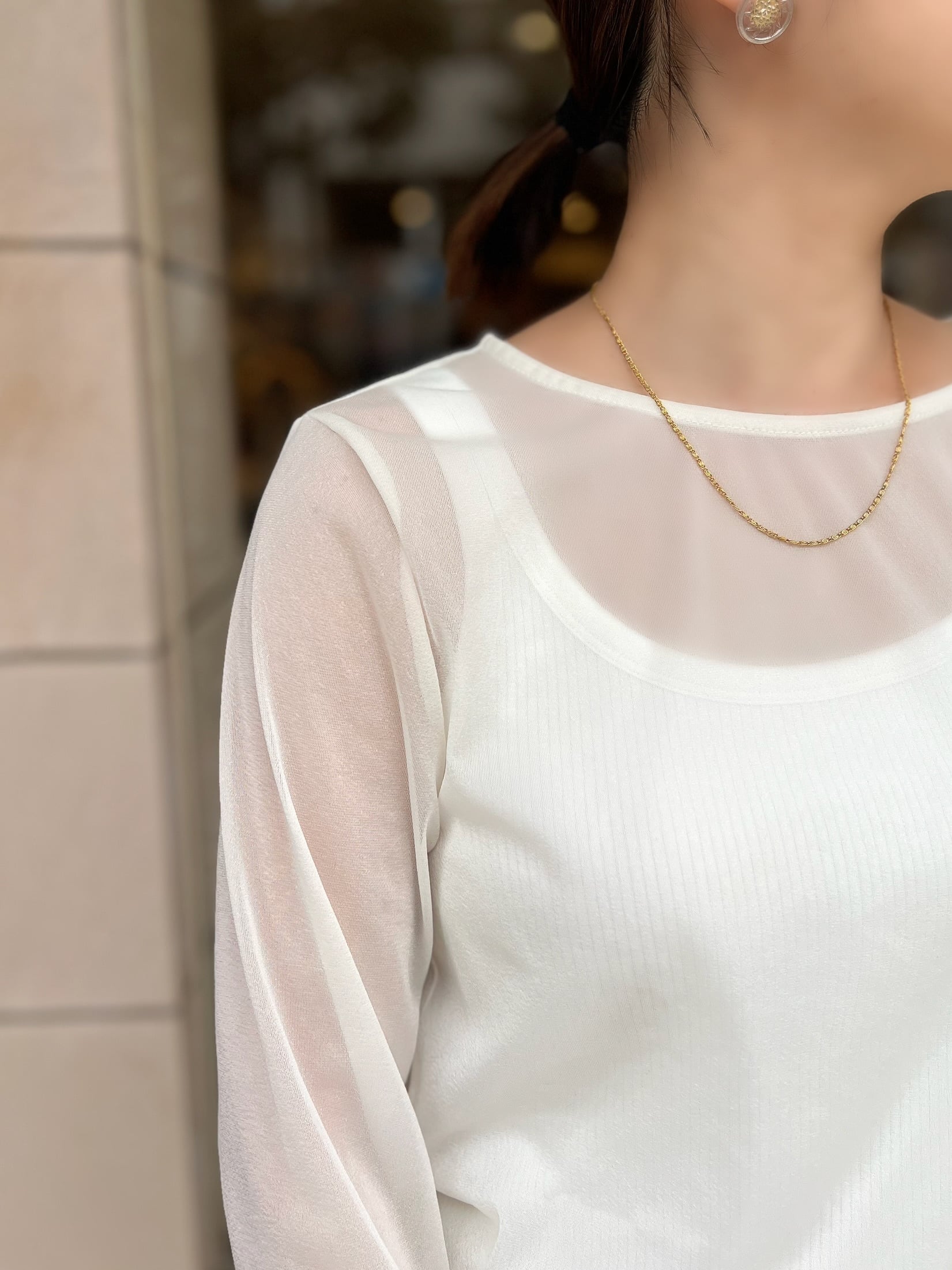 窮屈感のないストレスフリーな着心地なので、程よい透け感がスタイリングに抜け感を与え、キャミソールやワンピースとのレイヤードスタイルにぴったり。
