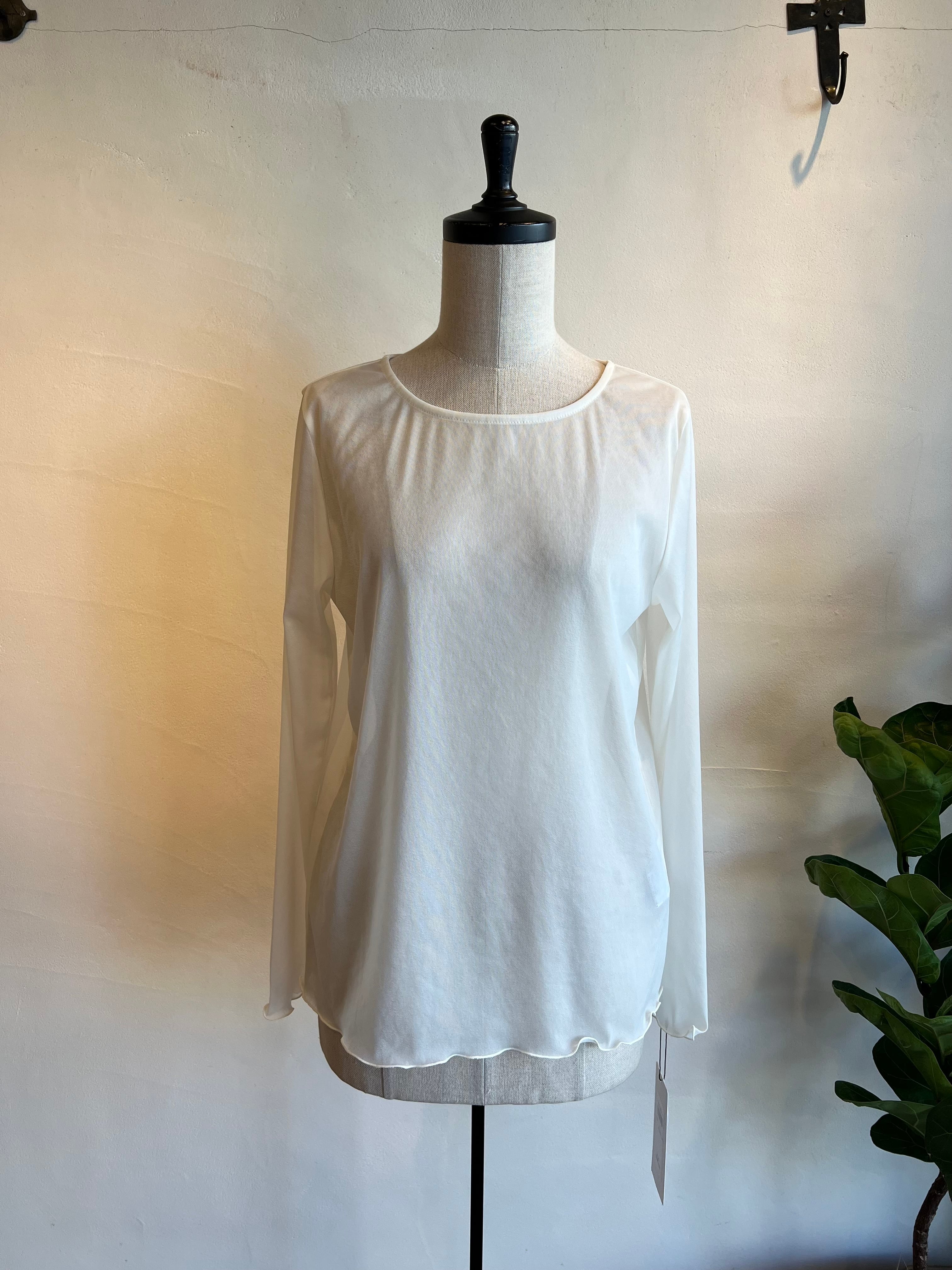 やかな透け感が魅力のトリコットシフォン素材を使用したクルーネックトップス。