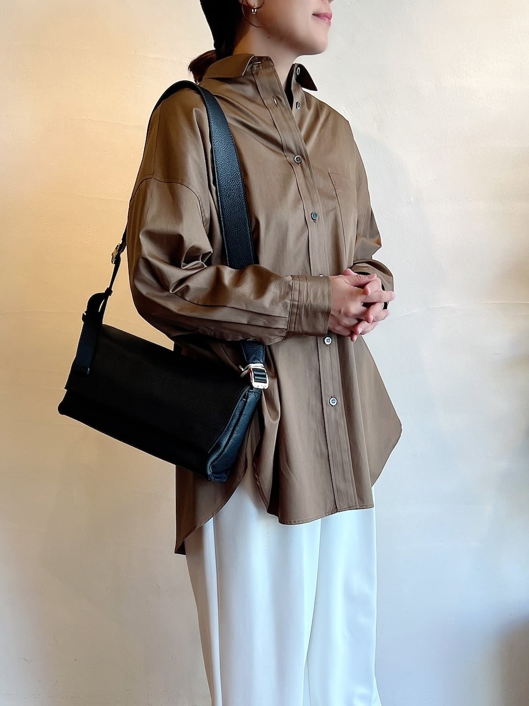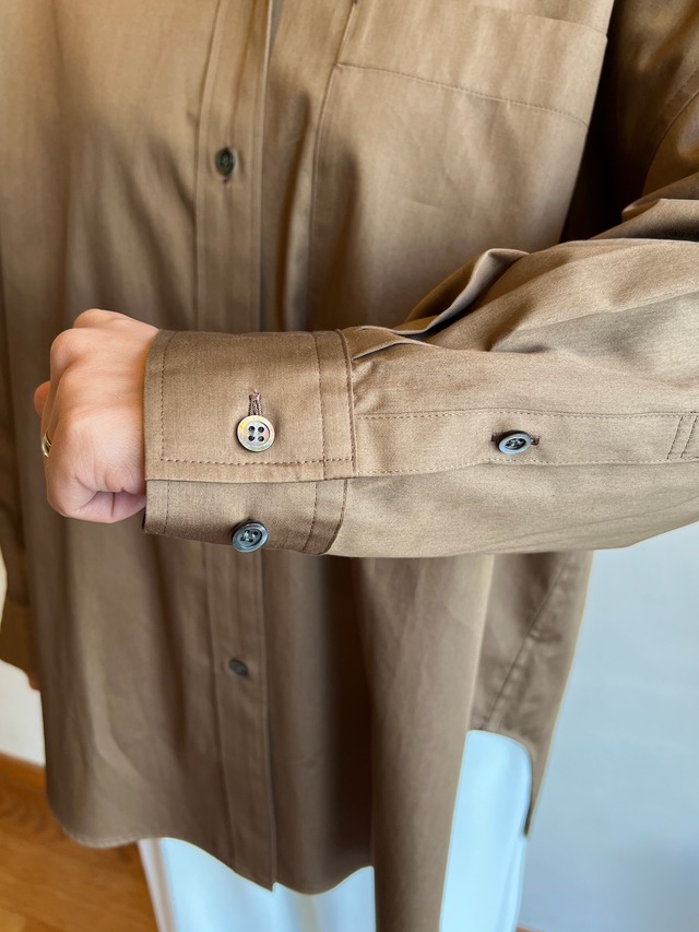 トルコの名門シャツ地メーカーSOKTAS社に別注したコットンポプリン素材のオーバーサイズシャツ。良質な原綿を使用した細番手高密度のきめ細やかでハリのある素材感が特徴。秋を感じさせる深みのある色合いが魅力です。オーバーシャツ感覚でデザインされたシルエットから生み出されるニュアンス感がマニッシュな雰囲気を醸し出します。シャツとしてはもちろん、軽めの羽織りとしても活躍する着回し抜群の一着です。