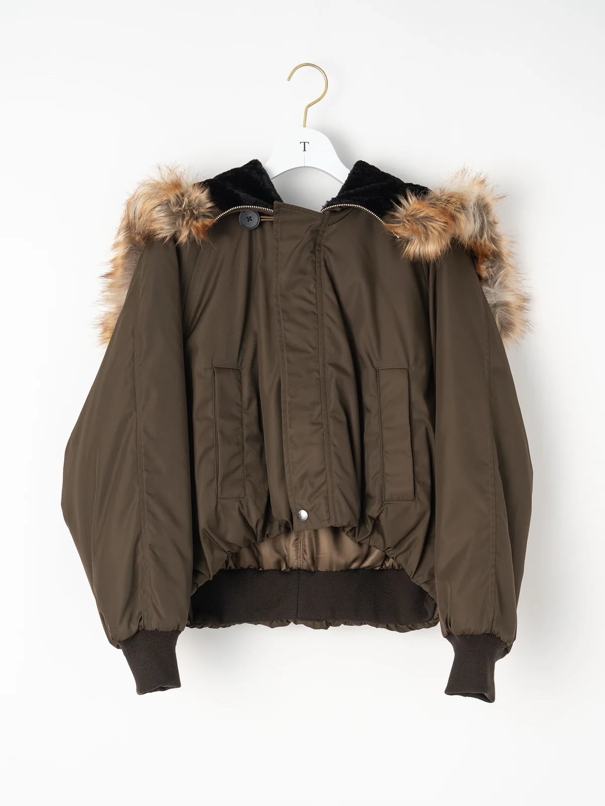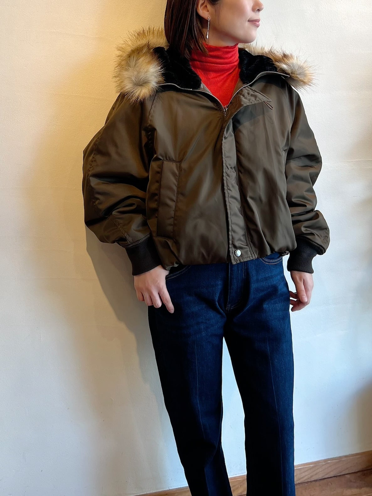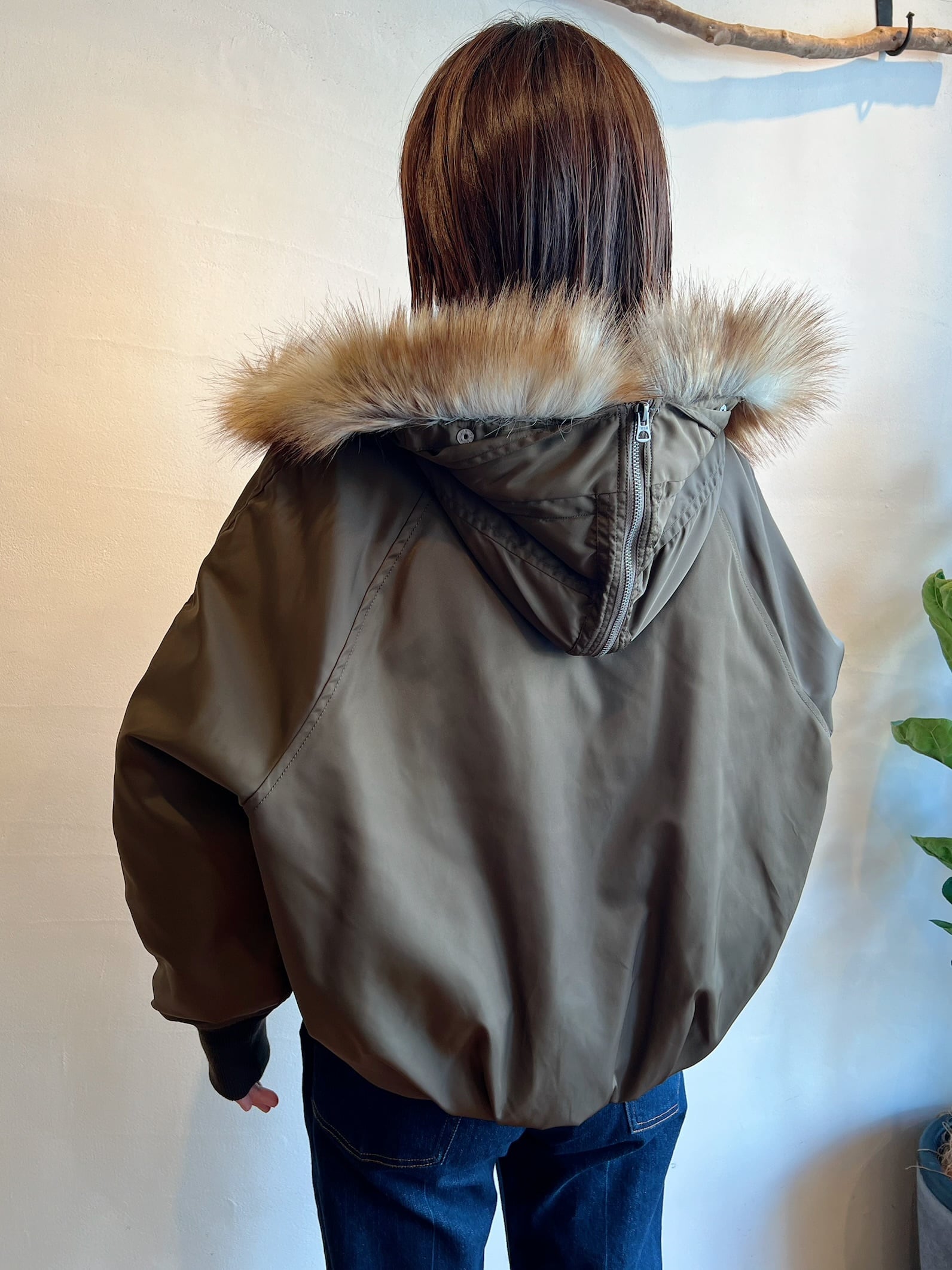 ミリタリーアイテムであるN2-Bのディティールを取り入れたブルゾン。コンパクトな丈感とボリュームのあるシルエットがポイント。ボリュームネックでファーが首元を優しく包み込み、ファスナーでフードの形を変えることができます。カジュアルなデニムスタイルからワイドパンツ、華やかなスカートなどの、外しアイテムとしても活躍する一枚です。