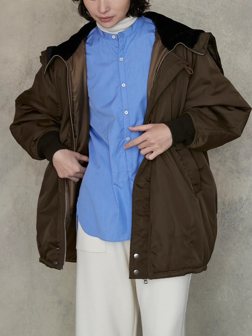 防寒性に優れたN-2BをTICCAらしくアレンジした、ロング丈のモダンなアウター。程よいボリューム感がありながらも軽やかな着心地で、真冬のアウターとしても活躍。