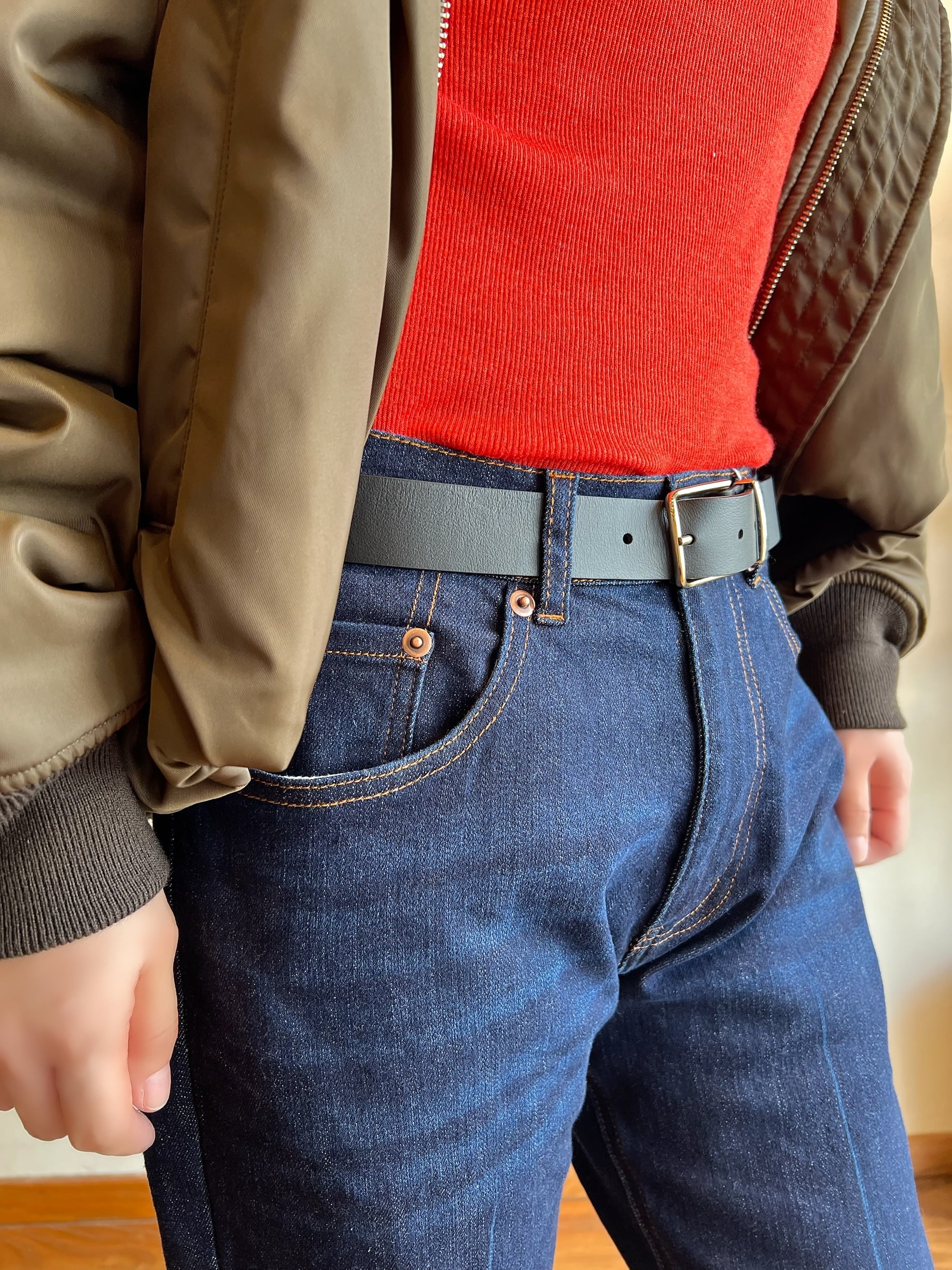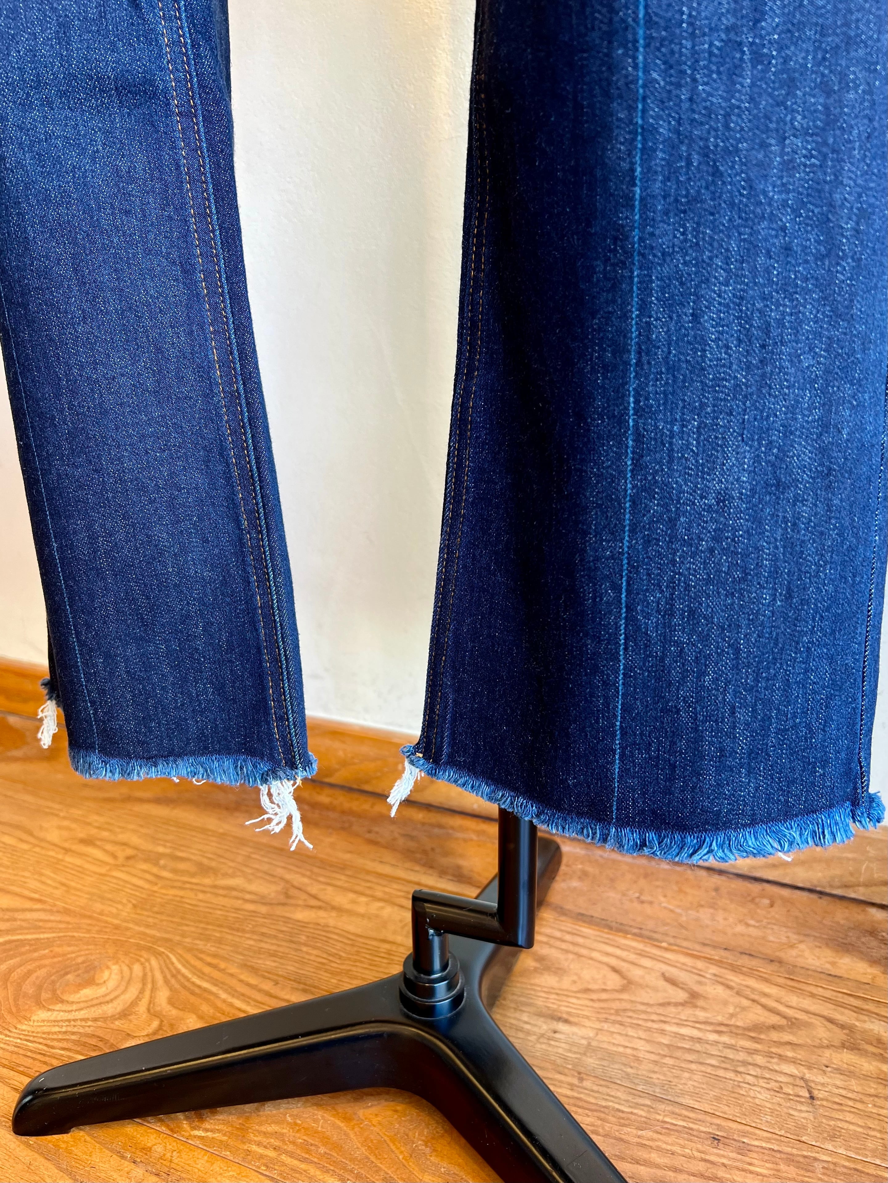 程よい裾フレアシルエットで、美脚効果抜群のデニムです。腰回りはスッキリしていますが、ストレッチが効いているので穿き心地も良いです。フロントに細いセンターラインが施されており、縦のIラインを強調してくれます。裾のフリンジ加工、大きく入ったパッチもポイントです。