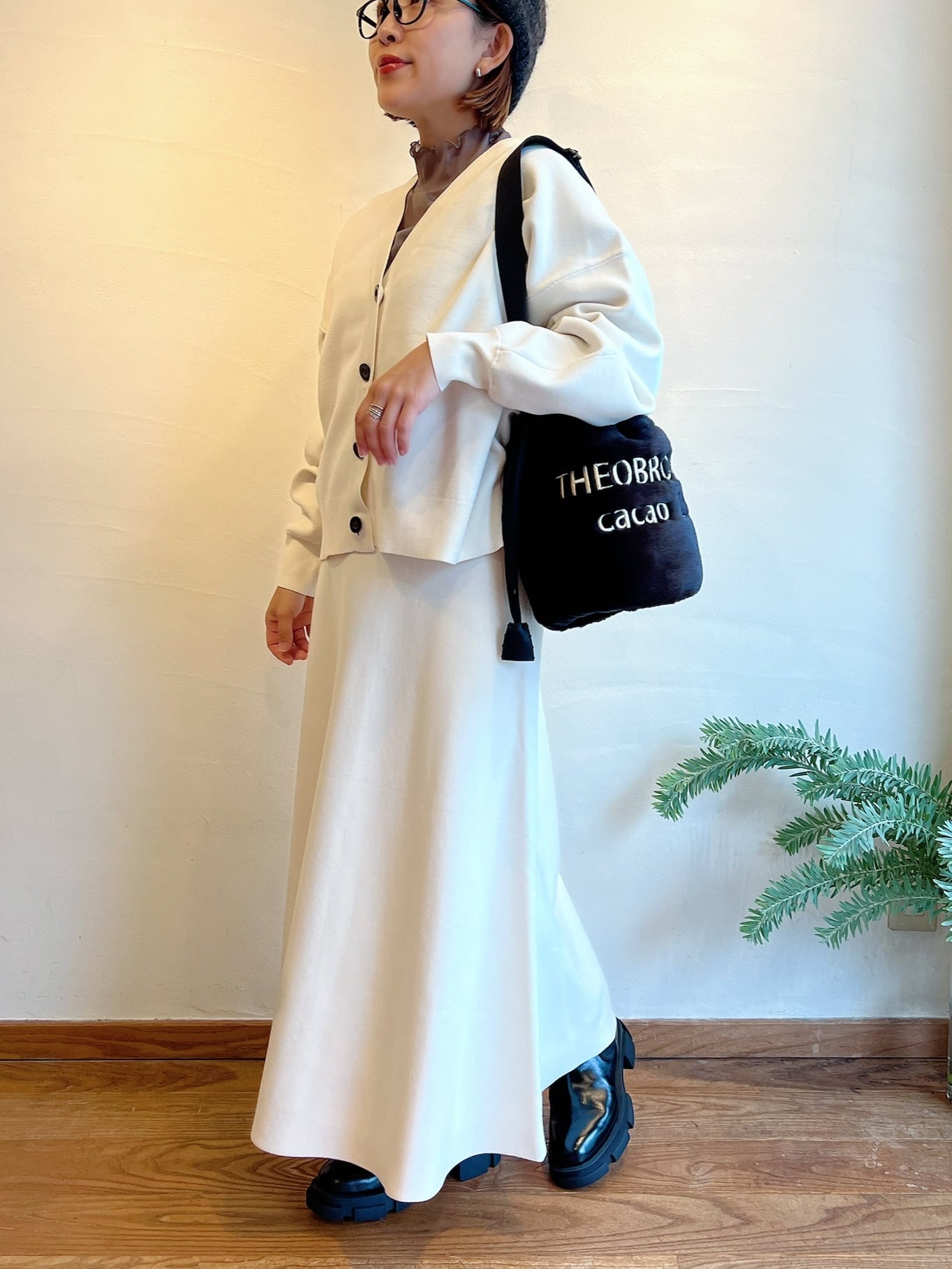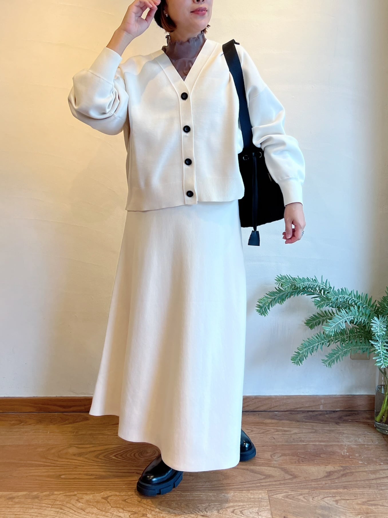 同素材展開のプルオーバーとスカートと素材をまとめすっきりとした今っぽいスタイリングも◎