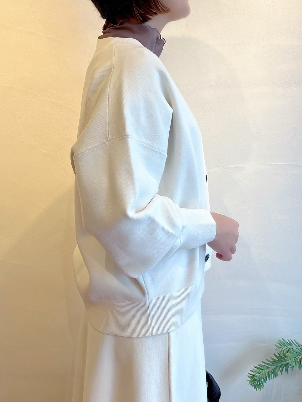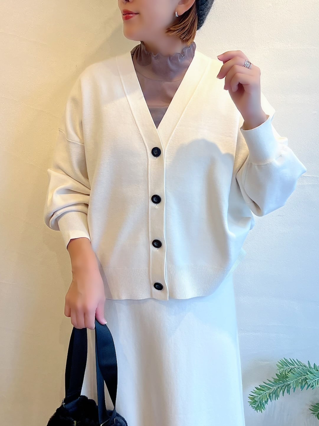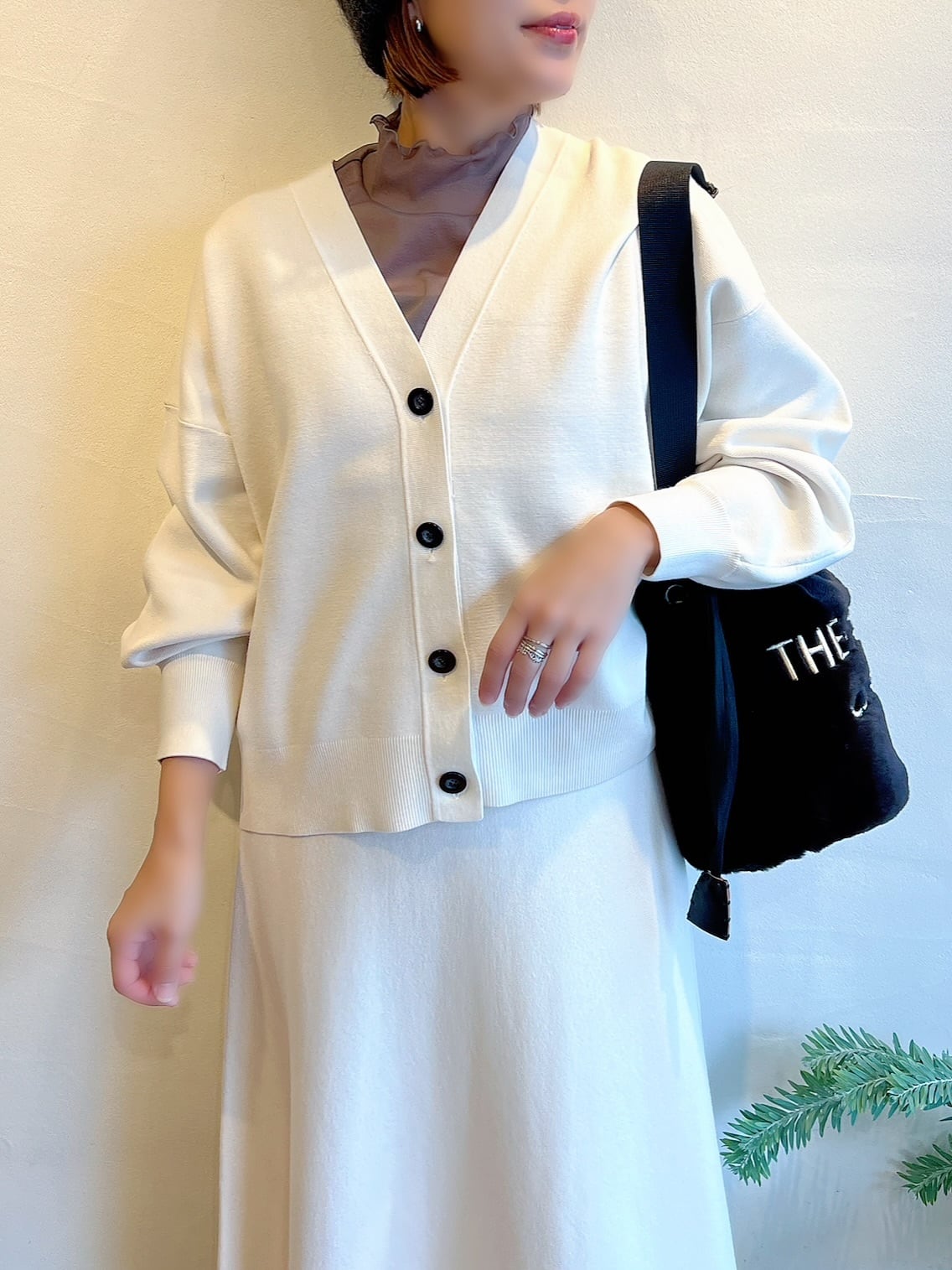ゆるっとした身幅に、短めの着丈のミラノリブ編みVネックカーディガン。広めにとったアームホールで、重ね着もストレスなく楽しめる一枚です。袖口の立体感あるシルエットもポイント。カットソーのような安定感あるストレッチ糸を使用。目の詰まった編み地のきれいさがあります。