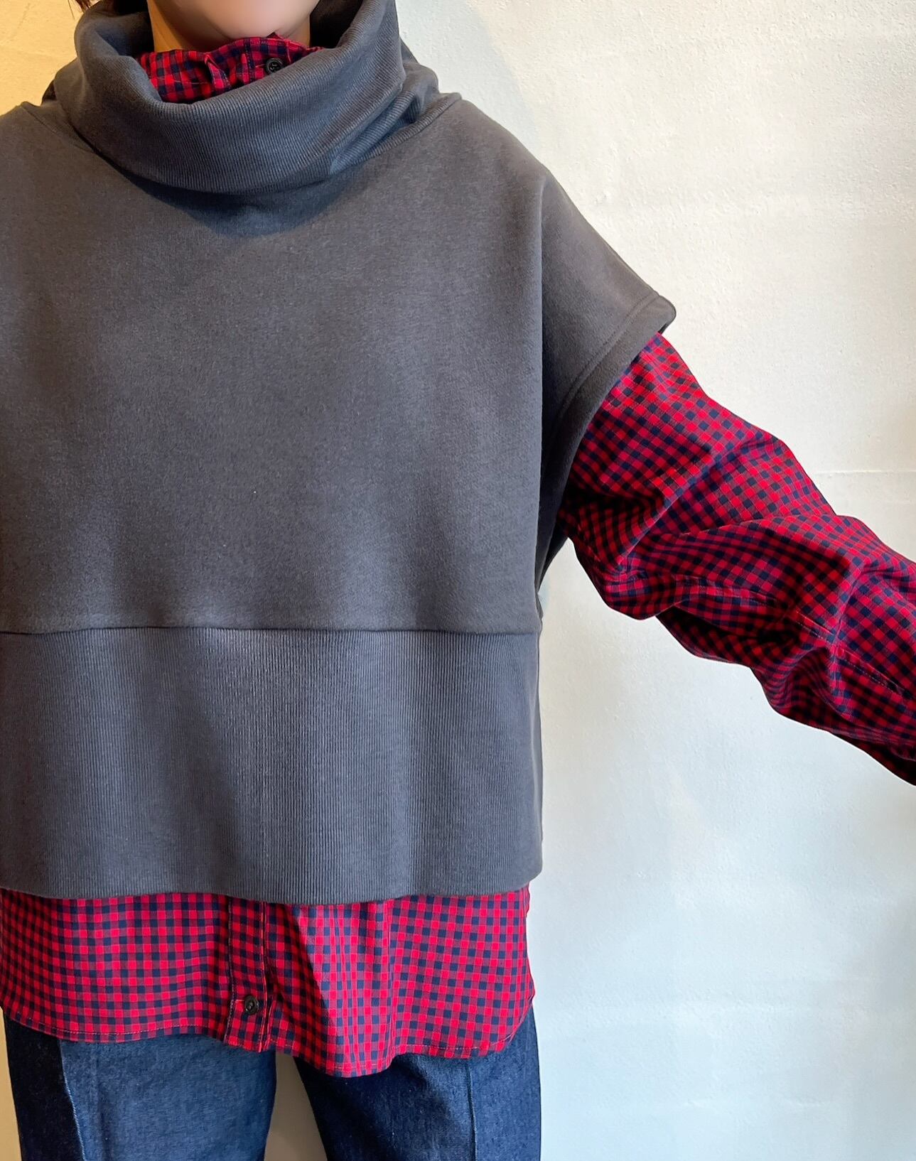 驚くほどソフトで軽くそれでいてしっかりとしたリヨセル混の裏起毛素材を使用。昨年から根強い人気で今年もリピートしています。ケープのように着用できる、オフタートルジレです。秋口のトレンチや、ステンカラーコートなどの薄手のアウターの上からでも着用可能です。もちろん、シャツや、長袖カットソーなどの上にも。