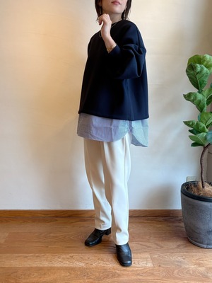 シャツを重ね着したような布帛とドッキングしたプルオーバー。一枚でコーディネートが完結する便利なアイテムです。ダンボール素材を柔らかさがありながらも程よくハリ感のあるものに変更し、より袖に立体感をもたせたデザインに仕上げました。楽な着心地ながらも、ハリのあるダンボール素材を使用することできれい見えします。スポンジを挟み込んだように崇高で、かつ軽さが特徴のダンボール素材。キックバックのよさも魅力です。