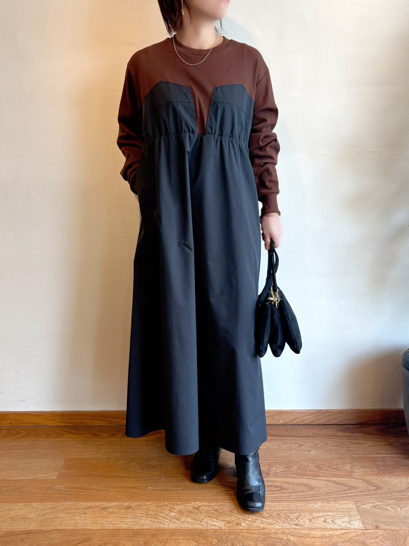 カットソー部分は、肌当たりの柔らかなリブを使用。ドレス部分は、軽やかで表面感のあるポリエステル素材を使用。エレガントでシワも目立ちにくく、ご家庭でも手洗いが可能なイージーケアなのもうれしいポイントです。ビスチェのような切替デザインで、ウエストは自然に細見えするよう、スタイルアップできる形に仕上げています。裾に掛けて広がるAラインのスカートは歩く度にゆれる女性らしいシルエット。背中部分は見た目にもかわいいシャーリングのゴム使いになっているので、着用時も締め付けられすぎず、着心地のいい仕上がりになっております。配色のステッチワークがアクセントを加えてくれます。