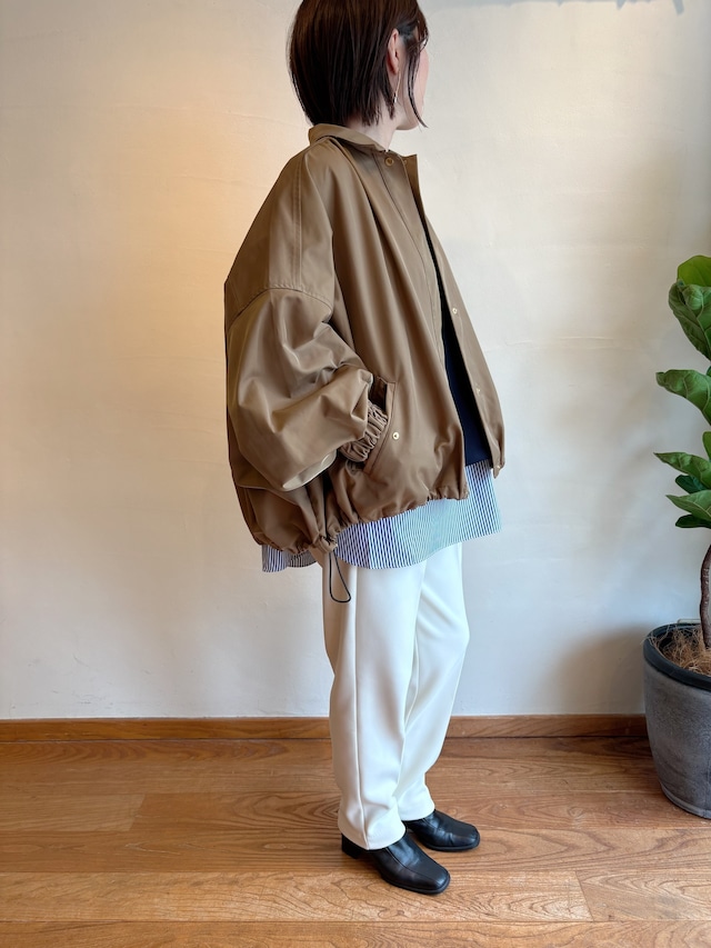 軽く柔らかいポリツイルを使用したミリタリー風ショートブルゾン。オーバーシルエットに仕上げ、抜け感のあるリラックスした雰囲気を演出します。裾のドロストで好みのボリューム感に。スカートやワンピースと合わせてフェミニンに、パンツと合わせてカジュアルにと、幅広いスタイリングで活躍する万能アウターです。シワになりにくく、程良い軽さと張りのある上品な生地感。