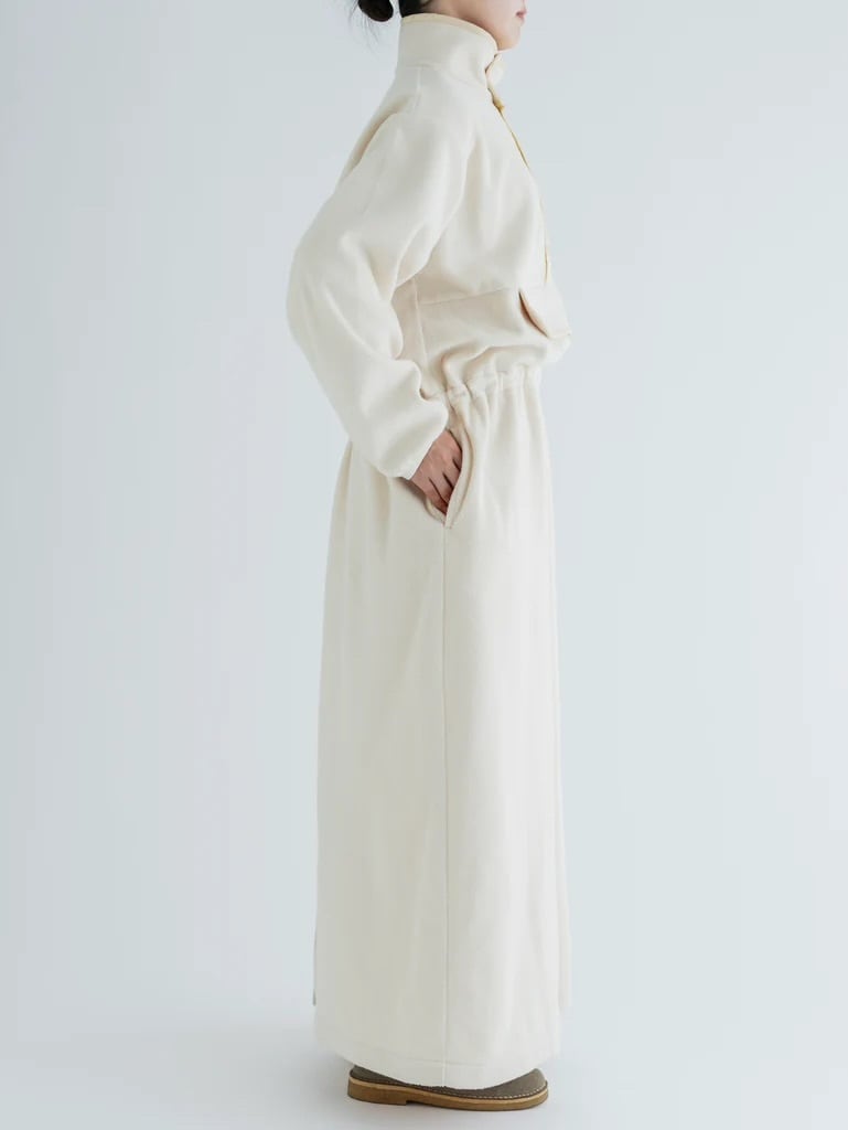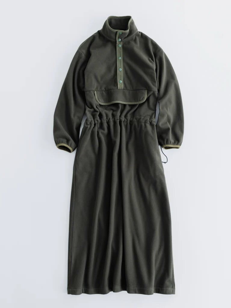 アウター感覚で着られるフリースのワンピース。軽くて暖かくて着心地が滑らかなフリースに全身を包み込まれる安心感はたまりません。配色にしたパイピングがフリースの柔らかな印象の中にシャープさを加え、カジュアルさと上品さがちょうどいいバランスに収まっています。気候やシチュエーションに合わせて色々な着方を楽しめます。比較的暖かい時期はロンTとタイツやレギンスと合わせるのがおすすめです。寒くなってきたら中にスエットやニットやタートルなどを着て、パンツも履けば防寒仕様のスタイリングが完成。ウエストについたドローコードでブラウジングすることで丈を調節可能。フロントのスナップボタンの開け具合、閉め具合で印象が変わります。サイドポケットがついているのも嬉しいポイント。(フロントのフラップポケットはデザインです)