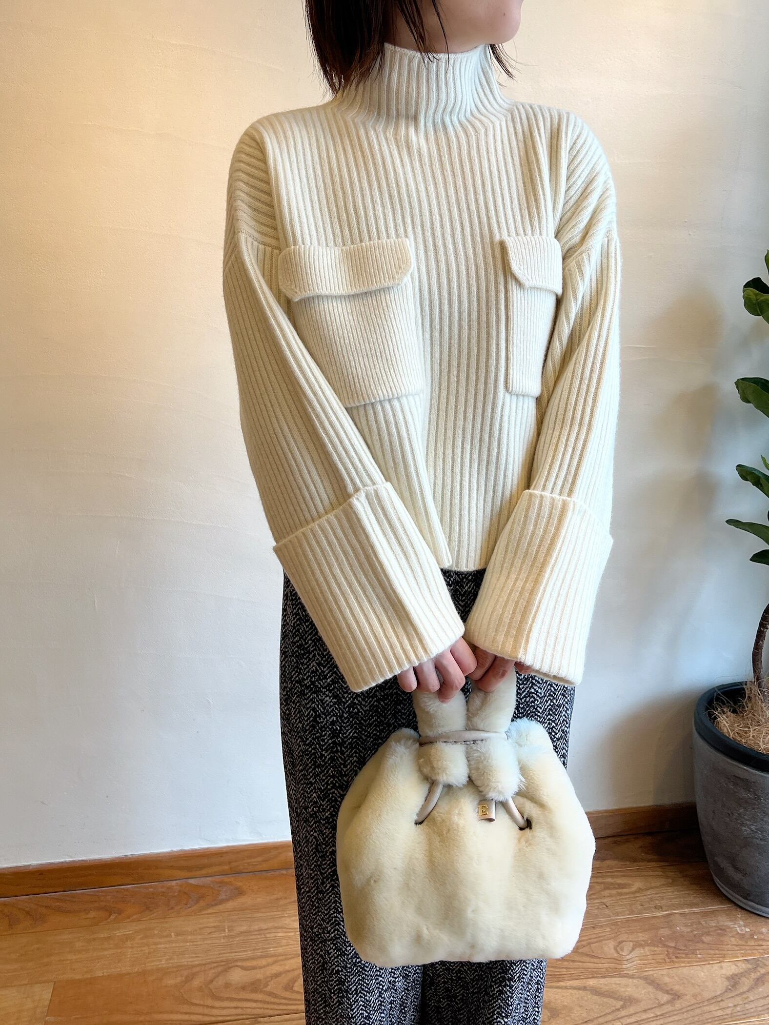 SOLD OUT 膨らみと柔らかさが特徴の上質なラムウールを使用したリブニットプルオーバー。フロントのフラップ付きパッチポケットディテールと長めのワイドカフスのロングスリーブがポイント。絶妙なクロップド丈で様々なボトムと好相性な幅広く活躍する一着です。